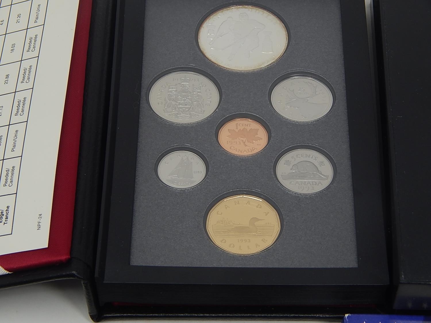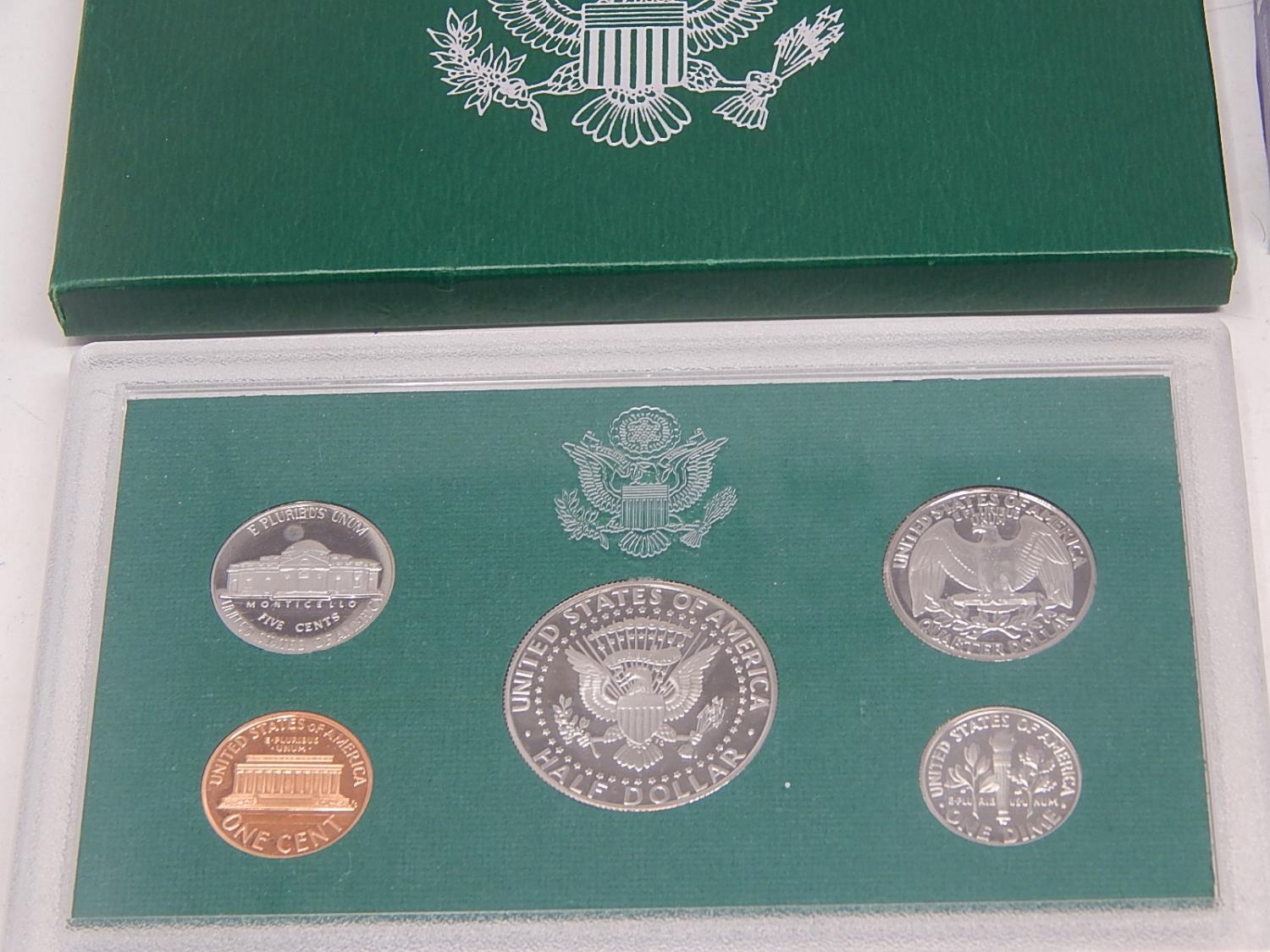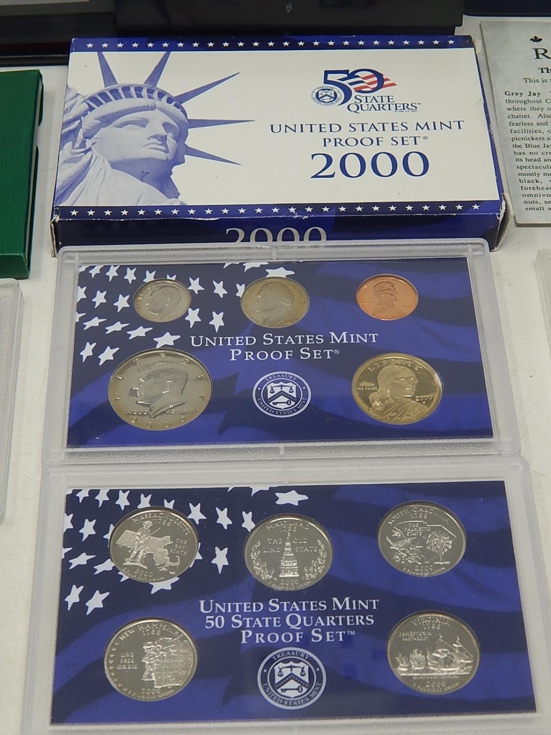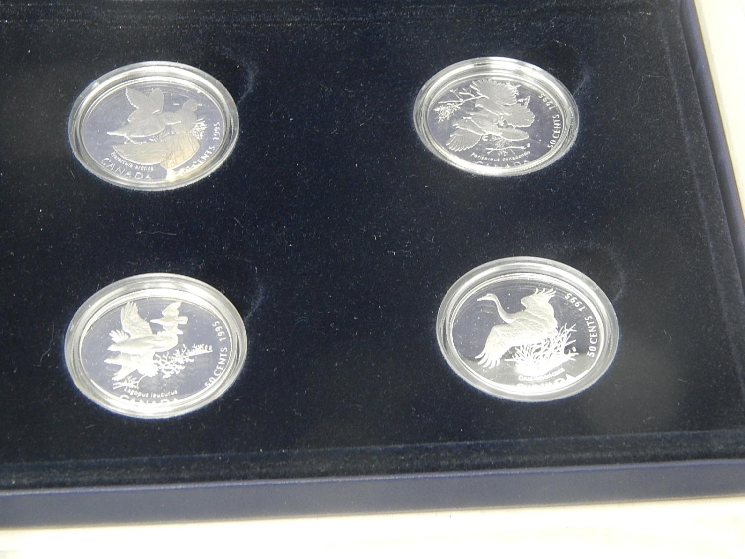 USA Proof Set 1995; USA Proof Set 2000; Royal Canadian Mint birds Solid Silver Coin Collection in case with COA; Canada 1993 Proof Set including silver Dollar; Pope John Paul II Medal approved by the British Roman Catholic Church in case and a 1982 George Washington Silver Half Dollar in case all about as struck