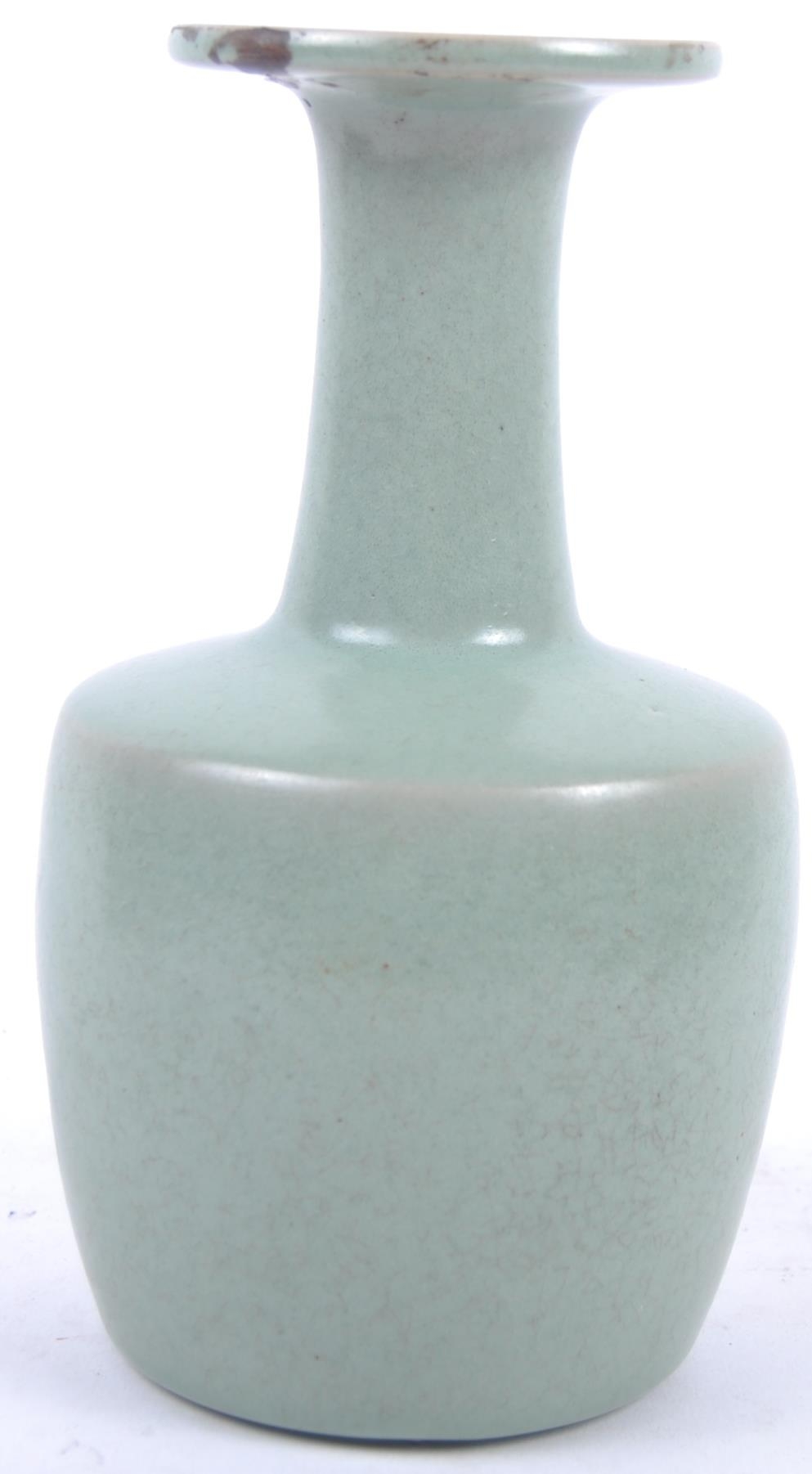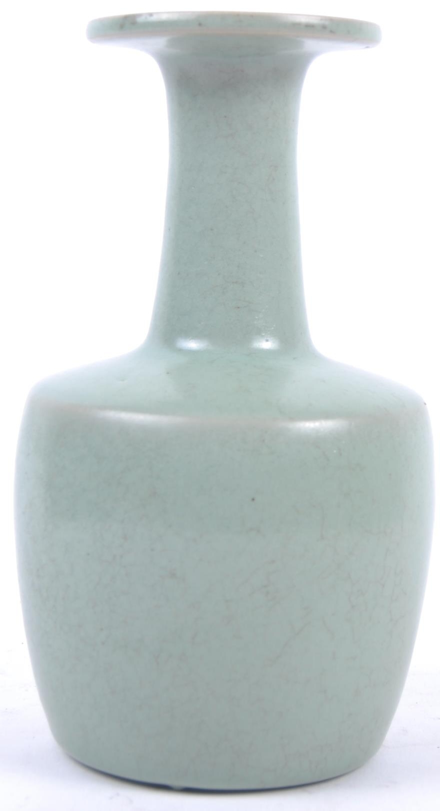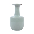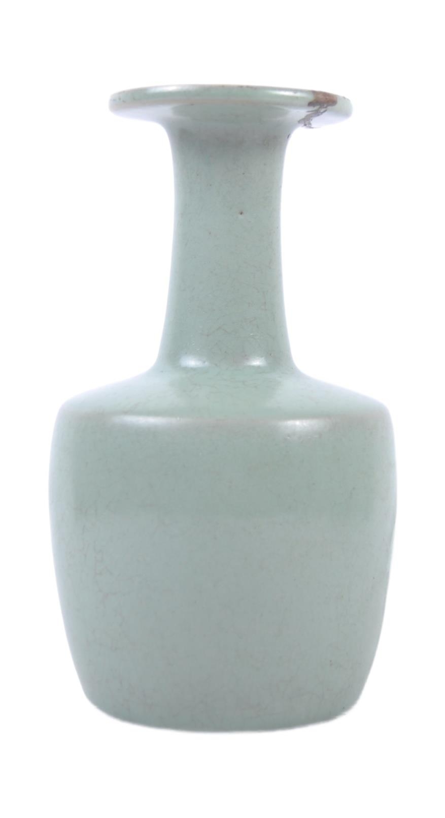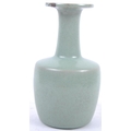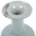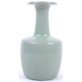 A Chinese Longquan Celadon green glazed crackle bottle vase. Flared rim to top with elegant slender neck leading to mallet shaped base. Measures approx; 22cm tall. Repair to rim.