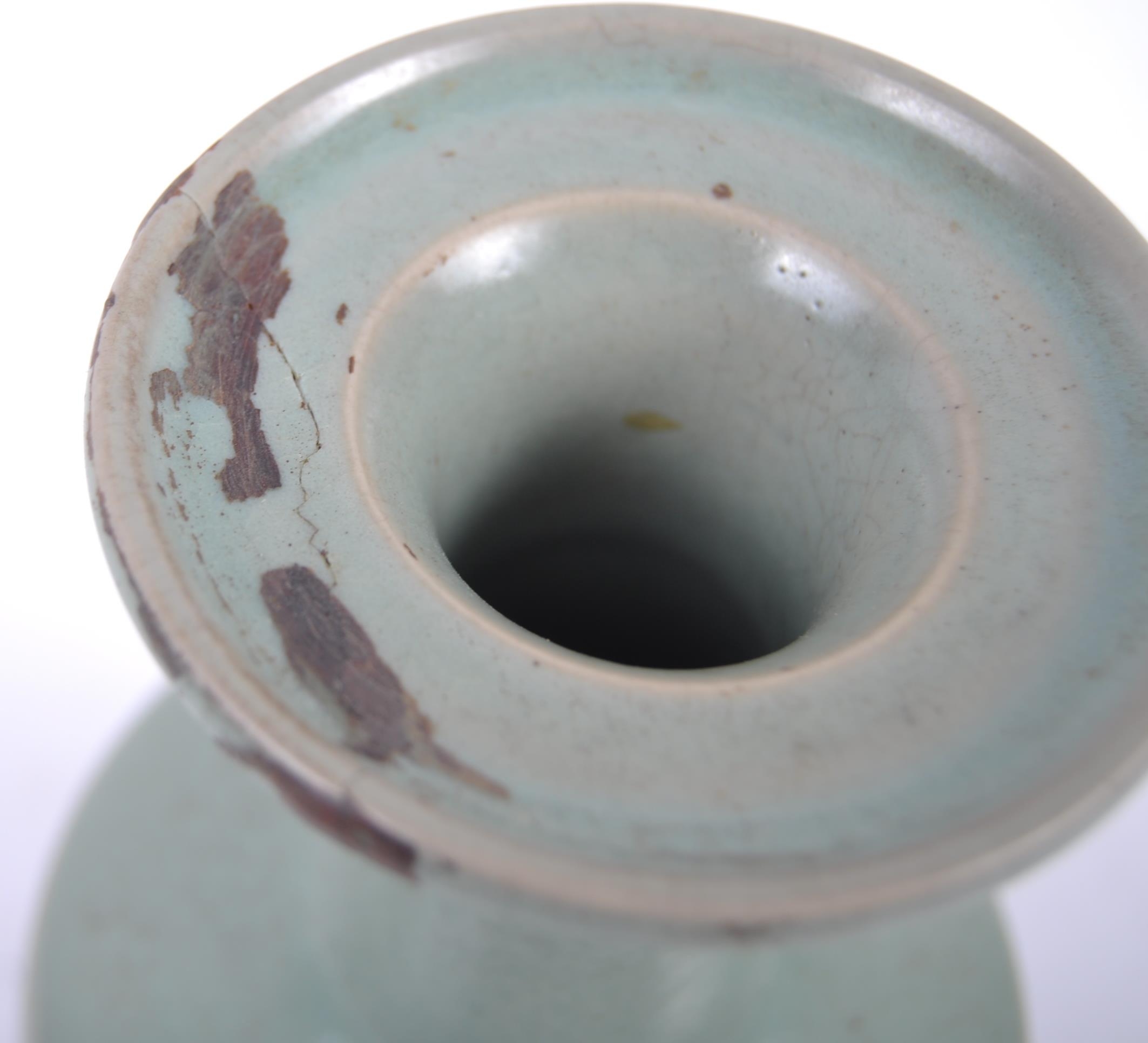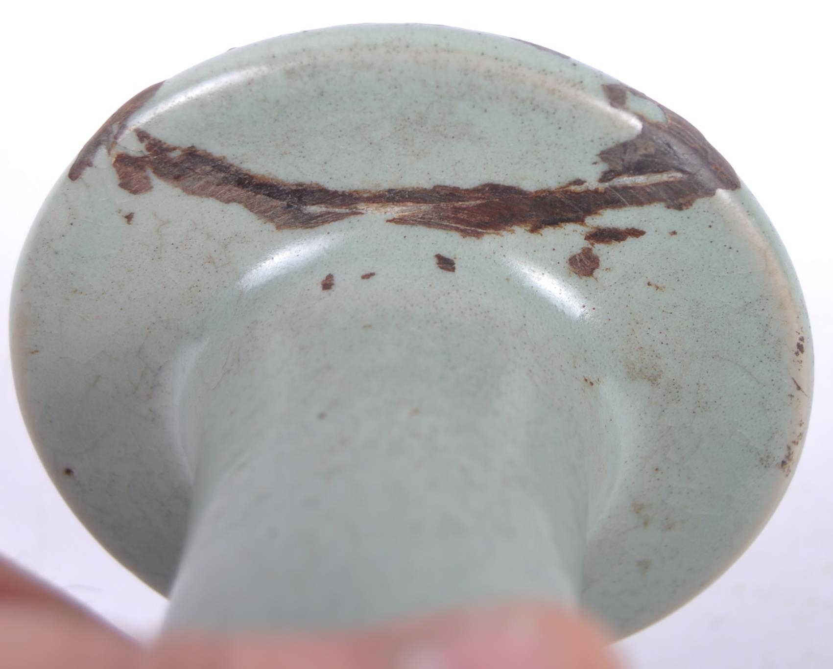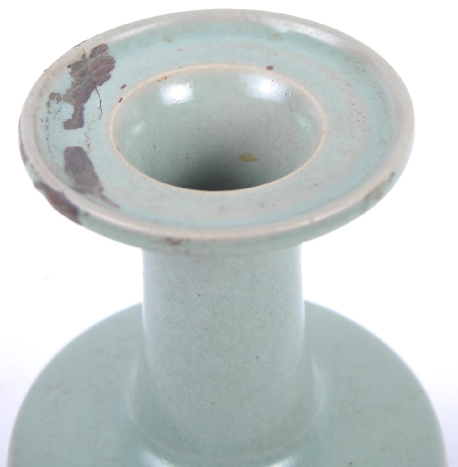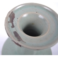 A Chinese Longquan Celadon green glazed crackle bottle vase. Flared rim to top with elegant slender neck leading to mallet shaped base. Measures approx; 22cm tall. Repair to rim.