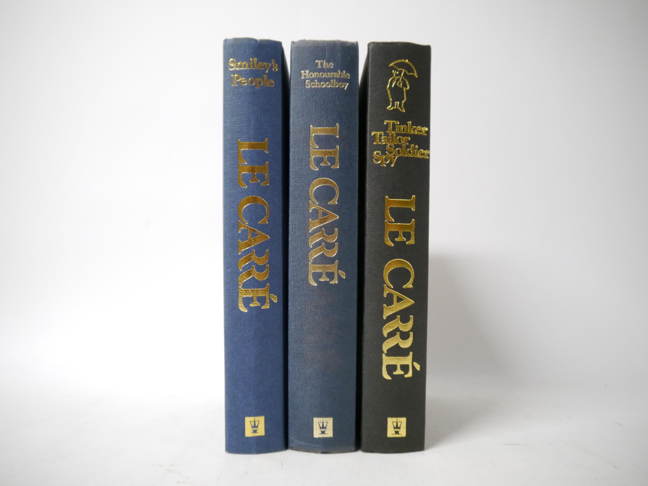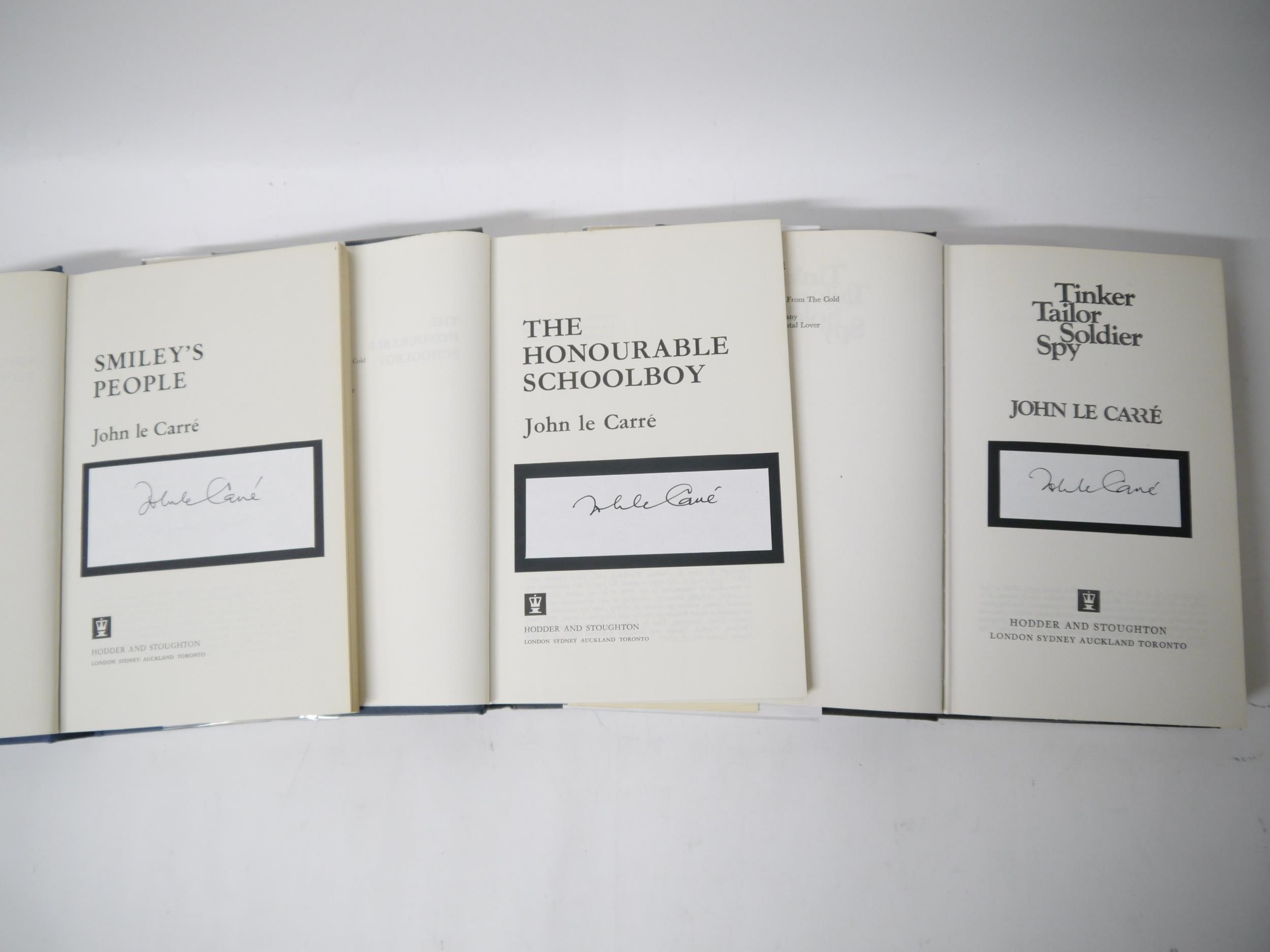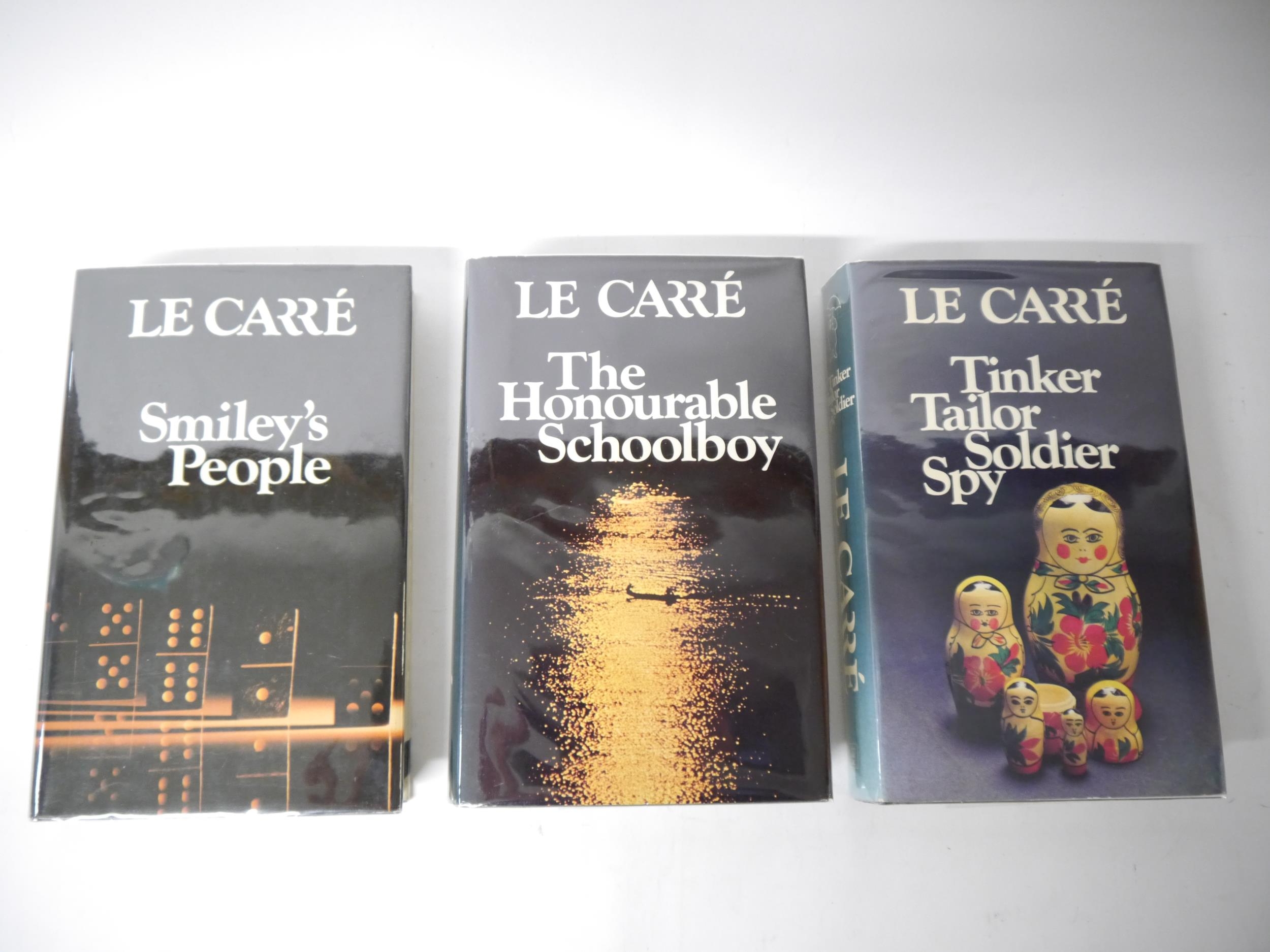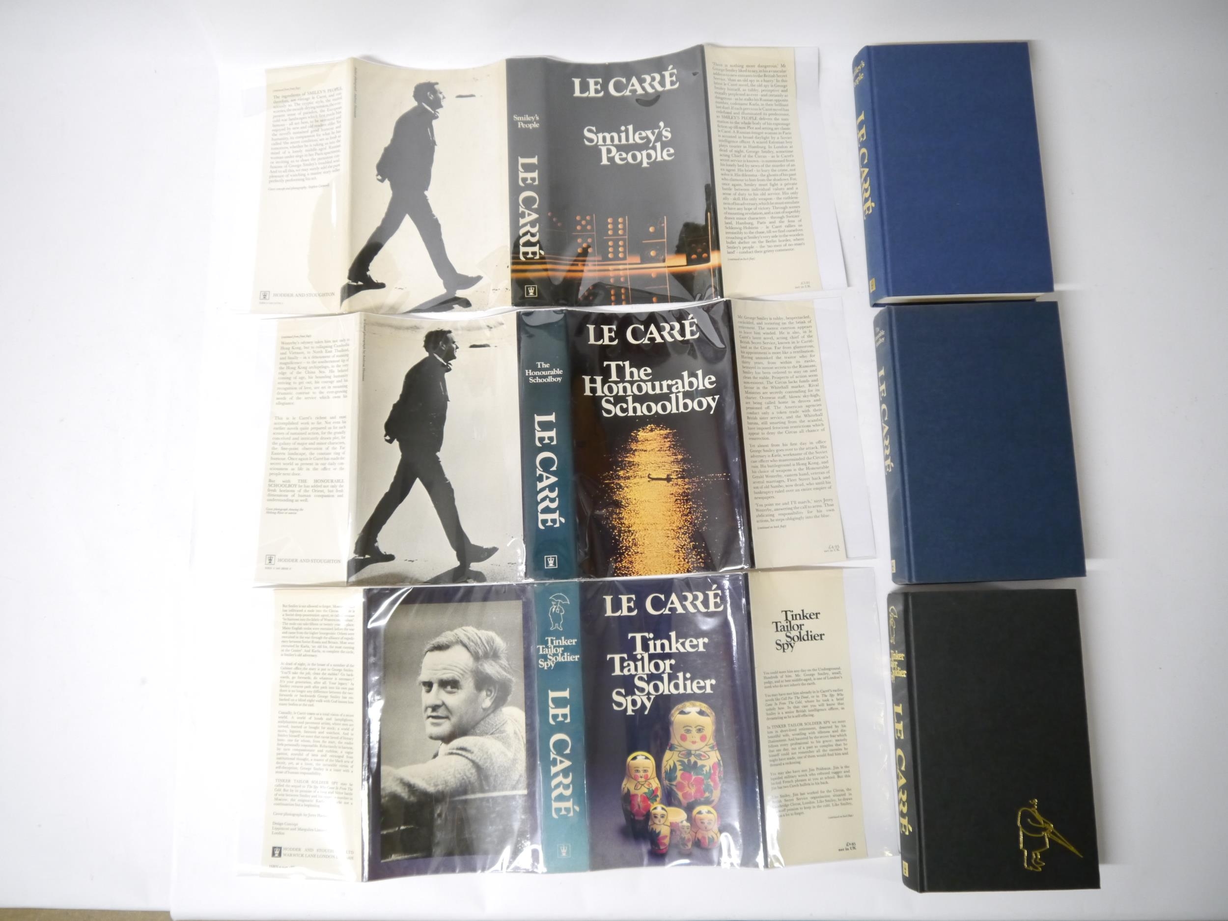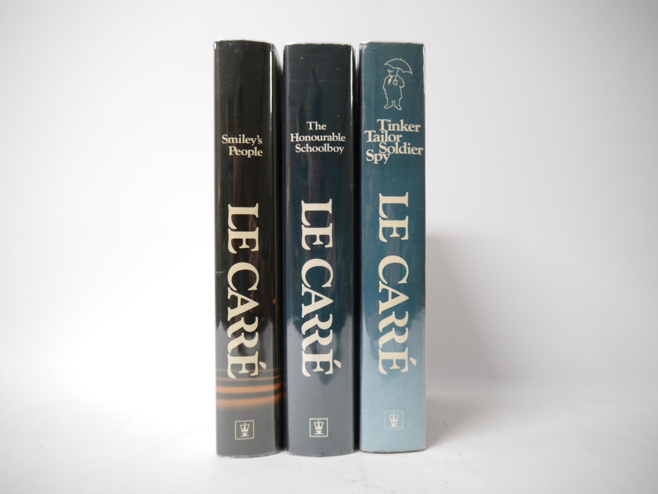John Le Carré: '[The Karla Trilogy]: Tinker Tailor Soldier Spy; The Honourable Schoolboy; Smiley's People', London, Hodder & Stoughton, 1974, 1977, 1980, 1st editions, all with signed pieces mounted to title pages, 3 volumes, all original cloth gilt, all in dust wrappers with prices intact, all in collectable condition. An excellent signed set of le Carre's classic spy trilogy (3)