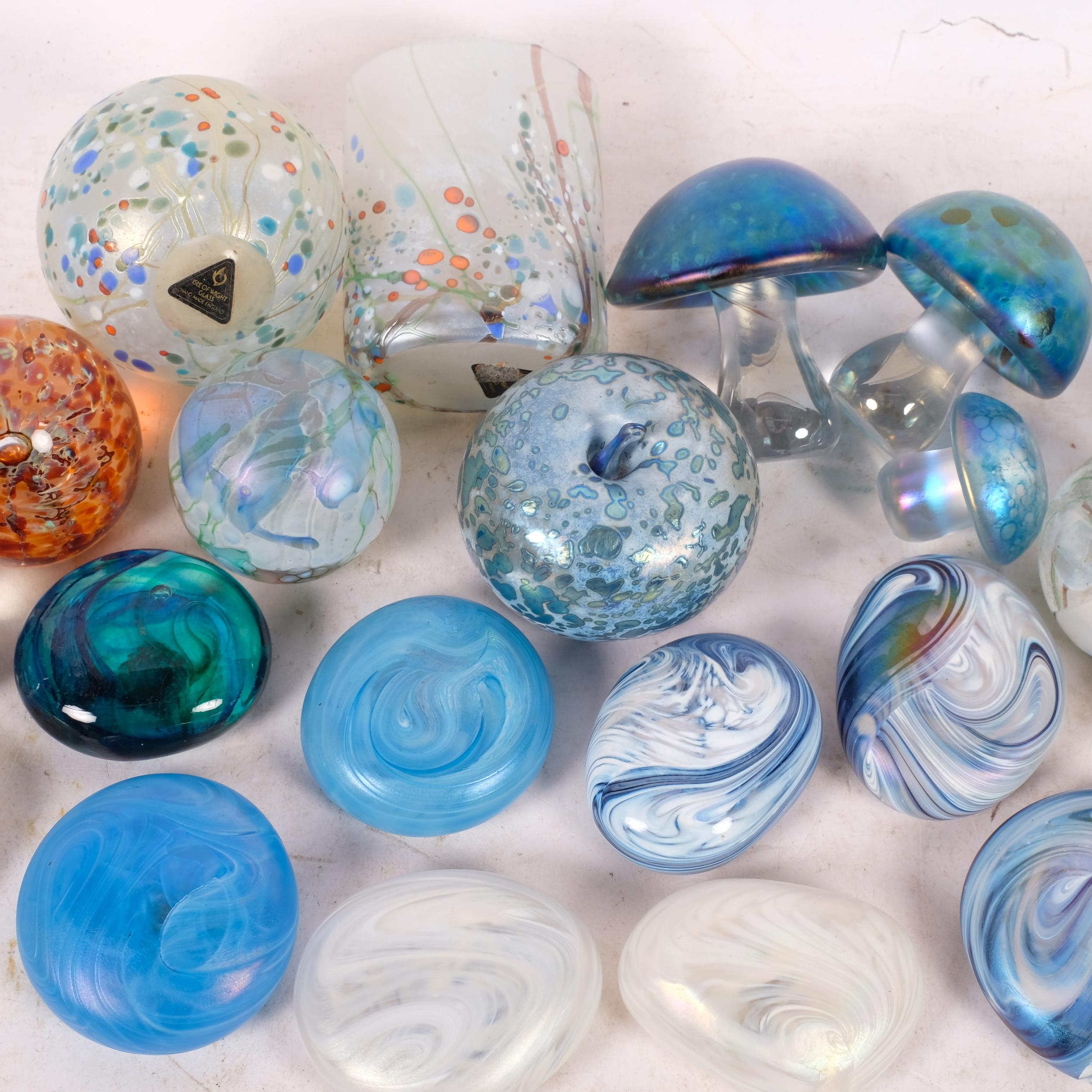A collection of various glass and lustre finish paperweights, including Isle of Wight, Caithness, etc, designs including mushroom and pebble