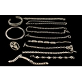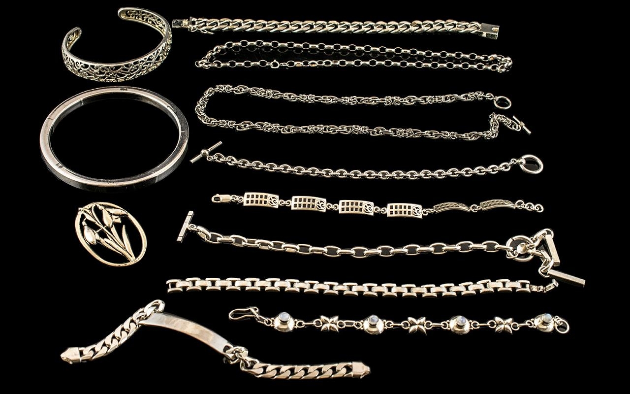 Excellent Collection of Vintage Sterling Silver Jewellery Items ( 12 ) Hallmarked Pieces, All In Excellent Condition, Includes Assorted Bracelets, Bangles, Chains and Brooches - All Different Designs and Shapes, At Very Low Estimate. Silver Weight 241.2 grams.