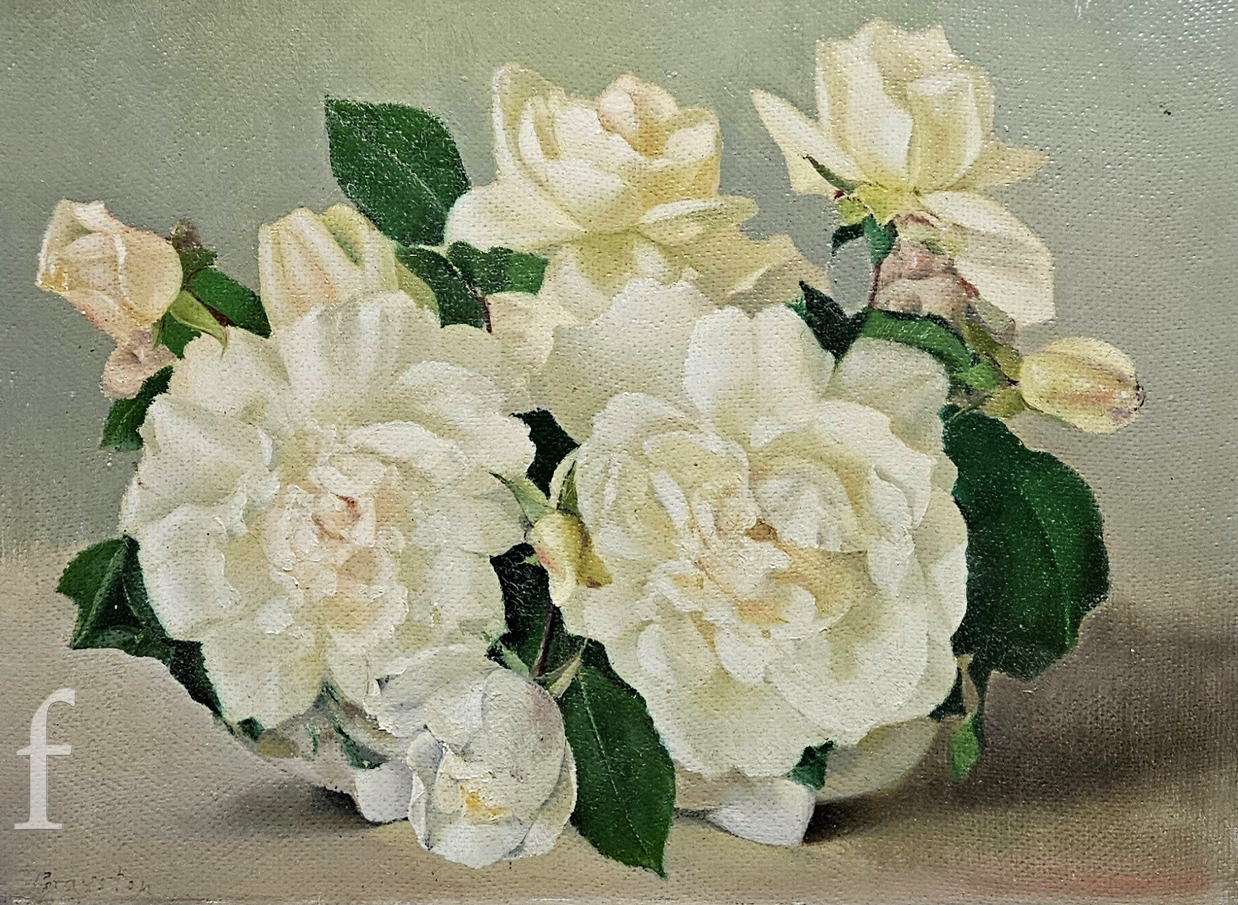 W. Grayston (Mid 20th Century) - A study of white roses, oil on board, signed, framed, 31cm x 41cm, frame size 43cm x 53cm, also two comical canine prints, one signed in pencil. (3)
