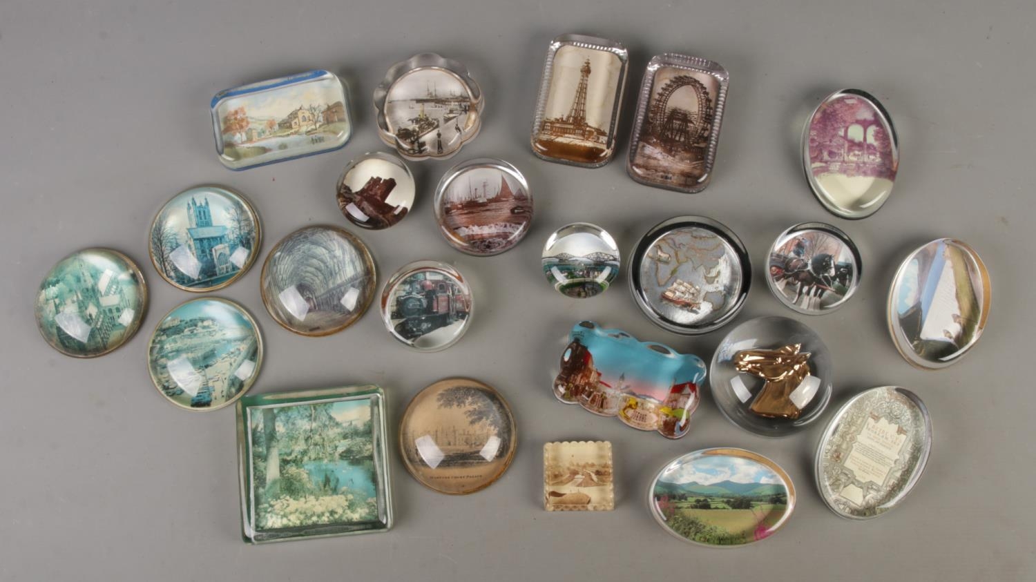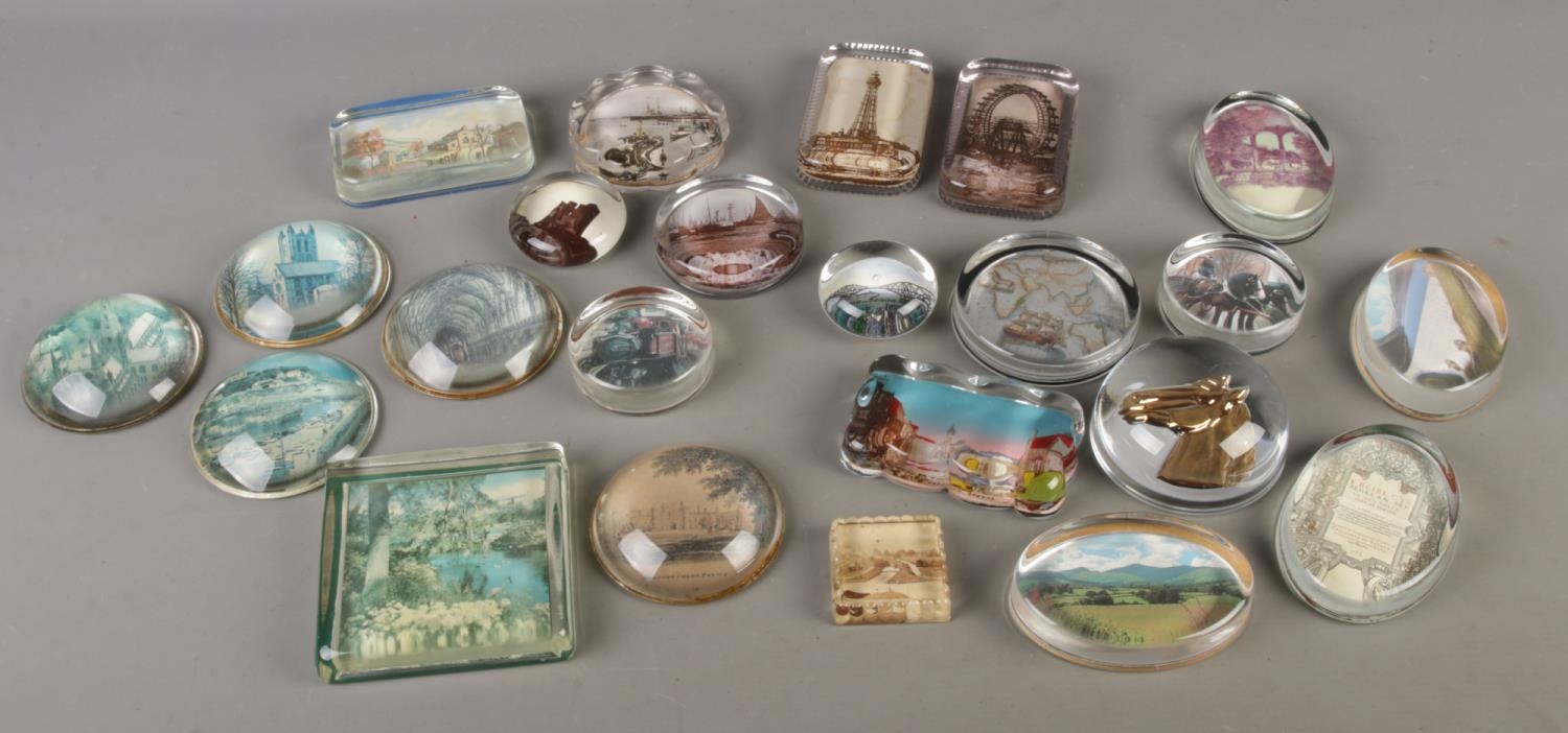 A collection of twenty-three photo back clear glass paperweights; including vintage, antique and modern picture/design examples - Lichfield Cathedral, Hampton Court Palace, Gloucester Cathedral, Blackpool Tower, Knaresborough and many other examples.