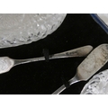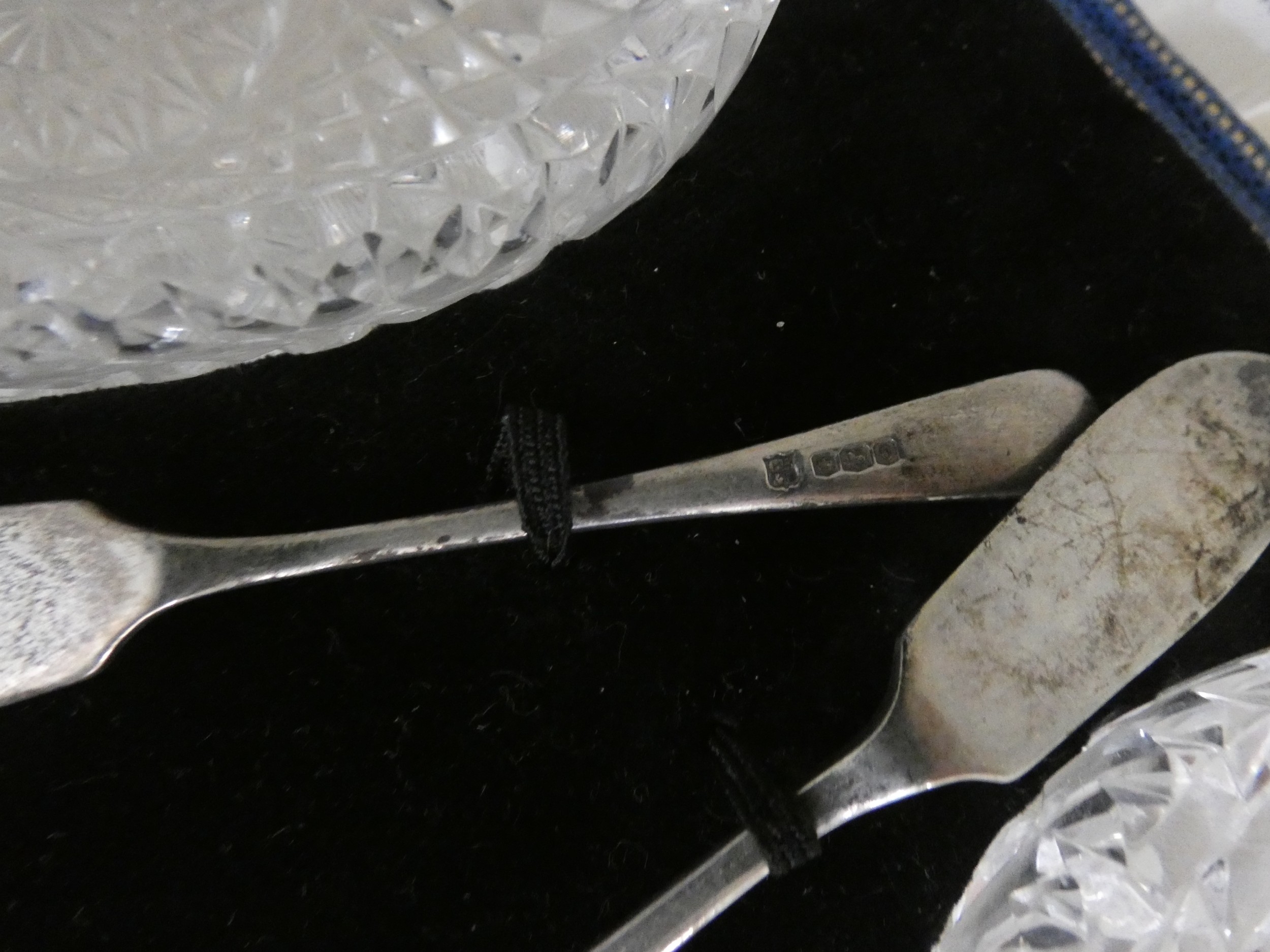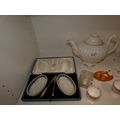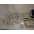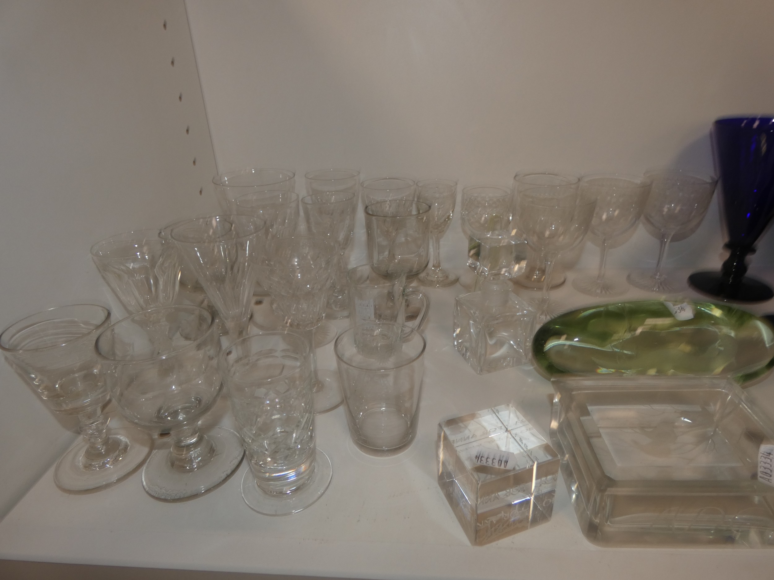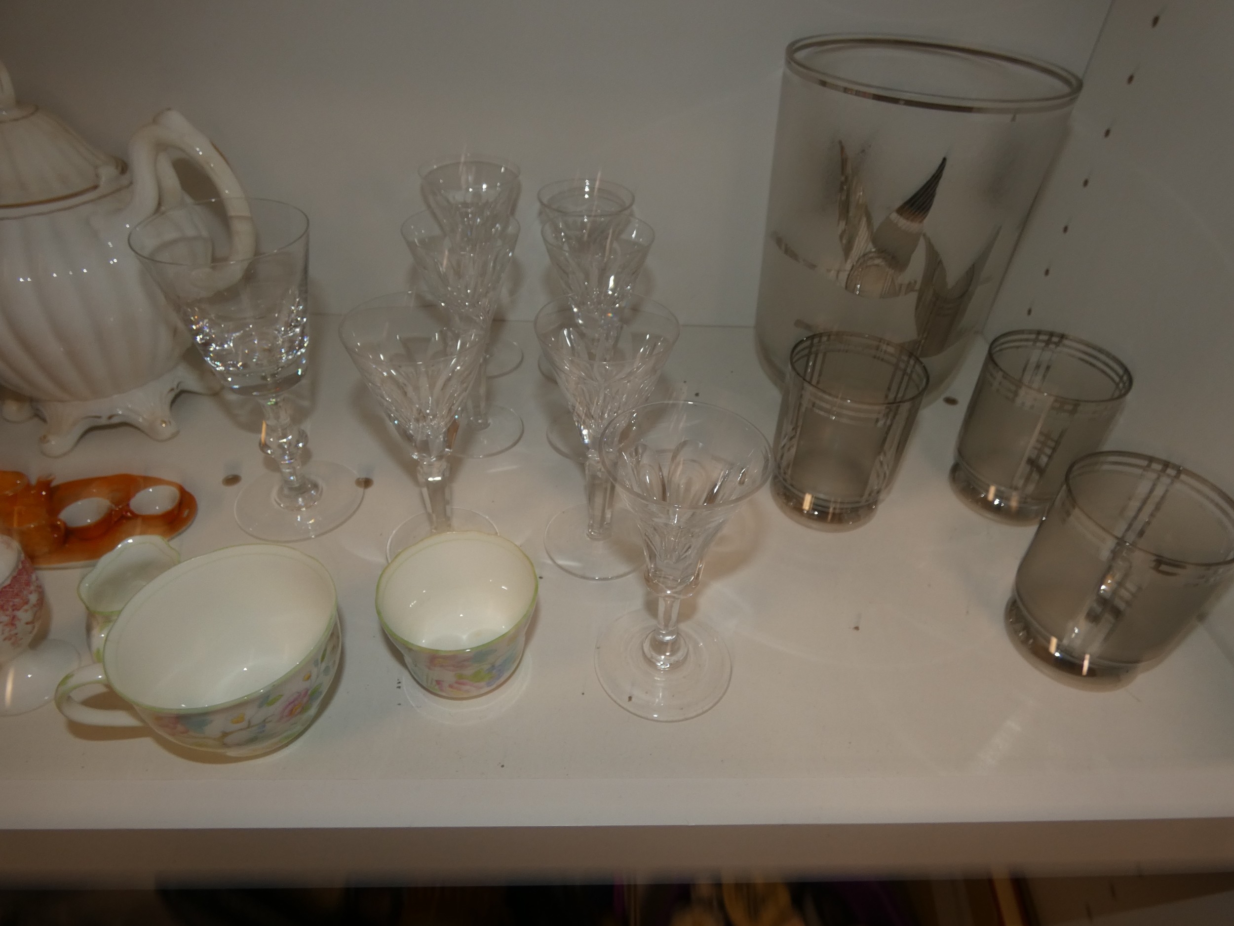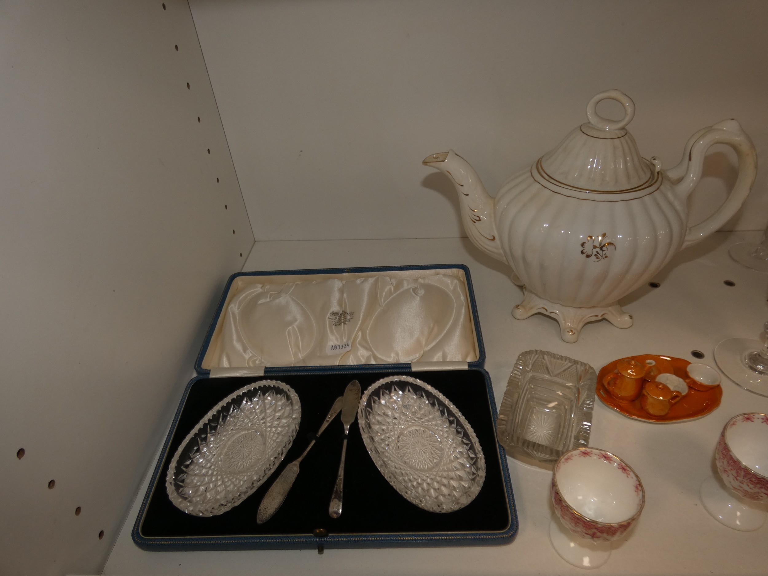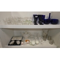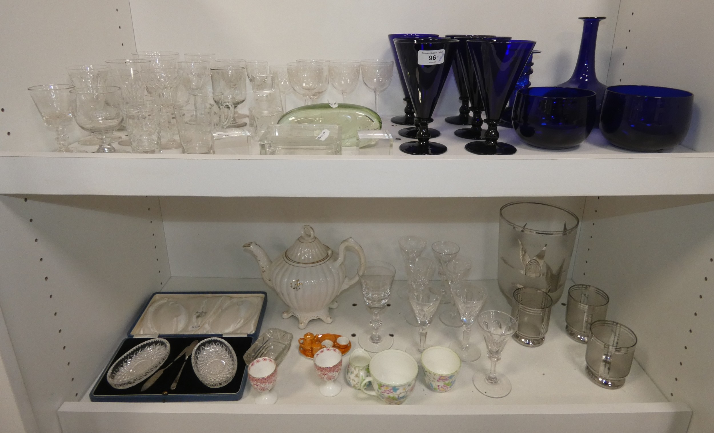 Two shelves of glasses to include set of six Bristol blue coloured conical wine glasses, decanters and finger bowls, set of six cordial glasses, others and ornaments, boxed butter dishes, tea pot etc.