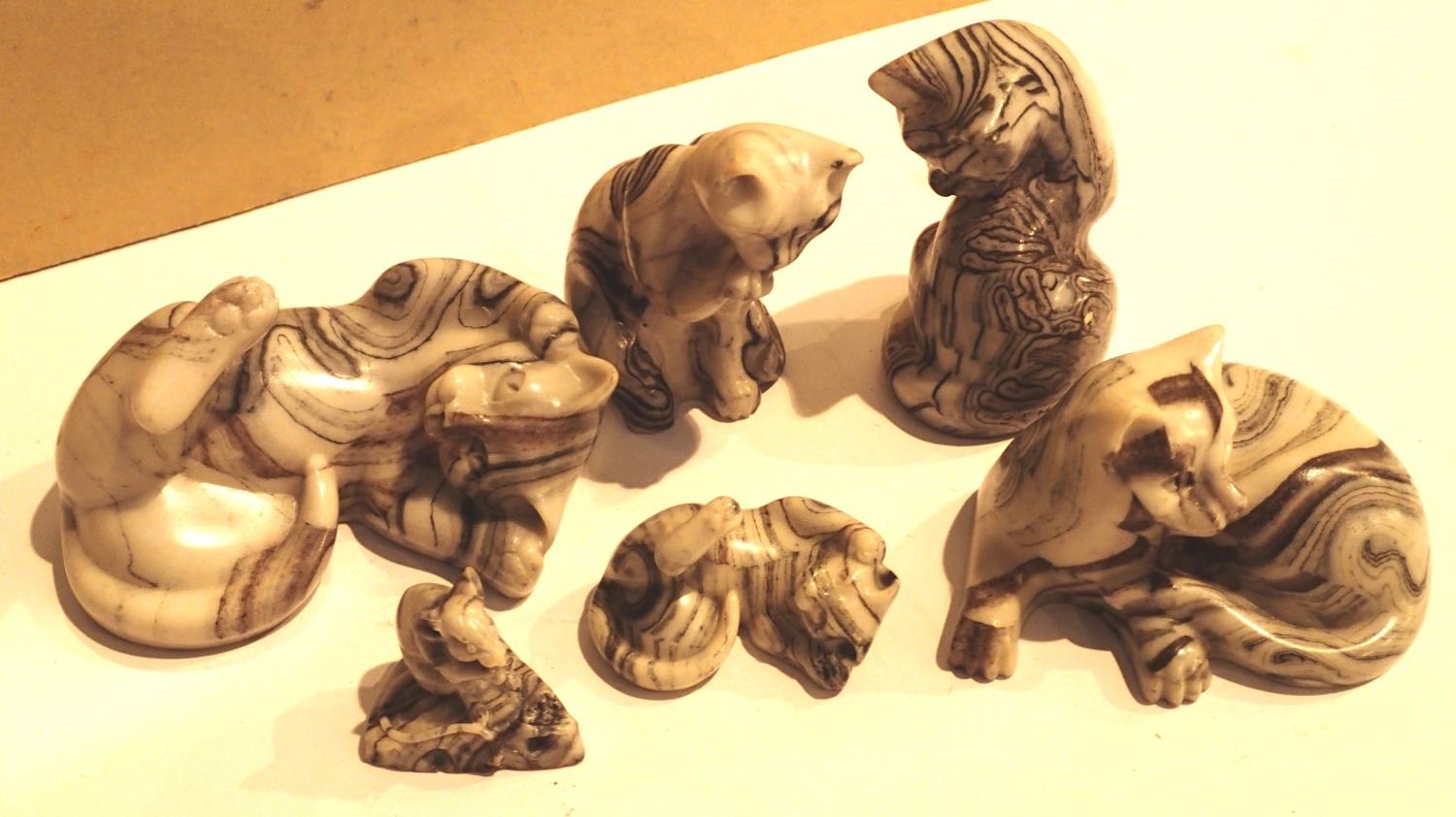 Six miniature cat figurines with black stripes. P&P Group 1 (£14+VAT for the first lot and £1+VAT for subsequent lots)