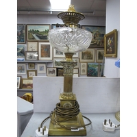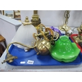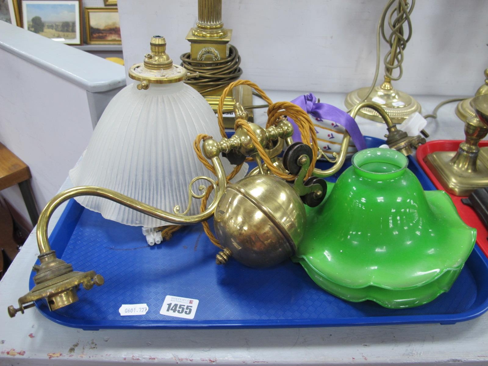 A Brass Rise and Fall Twin Branch Ceiling Light, circa early XX Century with green shades, another shade:- One Tray.