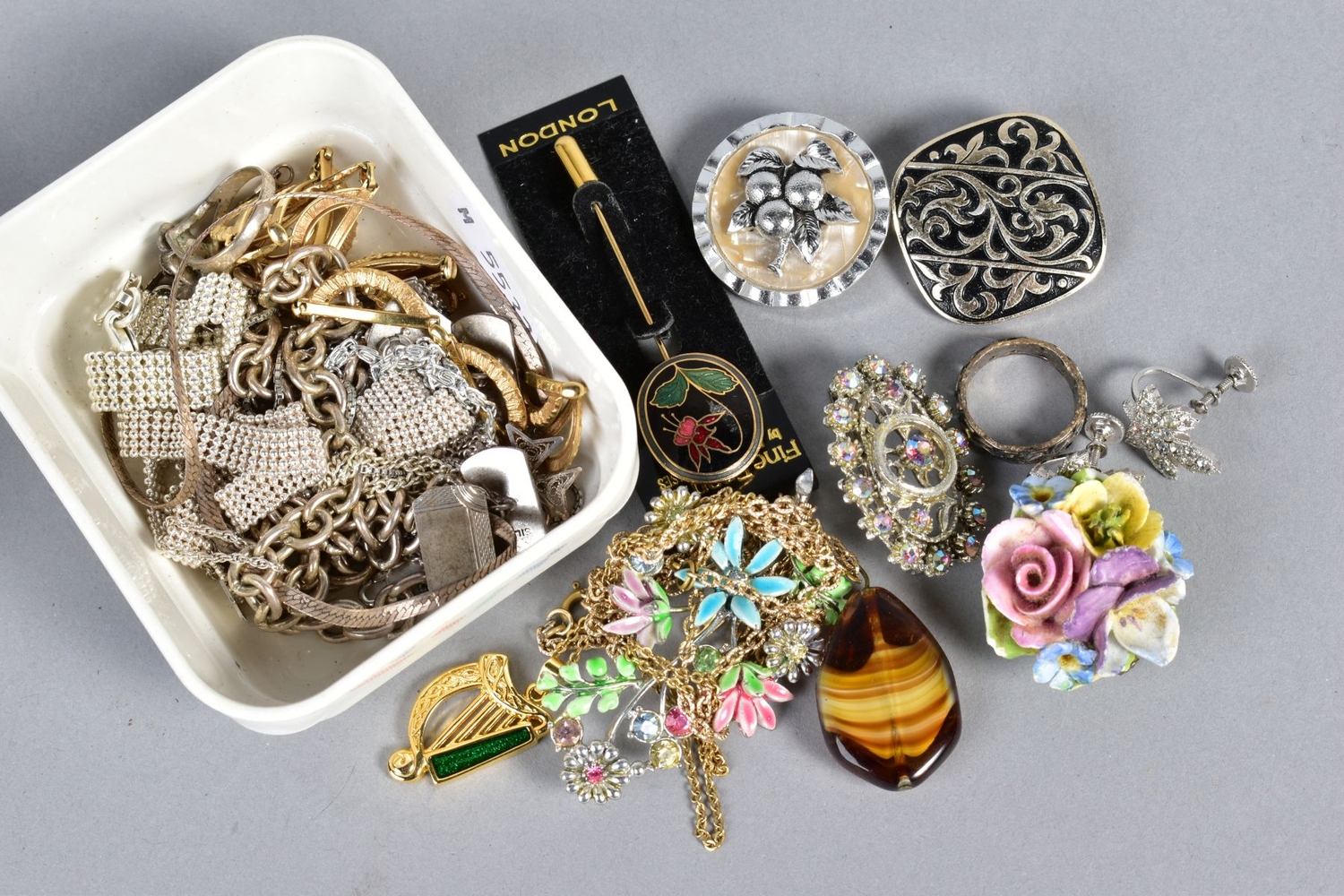 A SELECTION OF SILVER AND WHITE METAL JEWELLERY AND COSTUME JEWELLERY, the silver and white metal jewellery includes necklaces, pendants and a pair of cufflinks, many with marks to indicate silver, approximate total weight 97 grams, together with costume jewellery brooches, etc