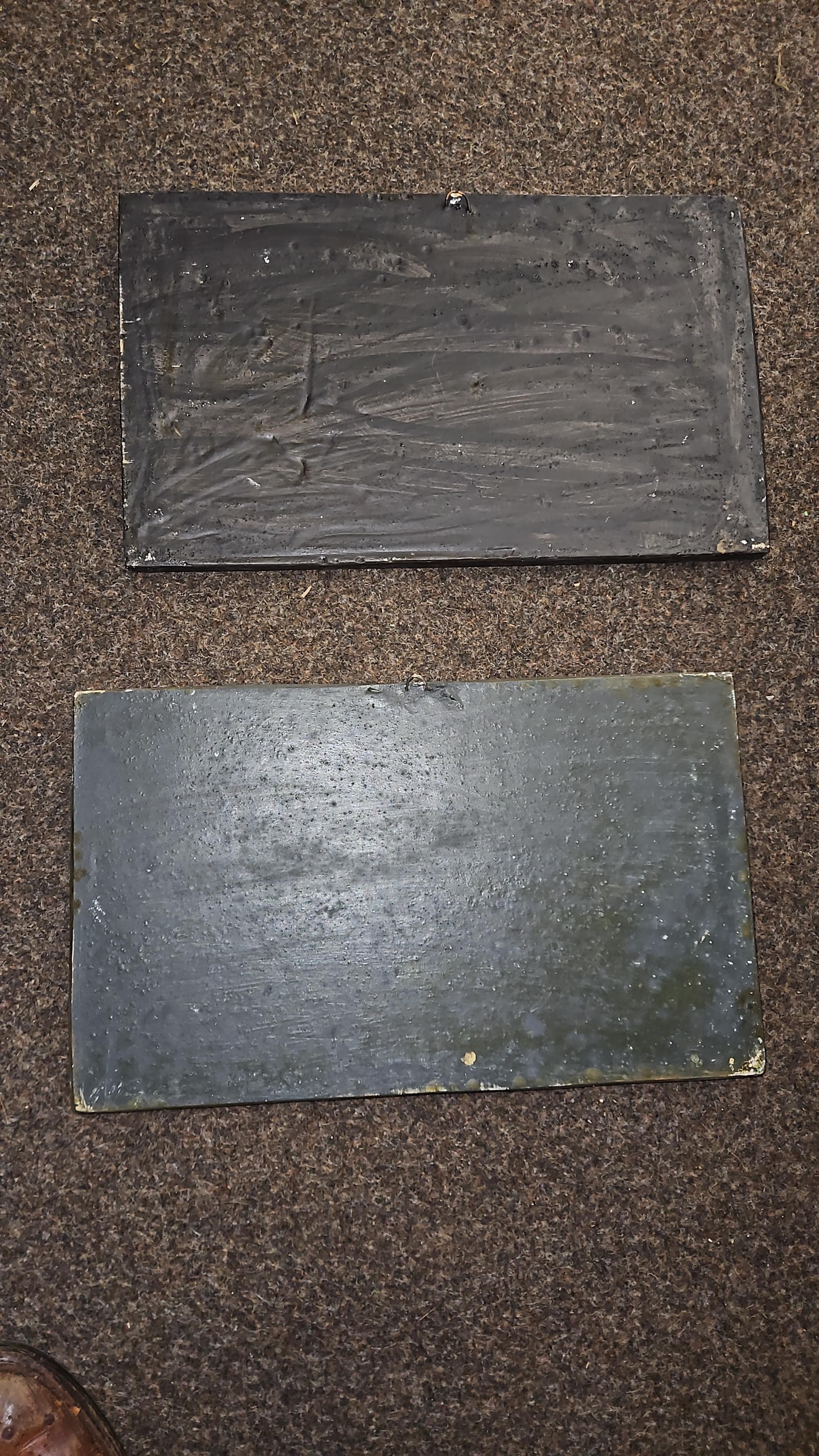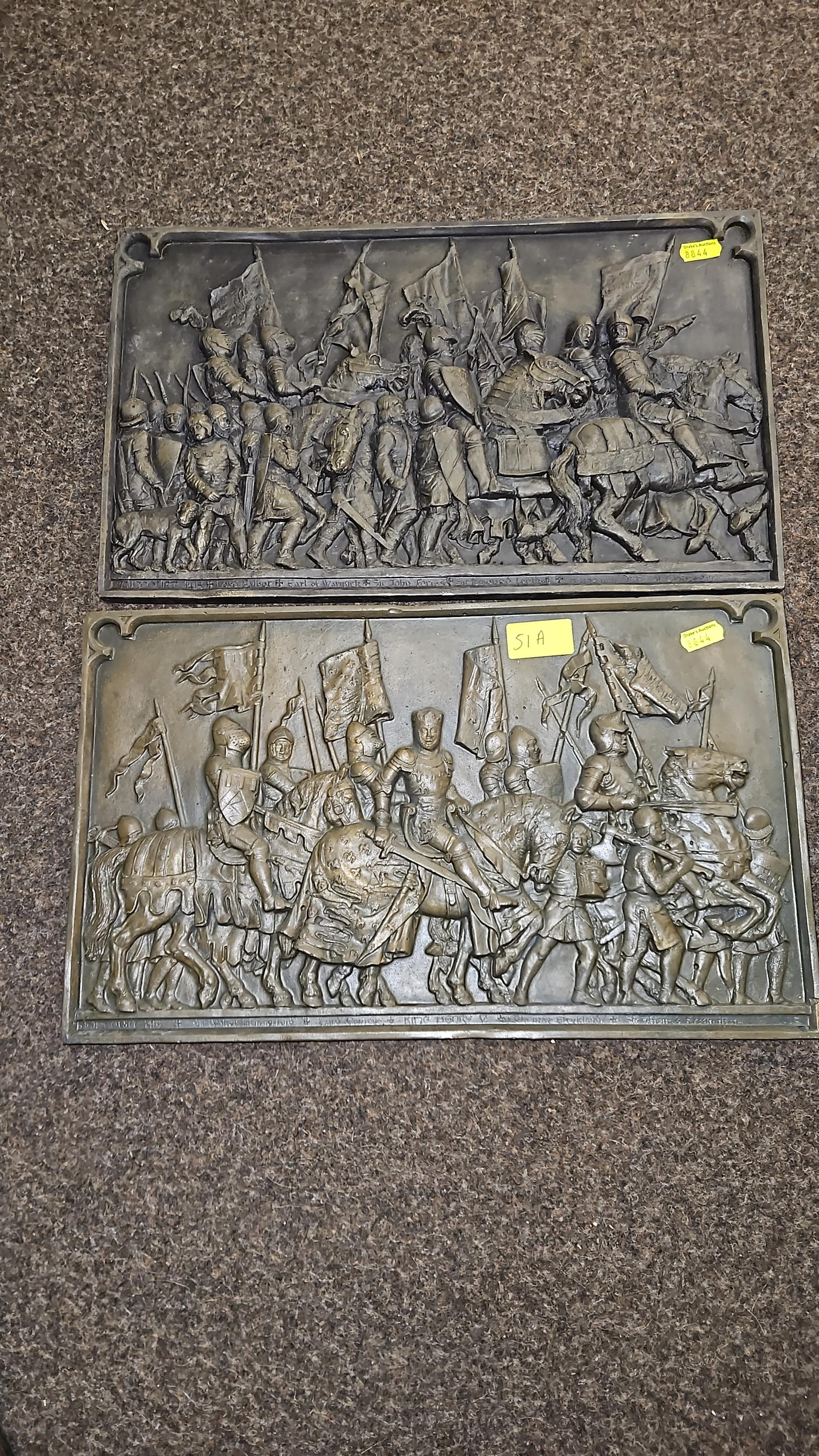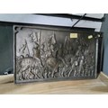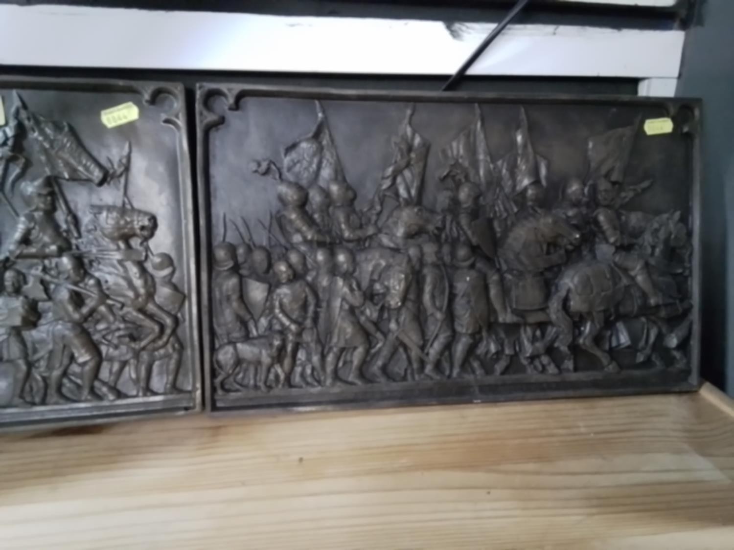 Two bronzed plaster reliefs of battle scenes. 41cm x 25cm