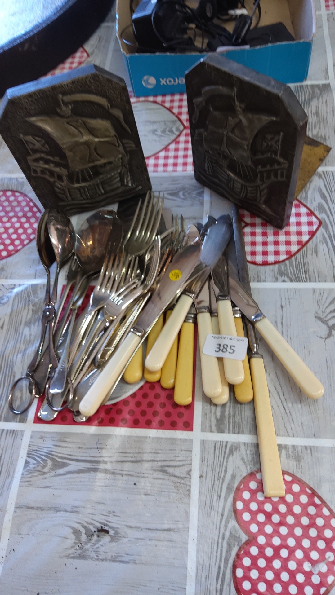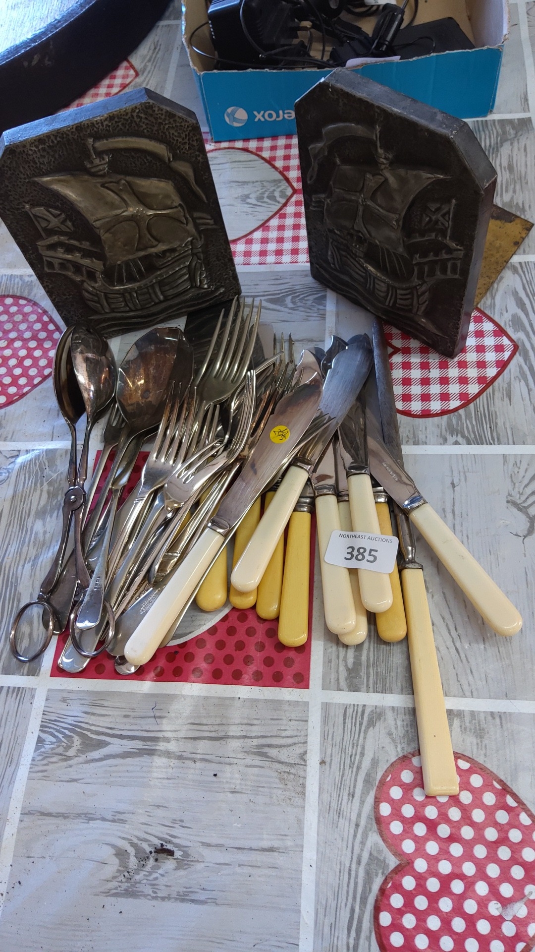 A mixed group of flatware including stainless-steel forks and spoons, a collection of table knives with cream and yellow plastic handles, and a pair of wooden bookends modelled in relief with sailing ships.