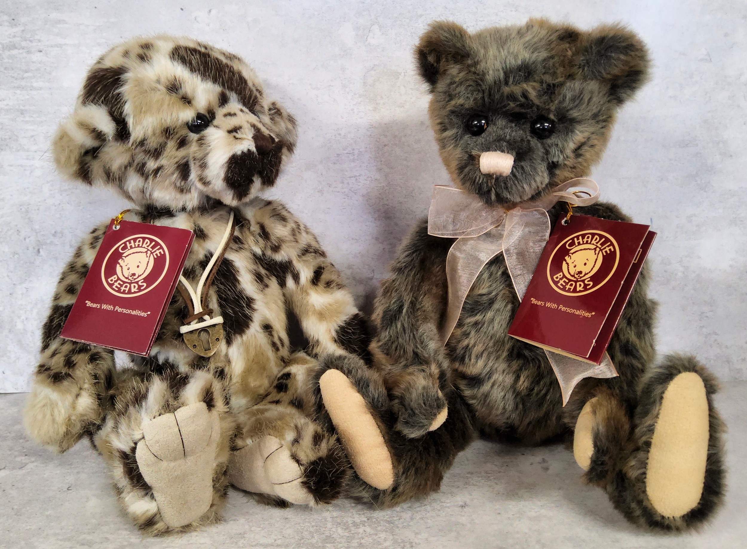 Charlie Bears Plush Collections - Crumpet CB140036A designed by Heather Lyell with jointed arms and legs, stitched nose, necklace with padlock charm, original tags, (height in bear paws 11) 2014; another Skinny Pin designed by Charlie with jointed arms and legs, stitched nose, pink bow, original tags (height in bear paws 11) 2017
