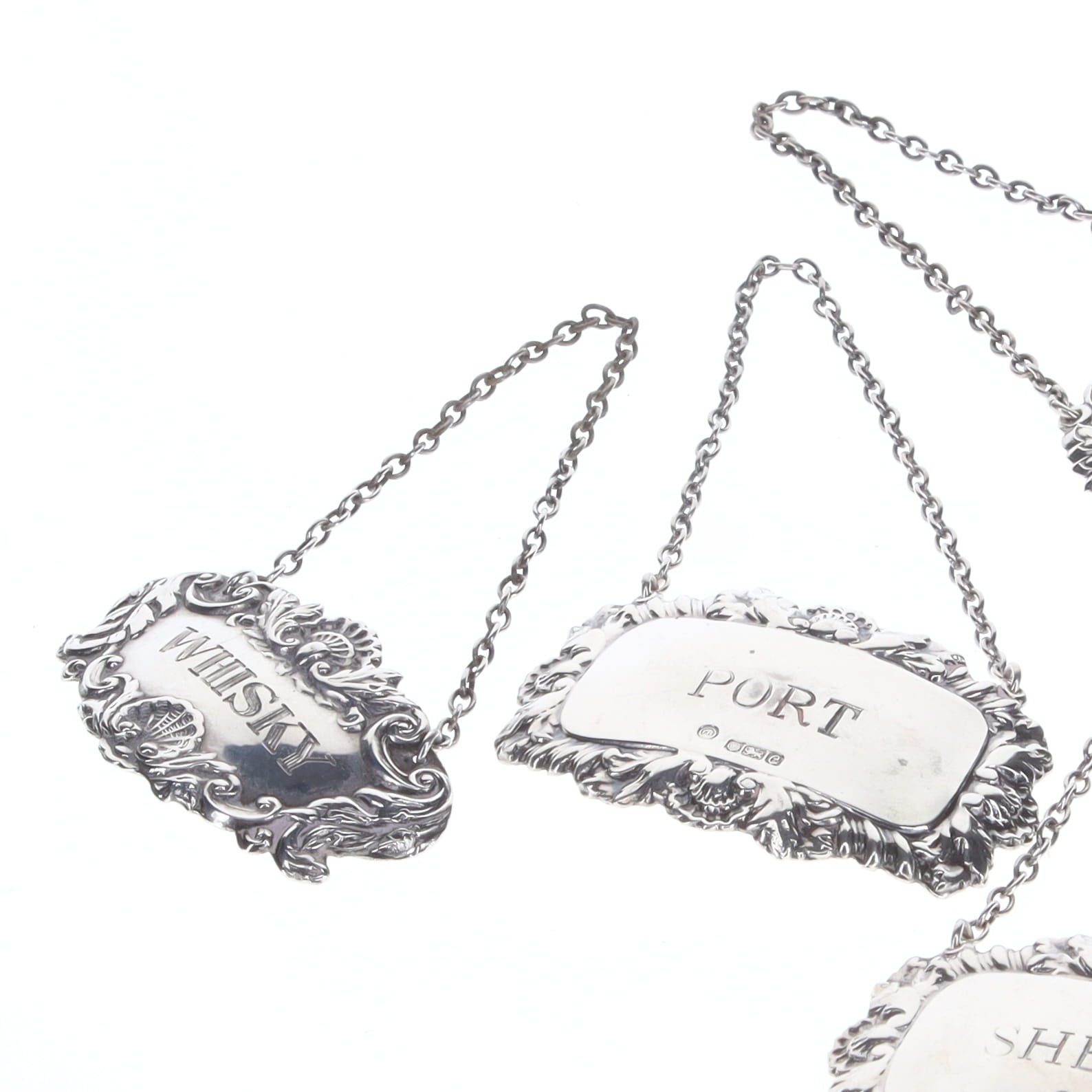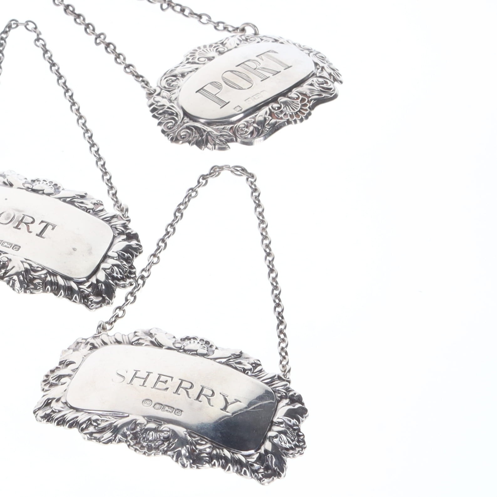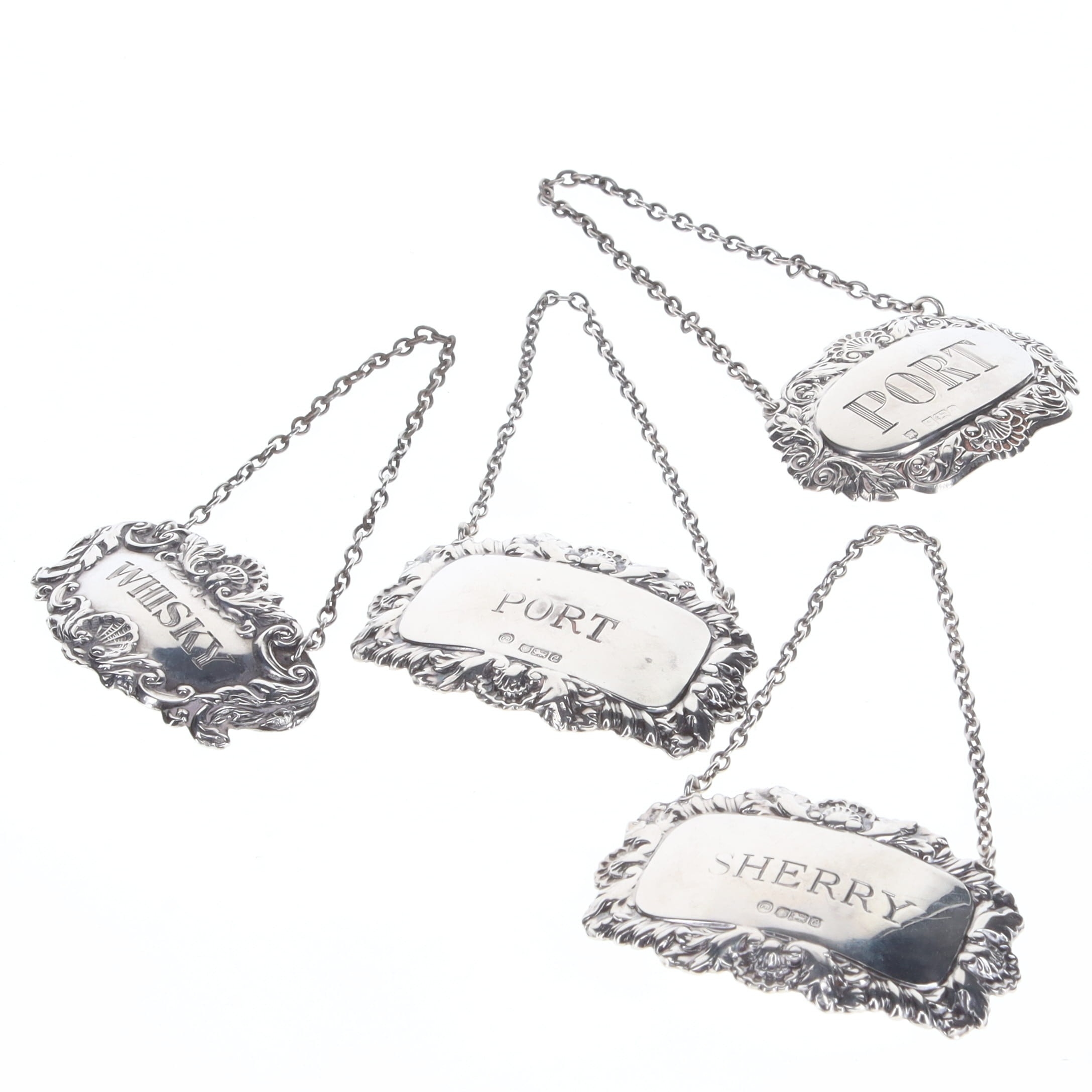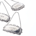 Sterling Silver Decanter Labels Collection, consisting of 4 items with various designs and styles. Includes Sherry, Port.