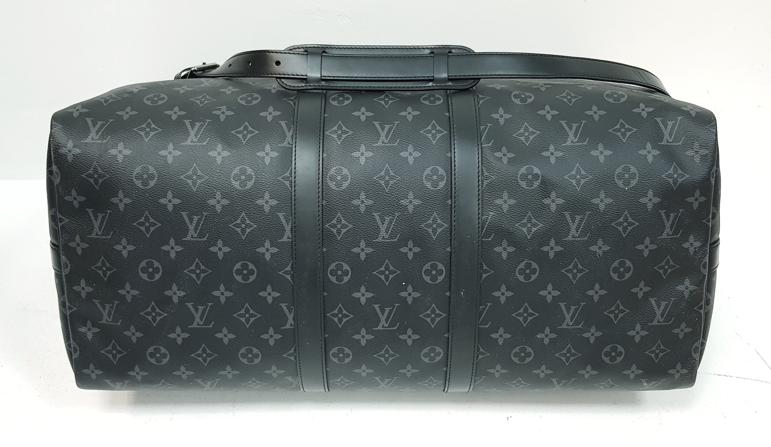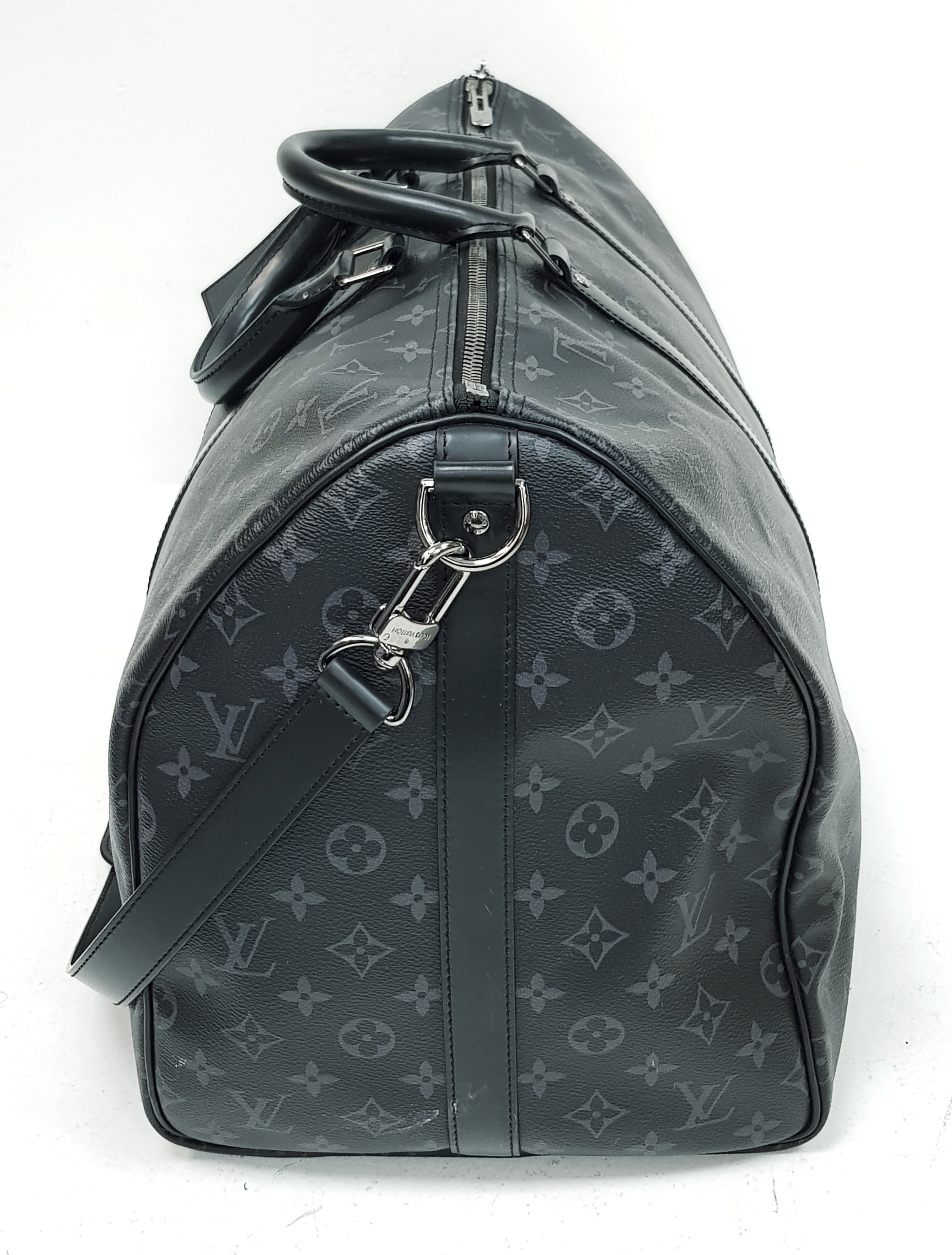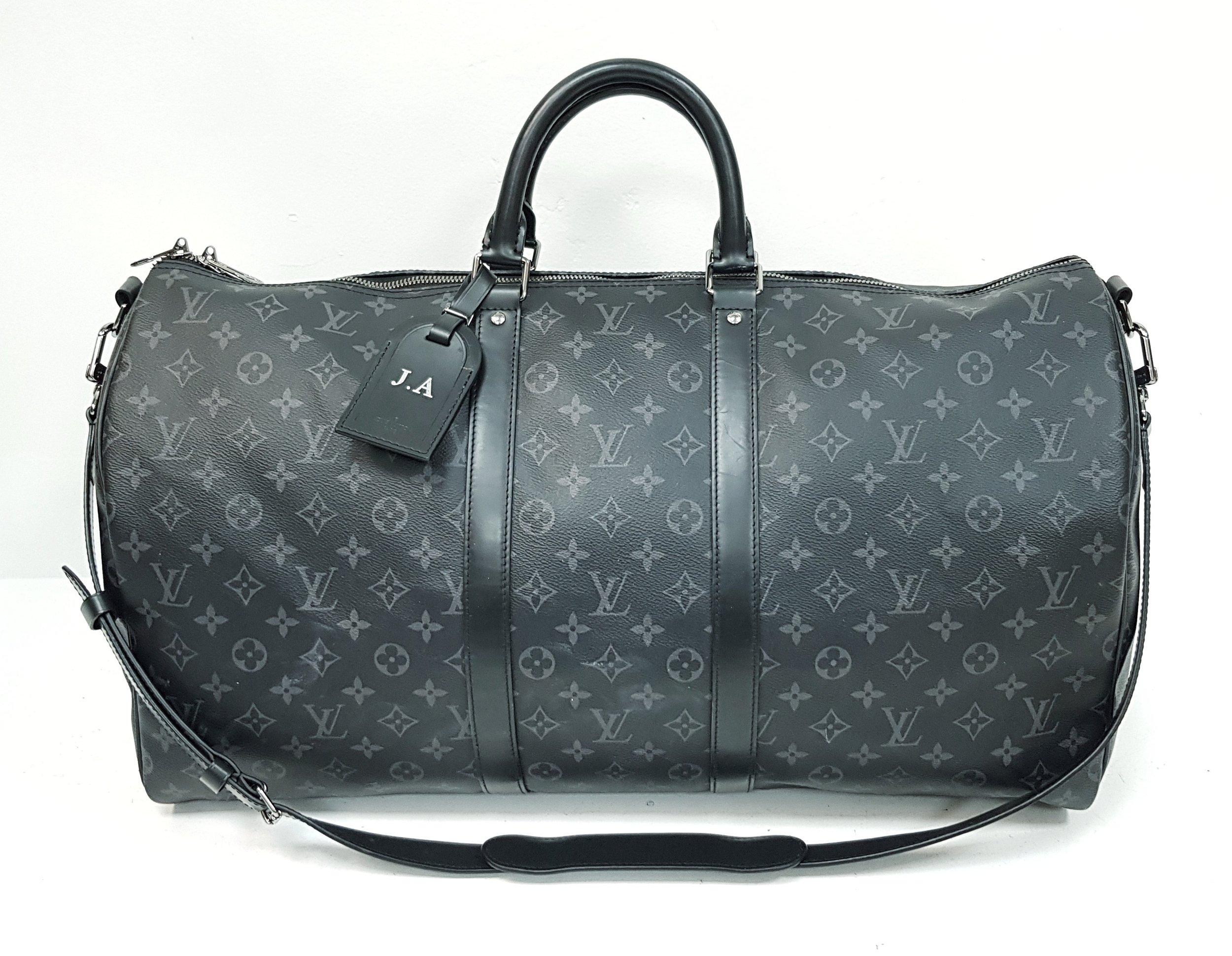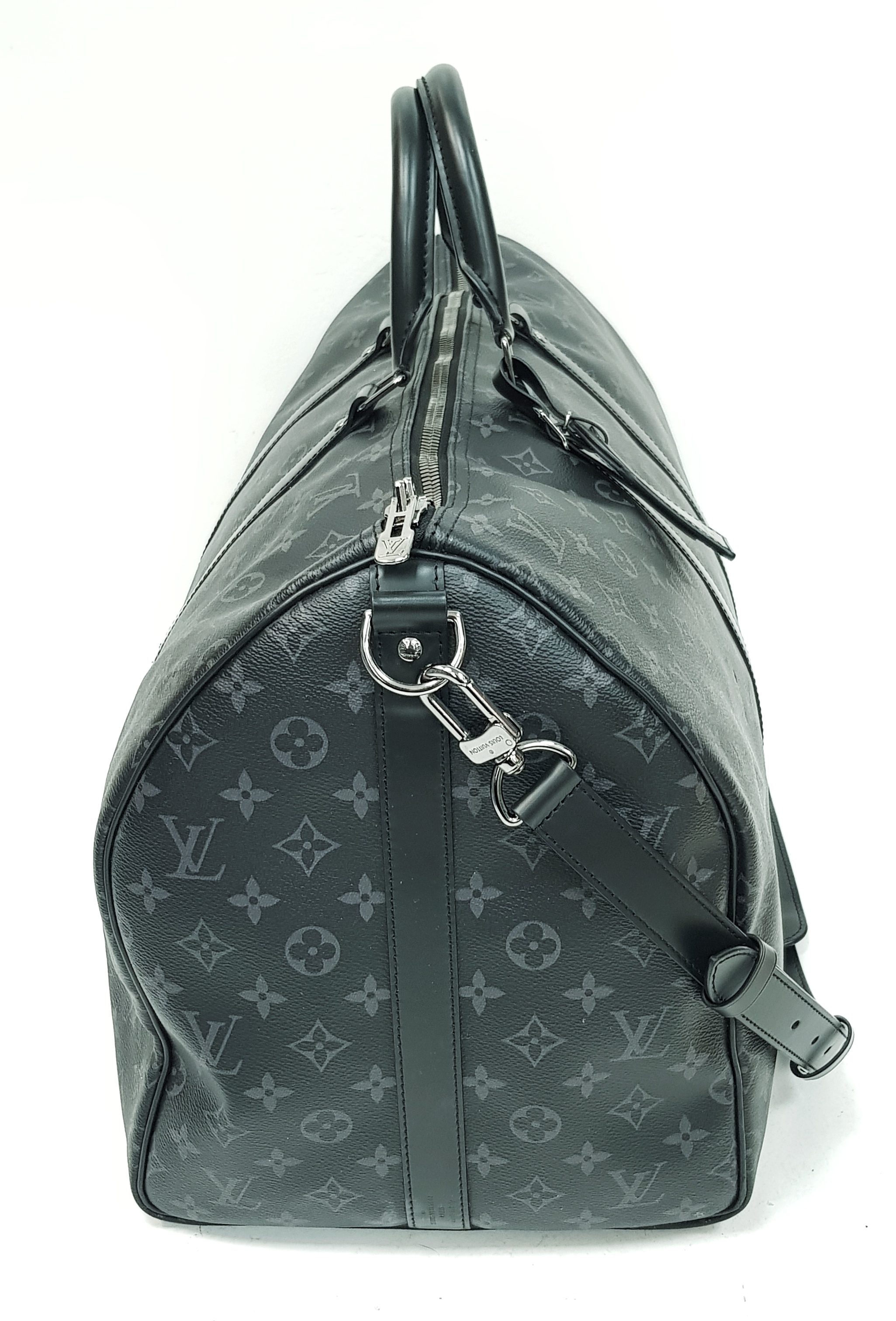 A Louis Vuitton Monogram Eclipse Keepall Bandoulière 55 Travel Bag. Crafted in grey-on-black monogram coated canvas with black leather trim, rolled top handles, and silver-tone hardware. Features a detachable shoulder strap and a personalised hanging leather tag. Dual zip fastening opening to a black textile interior with a spacious compartment and a zipped inner side pocket. Comes with a dust cover bag, certificate of authenticity, padlock and keys (with pouch). Approximate size: 55cm length x 30cm height x 24.5cm width. Light white marks to the exterior and a small approx. 0.5cm scuff to the leather exterior. Please see photos for details or request a condition report. Ref: 27437