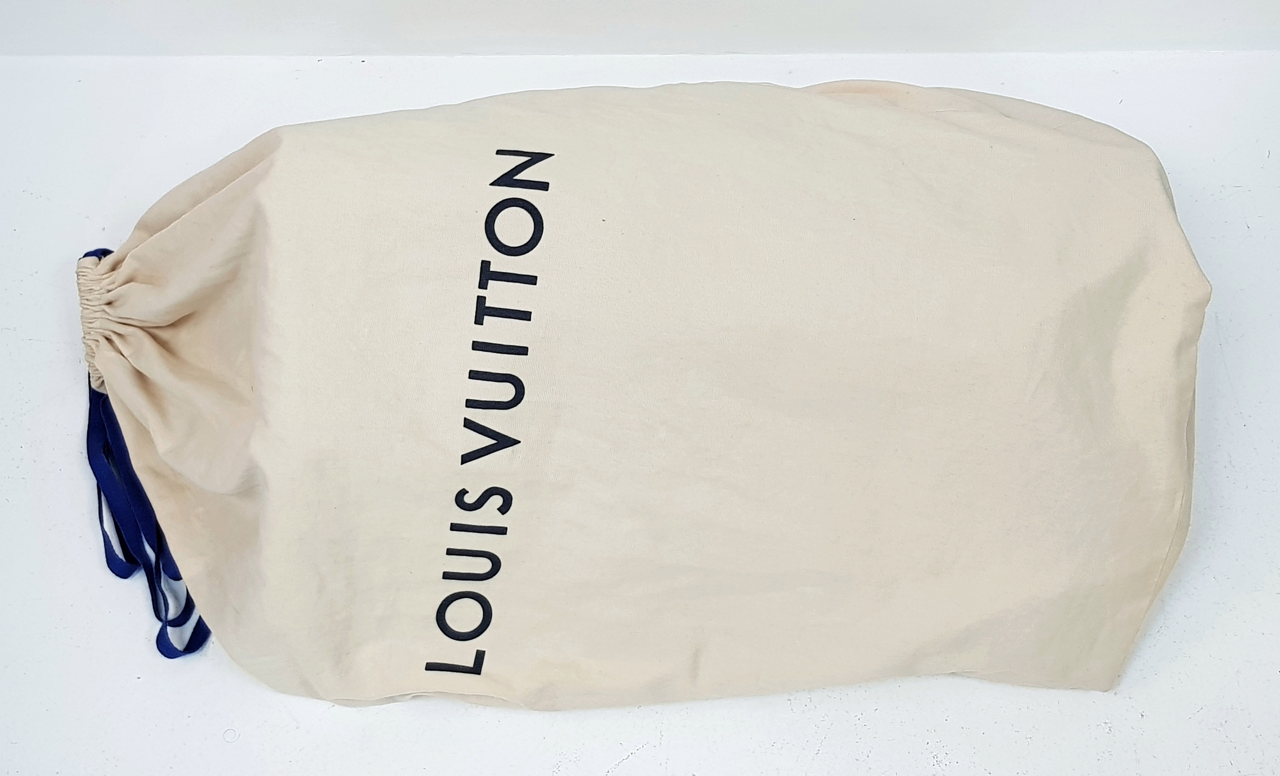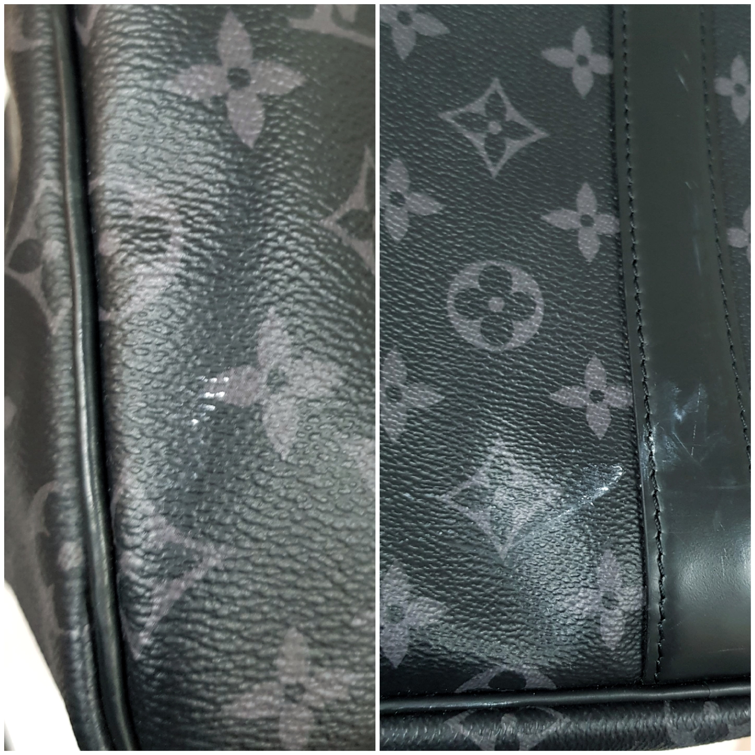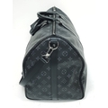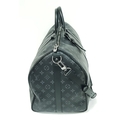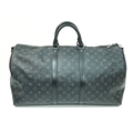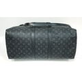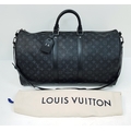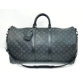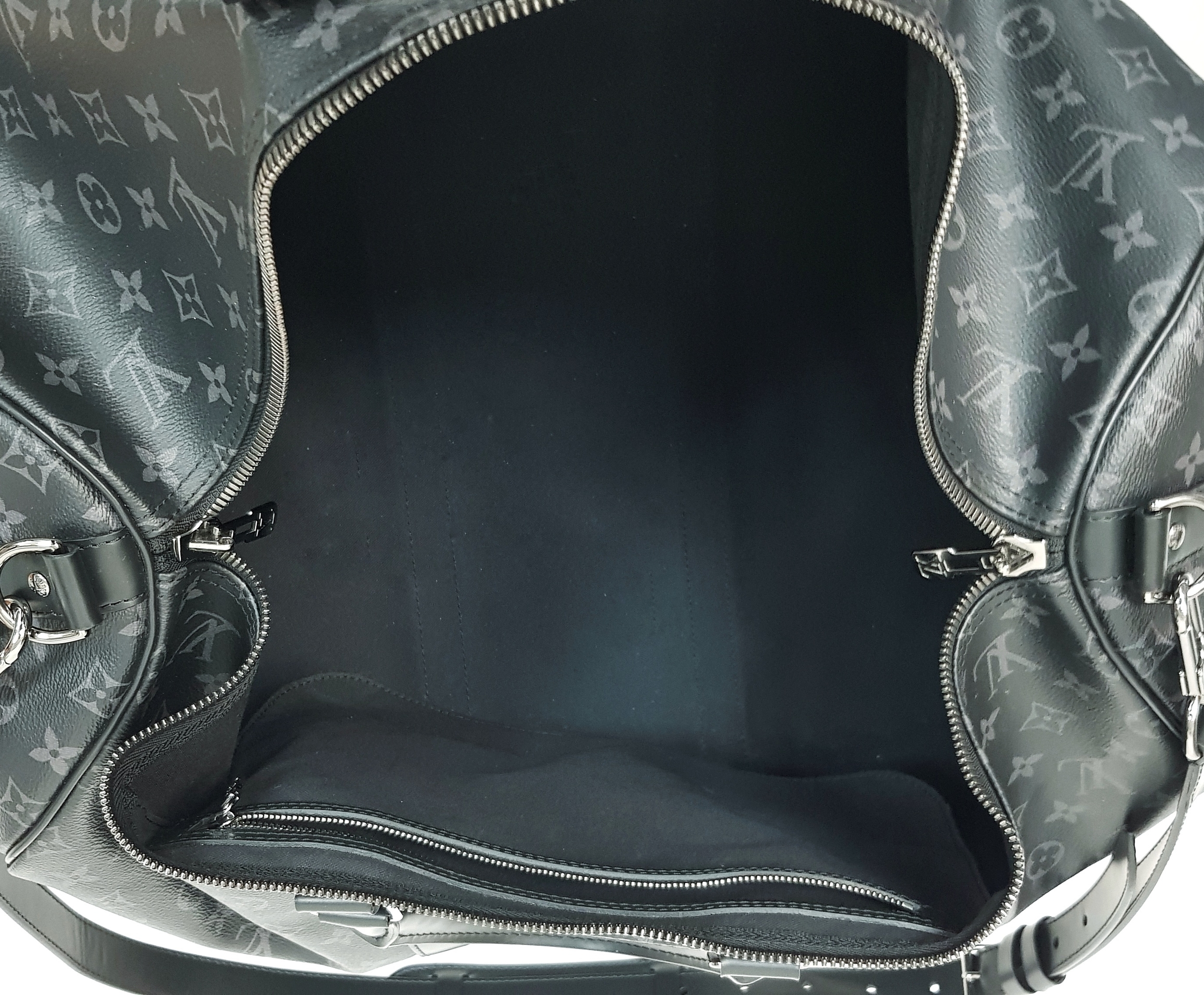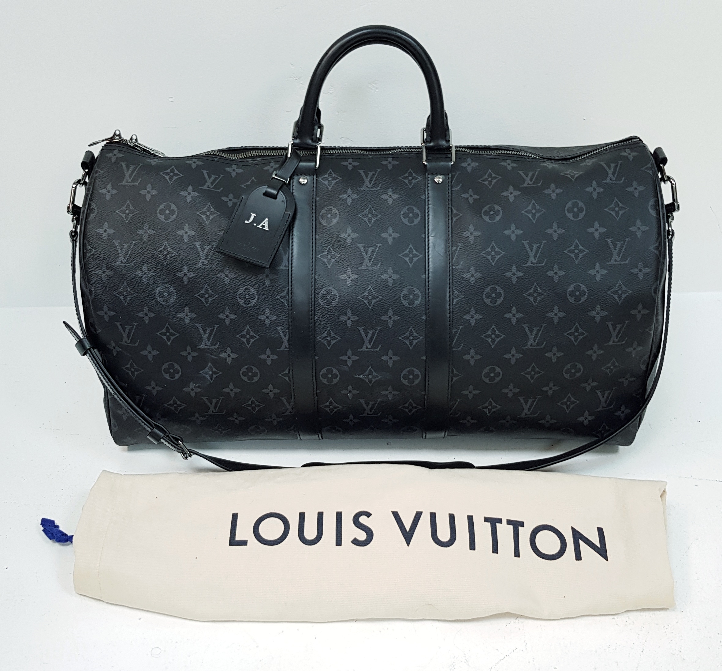 A Louis Vuitton Monogram Eclipse Keepall Bandoulière 55 Travel Bag. Crafted in grey-on-black monogram coated canvas with black leather trim, rolled top handles, and silver-tone hardware. Features a detachable shoulder strap and a personalised hanging leather tag. Dual zip fastening opening to a black textile interior with a spacious compartment and a zipped inner side pocket. Comes with a dust cover bag, certificate of authenticity, padlock and keys (with pouch). Approximate size: 55cm length x 30cm height x 24.5cm width. Light white marks to the exterior and a small approx. 0.5cm scuff to the leather exterior. Please see photos for details or request a condition report. Ref: 27437