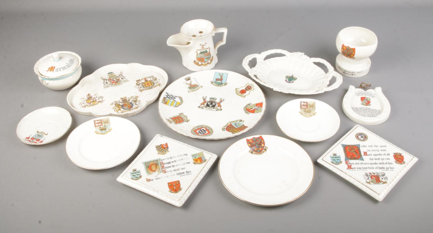 A collection of large Goss crested ware including plates, wall plaques, jug, marmalade pot etc