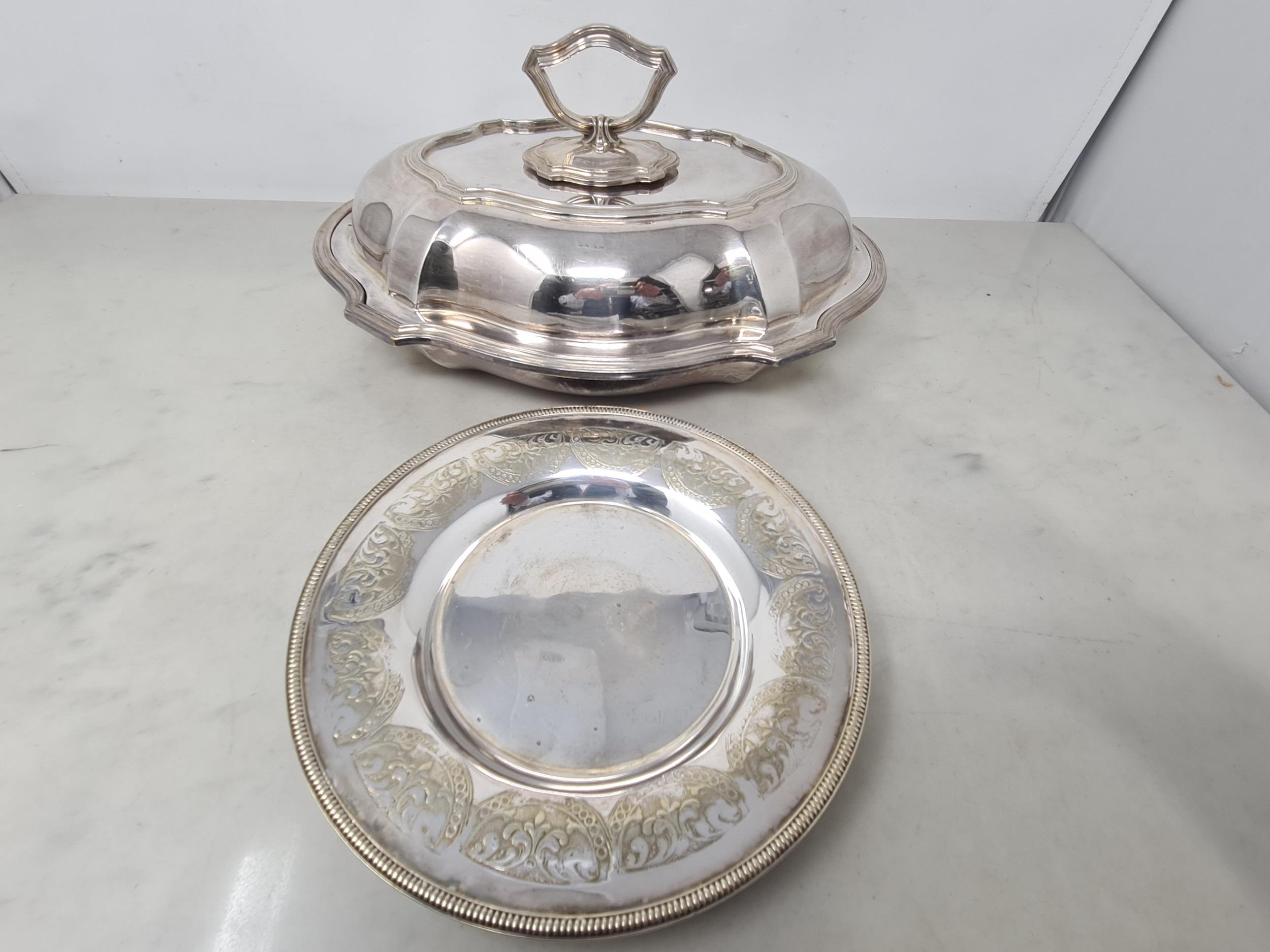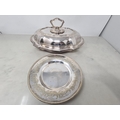 A plated oval Entree Dish and Cover and a plated circular Dish