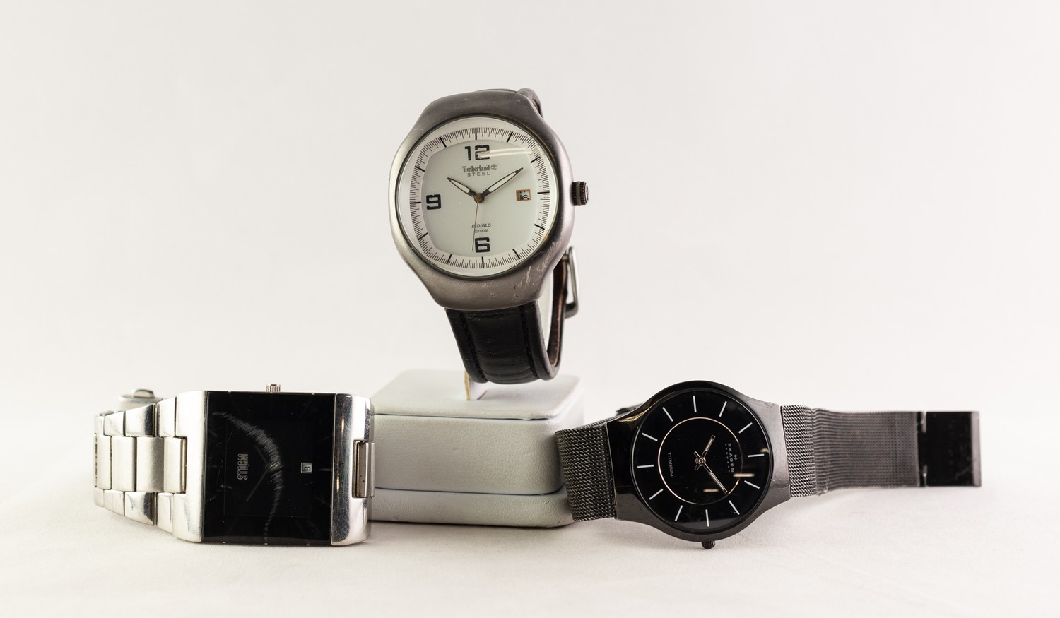 STORM OMAN x 1 TITANIUM GENT'S SQUARE FACED WRISTWATCH with black mesh strap and a TIMBERLAND 'INDIGLO' GENT'S WRISTWATCH (3)