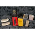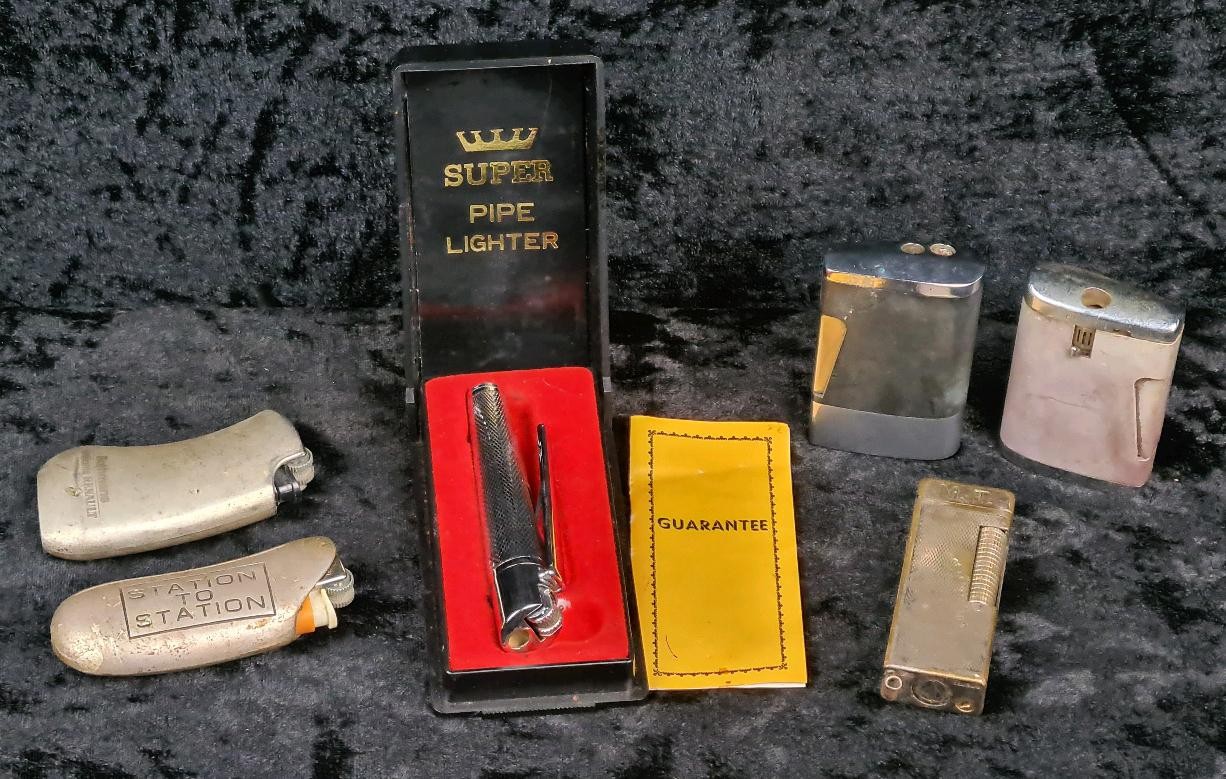 Collection of vintage lighters including two Ronson comet lighters, a Rothmans promotional lighter for Renault, a vintage metal lighter engraved ‘MT’, a boxed ‘Super pipe lighter’ and an unusual shaped lighter marked ‘Station to Station’