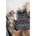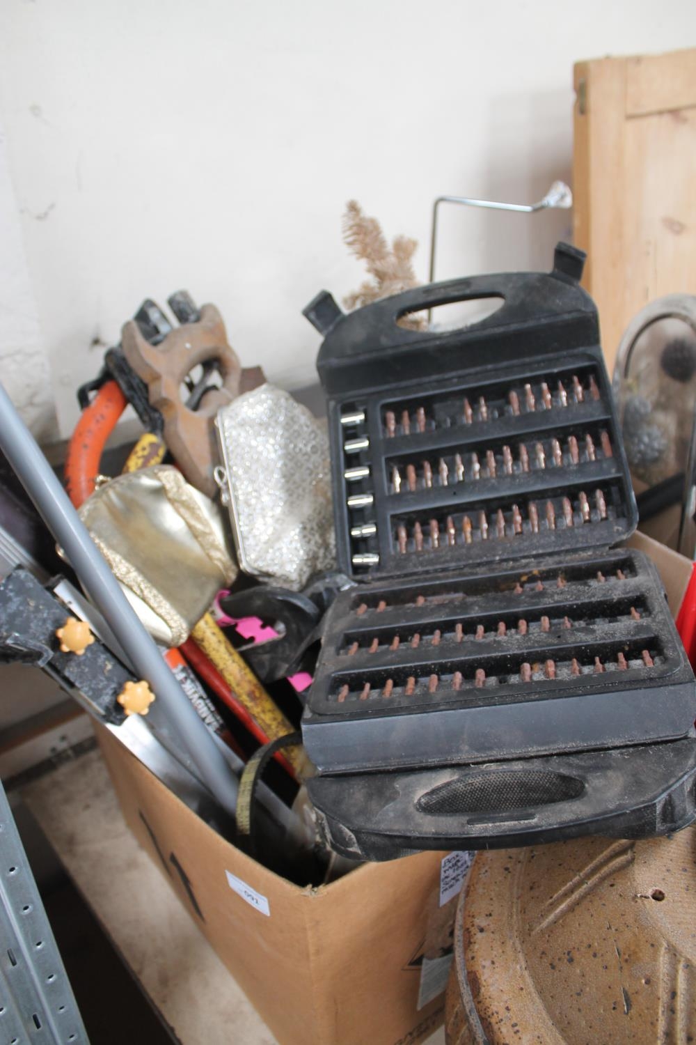 BOX OF MISC TOOLS AND HARDWARE INCLUDING POST SUPPORTS, SAWS, SCREWDRIVER BIT SETS AND MORE