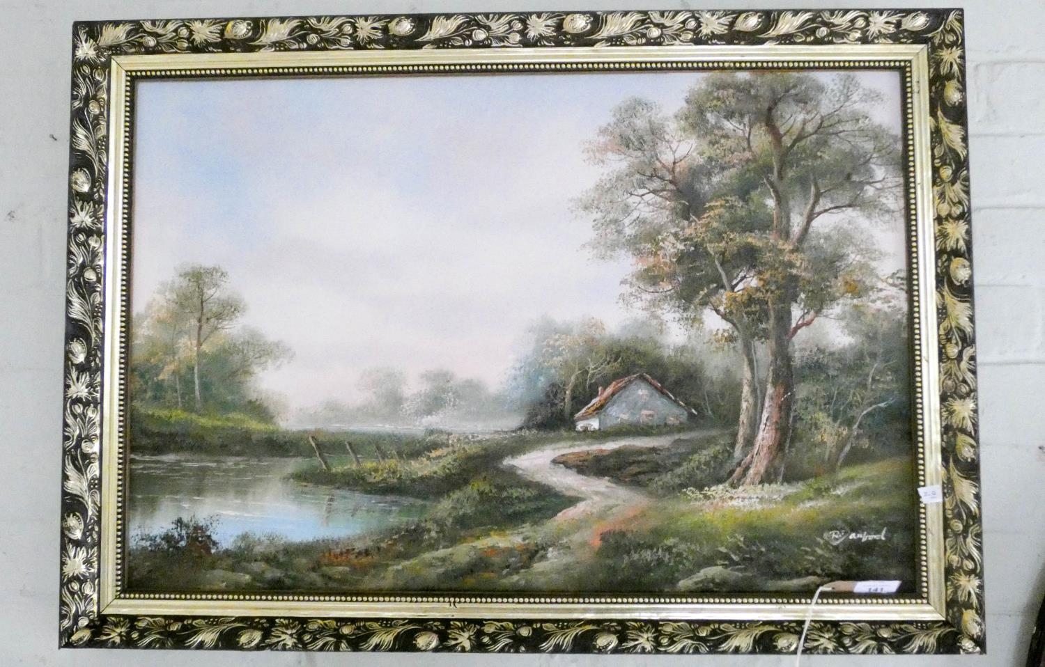 A framed oil painting of a country scene