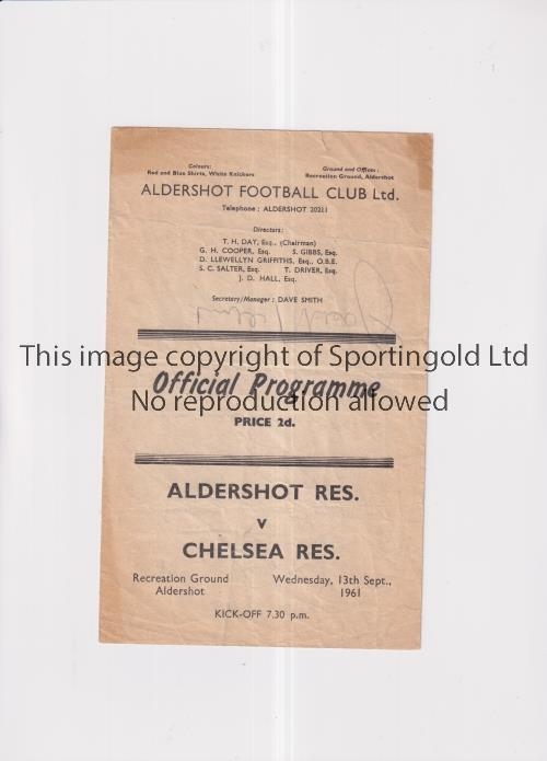 CHELSEA 1961 / AUTOGRAPHS Programme for the away Football Combination match v Aldershot Reserves 13/9/1961, signed on the line-up page by 9 Chelsea players and 10 Aldershot players. Creased and minor tears. Fair to generally good