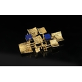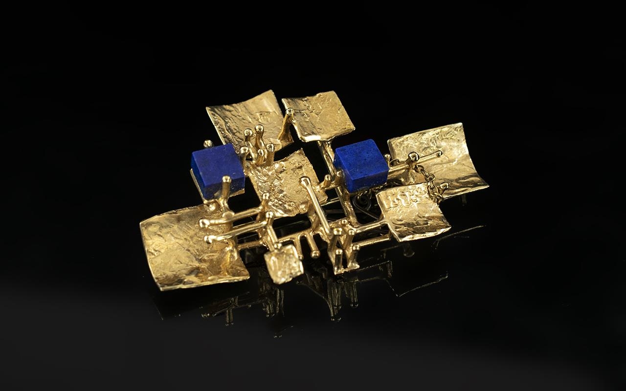 Contemporary Designed 15ct Gold Blue Lapis Lazuli Set Brooch. The Lapis Lazuli of Square Form and Deep Blue Colour, Modern Art Form Design In the Style of Kutchinsky Jewellery. Fully Hallmarked. 10.7 grams. Size 2 Inches - 5 cms Diameter. Superb Condition In All Aspects.