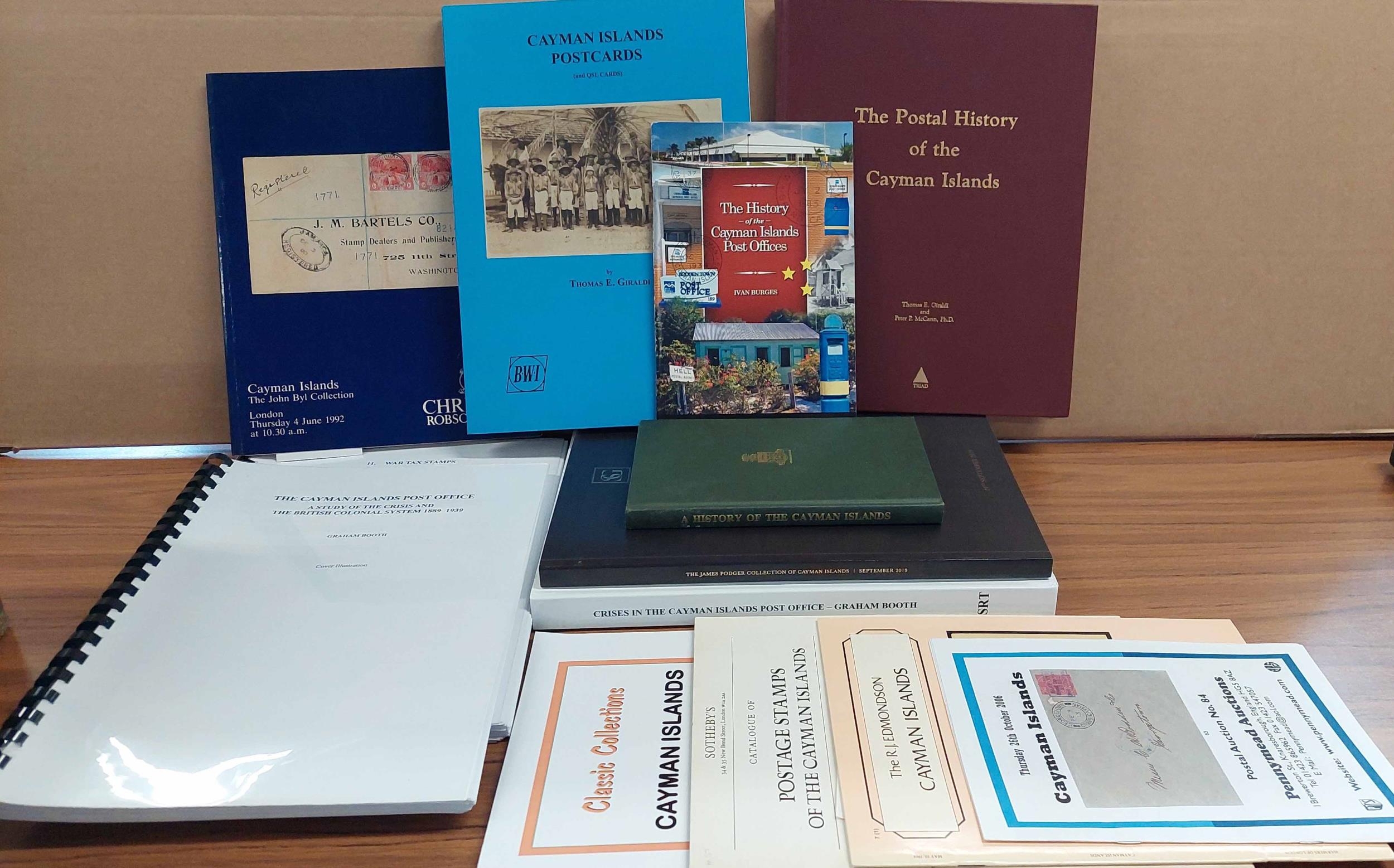 CAYMAN ISLANDS: Carton inc. The Postal History of the Cayman Islands by Giraldi & McCann (1989), hardbound with gilt lettering; Crises in the Cayman Islands Post Office (Under the British Colonial System 1889-1939) By Booth (2020), hardbound; and Cayman Islands Postcards (and QSL Cards) by Giraldi (2015), softbound; etc. All in excellent or very good condition. (13)Cross Reference: CAYMAN ISLANDS
