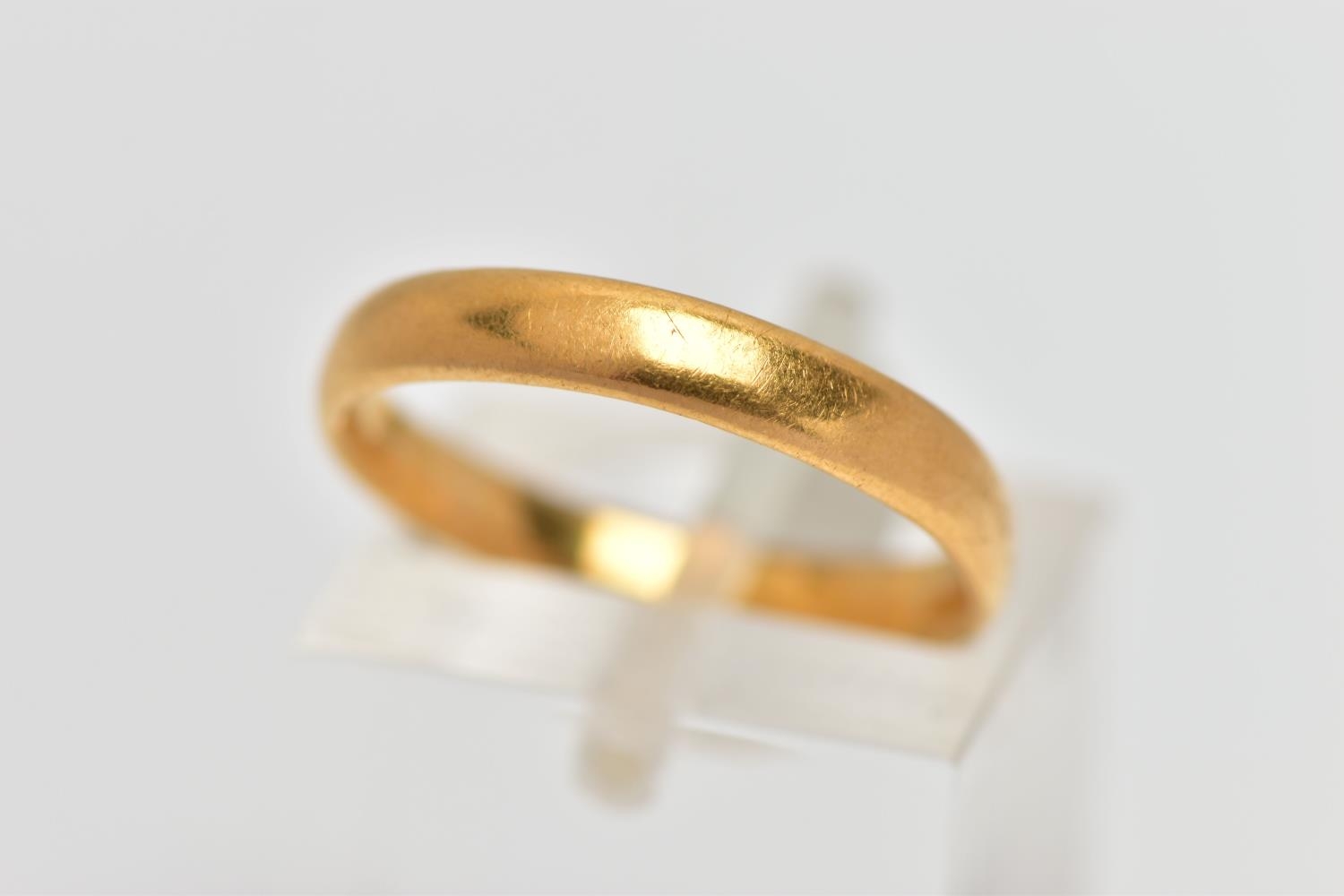 A 22CT GOLD BAND RING, polished band, approximate width 8.0mm, hallmarked 22ct Birmingham, ring size K, approximate gross weight 3.2 grams (condition report: slightly misshapen band, general light wear)