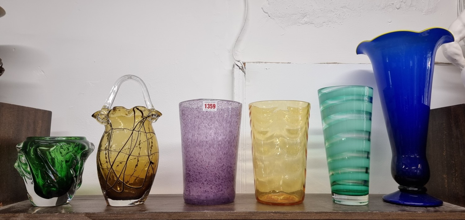 Six coloured glass vases, largest 39cm high.