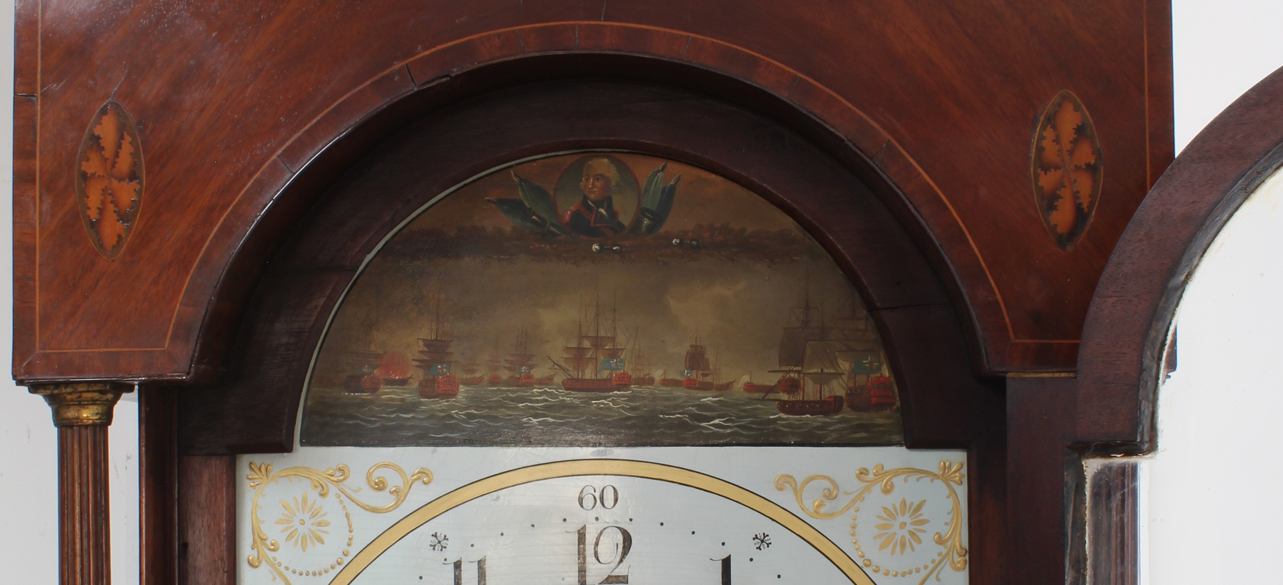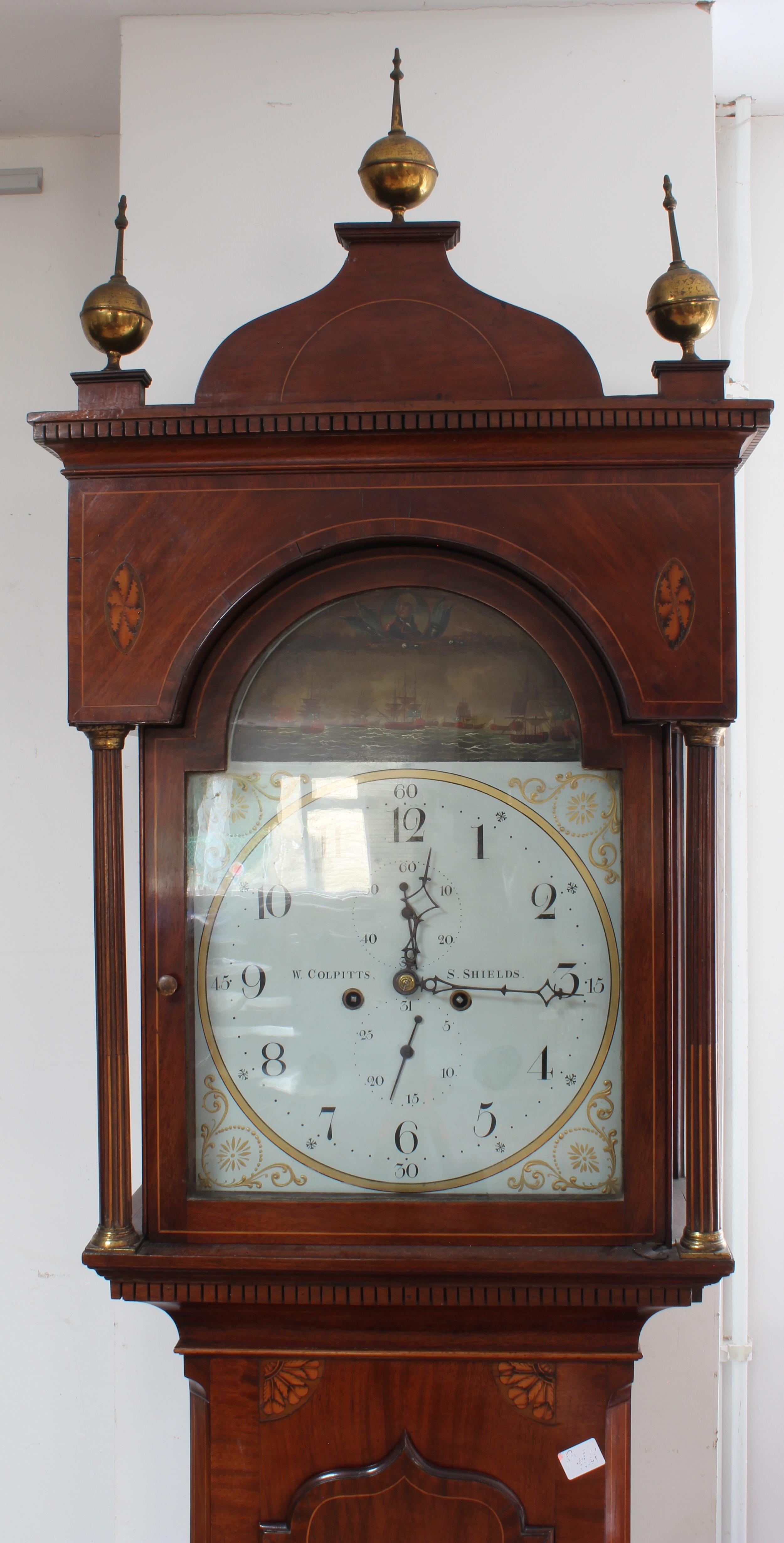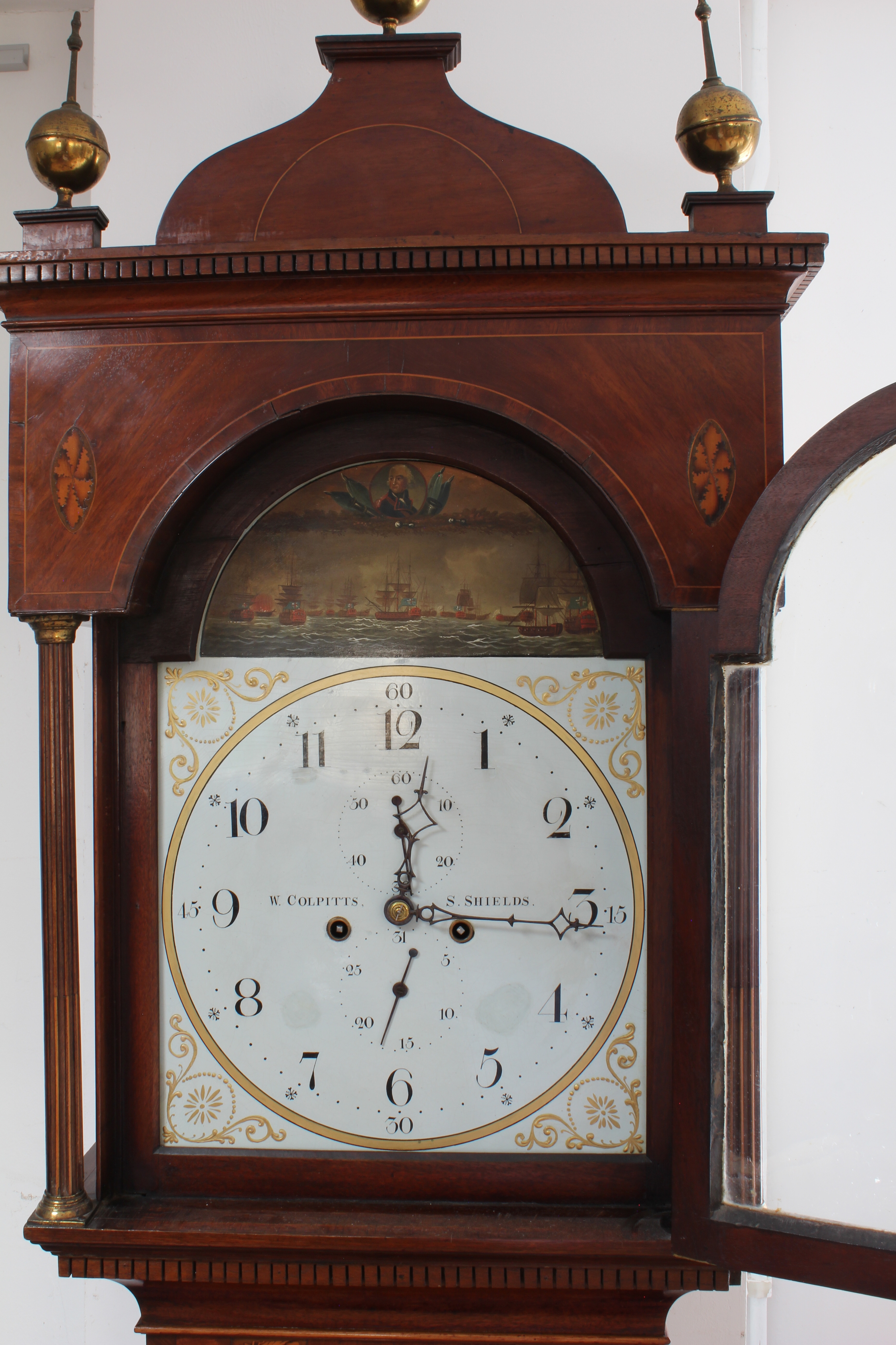 An early 19th century figured mahogany eight-day longcase clock. The 13-inch broken-arch white-painted dial below three gilt-metal spherical finials and a dentil cornice above two marquetry paterae; the dial decorated with a Battle of Trafalgar scene and surmounted with a shoulder-length portrait of Admiral Nelson; Arabic numerals, subsidiary seconds-hand below the 12 o'clock position, date-hand above the 6 o'clock position; signed W. Colepitts - S. Shields. The finely figured and shaped boxwood-strung trunk door centred with a vertical marquetry conch shell and quadrant fleur-de-lys style marquetry spandrels. Figured mahogany box-base on ogee bracket feet. With weights and pendulum. (255 cm high)