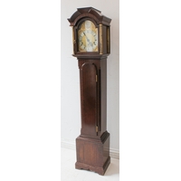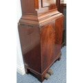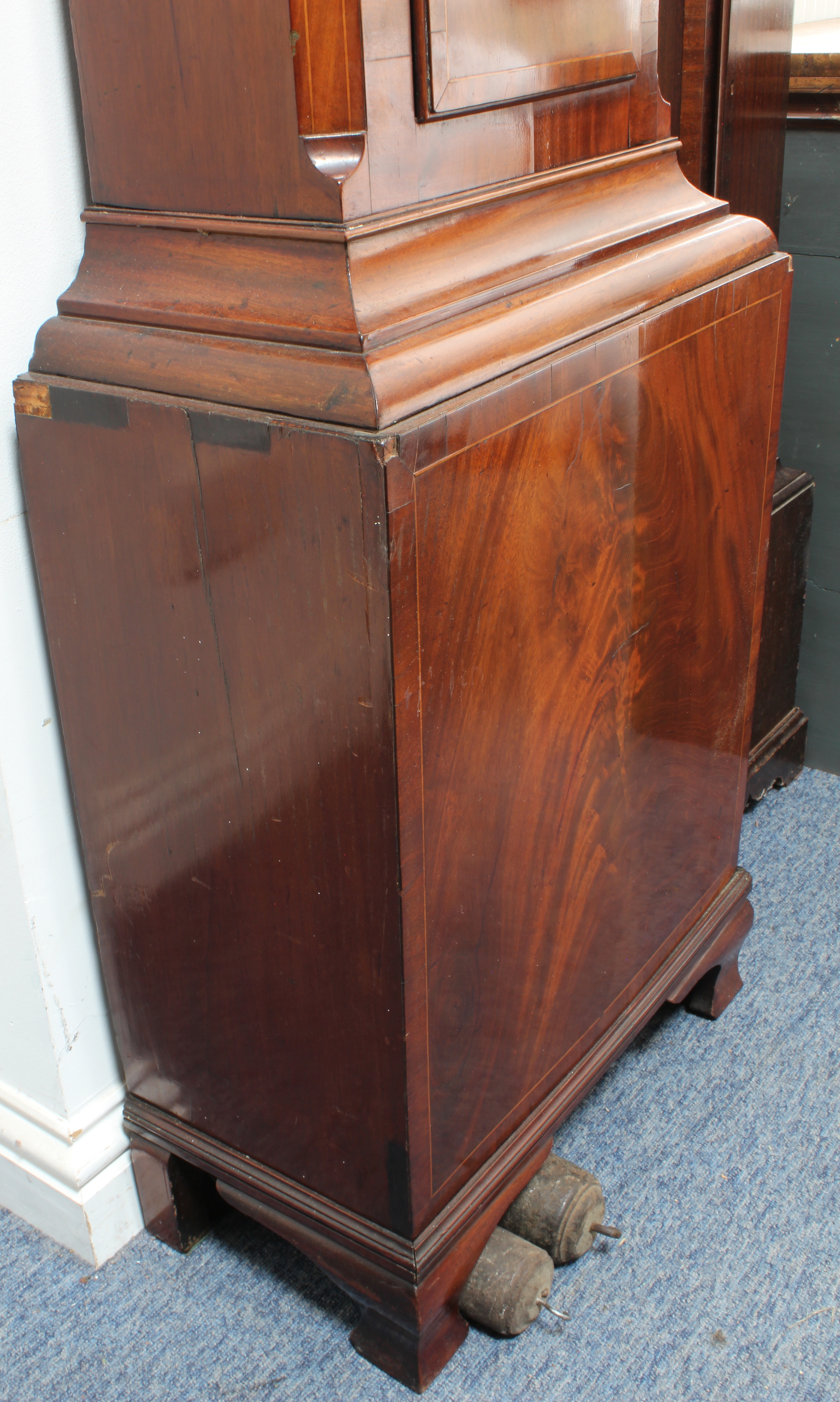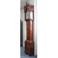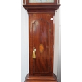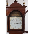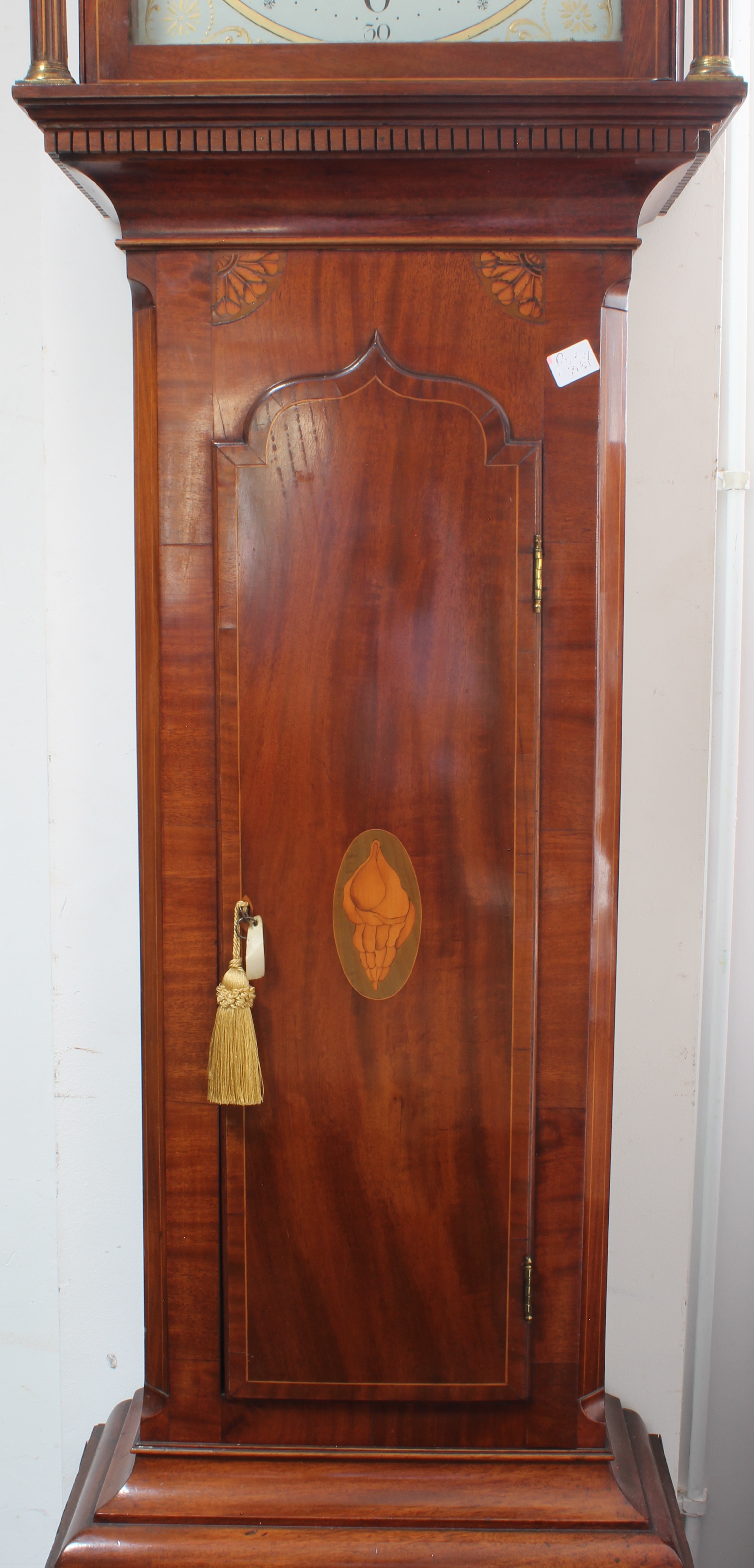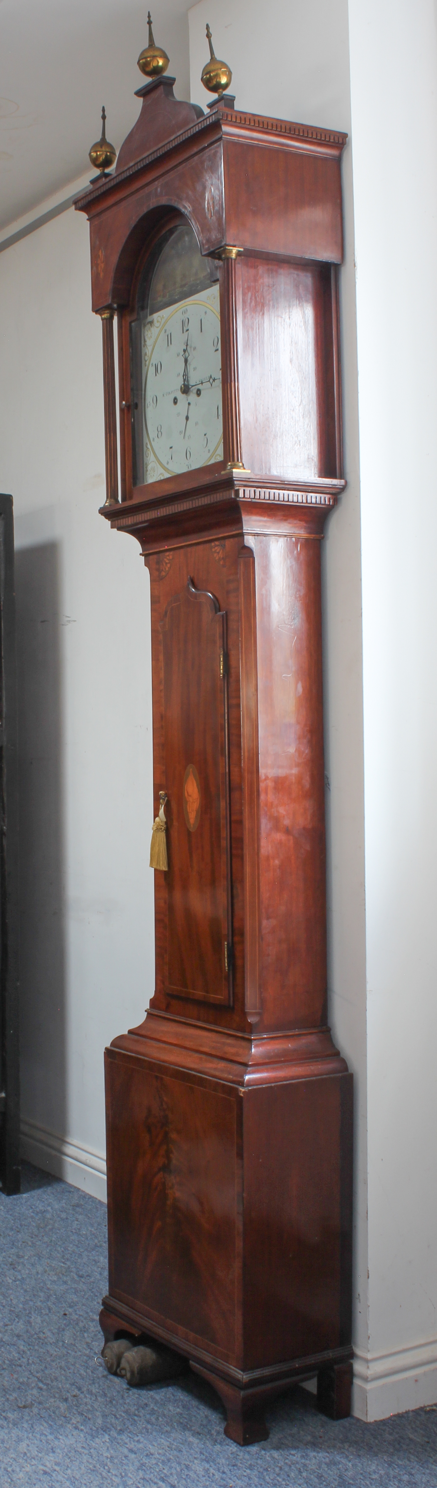 An early 19th century figured mahogany eight-day longcase clock. The 13-inch broken-arch white-painted dial below three gilt-metal spherical finials and a dentil cornice above two marquetry paterae; the dial decorated with a Battle of Trafalgar scene and surmounted with a shoulder-length portrait of Admiral Nelson; Arabic numerals, subsidiary seconds-hand below the 12 o'clock position, date-hand above the 6 o'clock position; signed W. Colepitts - S. Shields. The finely figured and shaped boxwood-strung trunk door centred with a vertical marquetry conch shell and quadrant fleur-de-lys style marquetry spandrels. Figured mahogany box-base on ogee bracket feet. With weights and pendulum. (255 cm high)