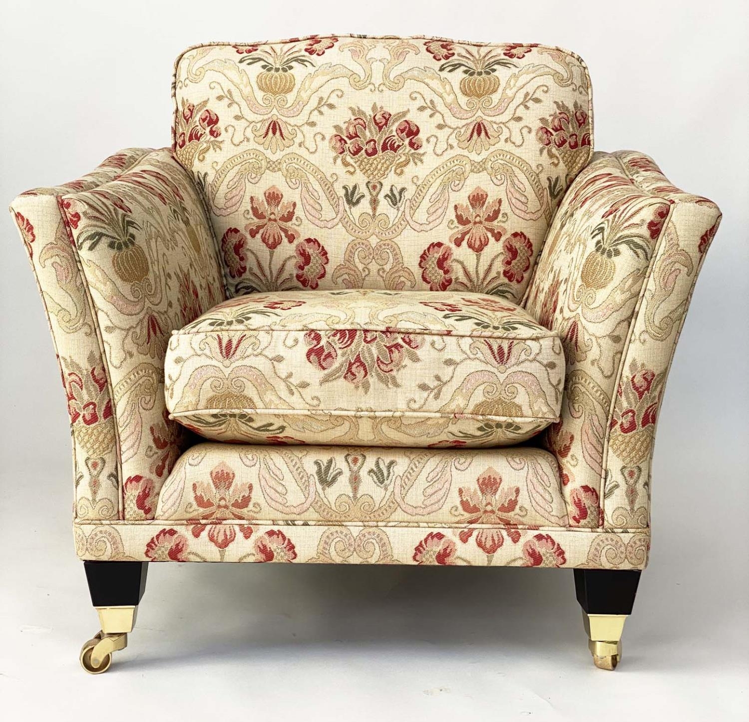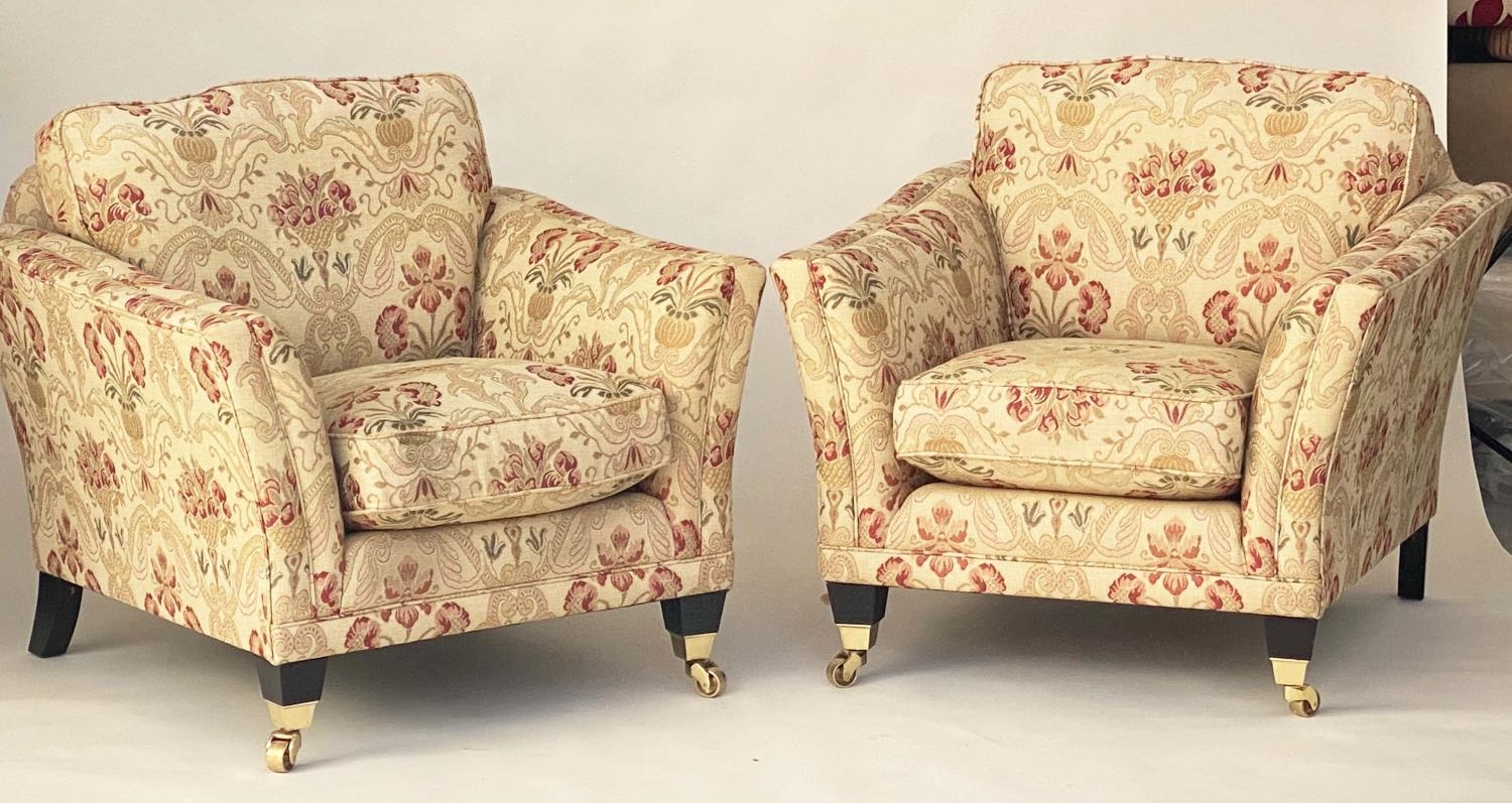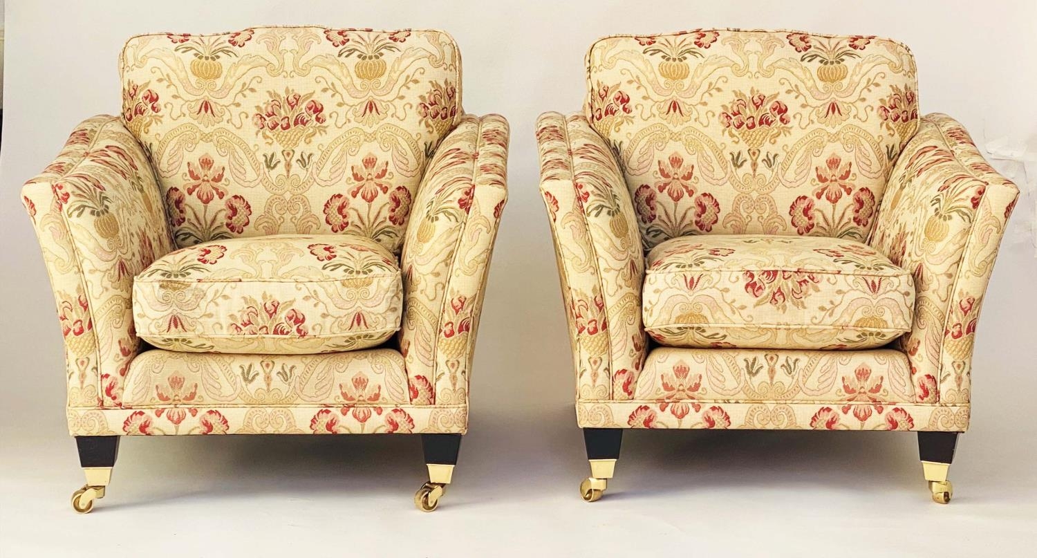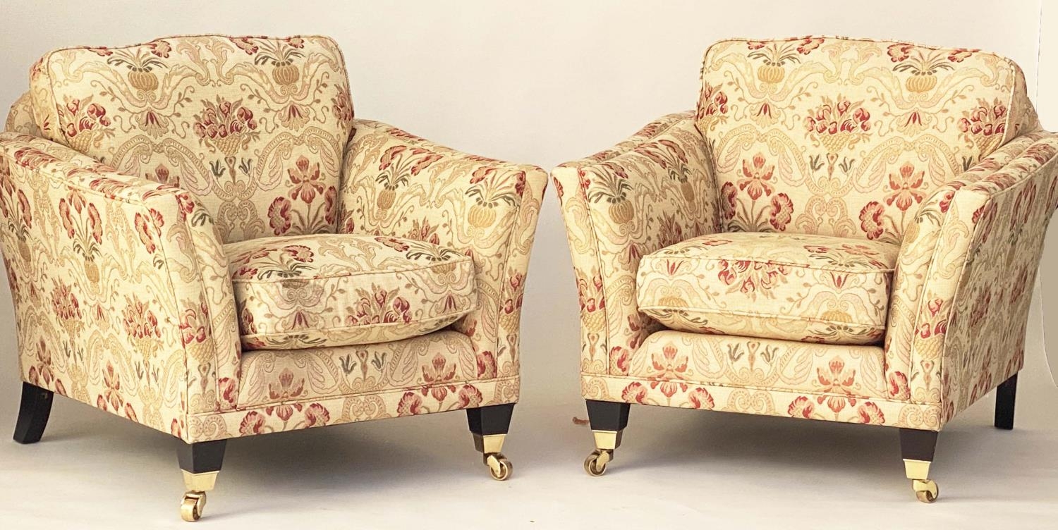ARMCHAIRS, a pair, tapestry weave upholstered with square outswept arms and tapering square supports with castors. (2)