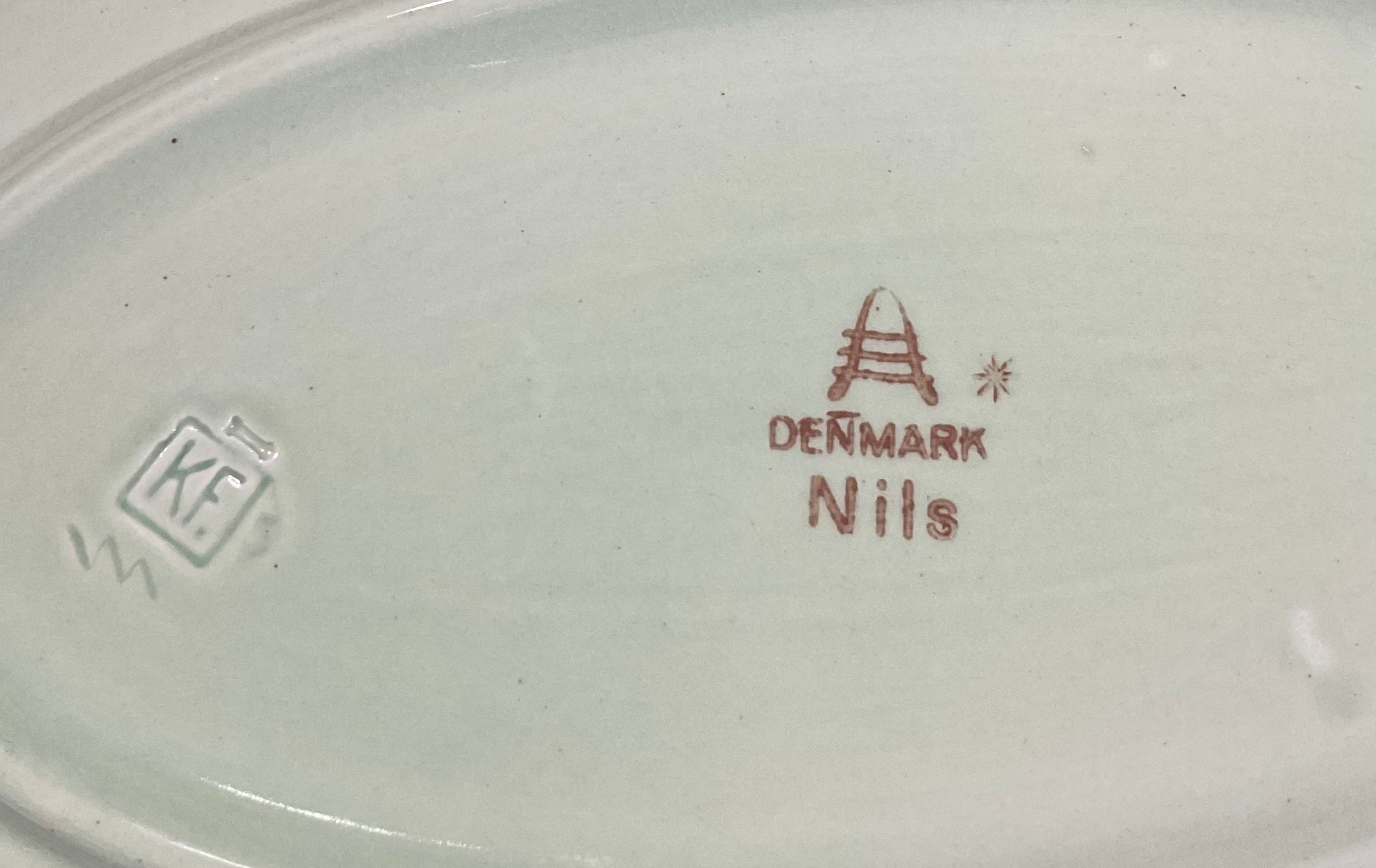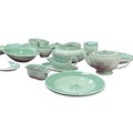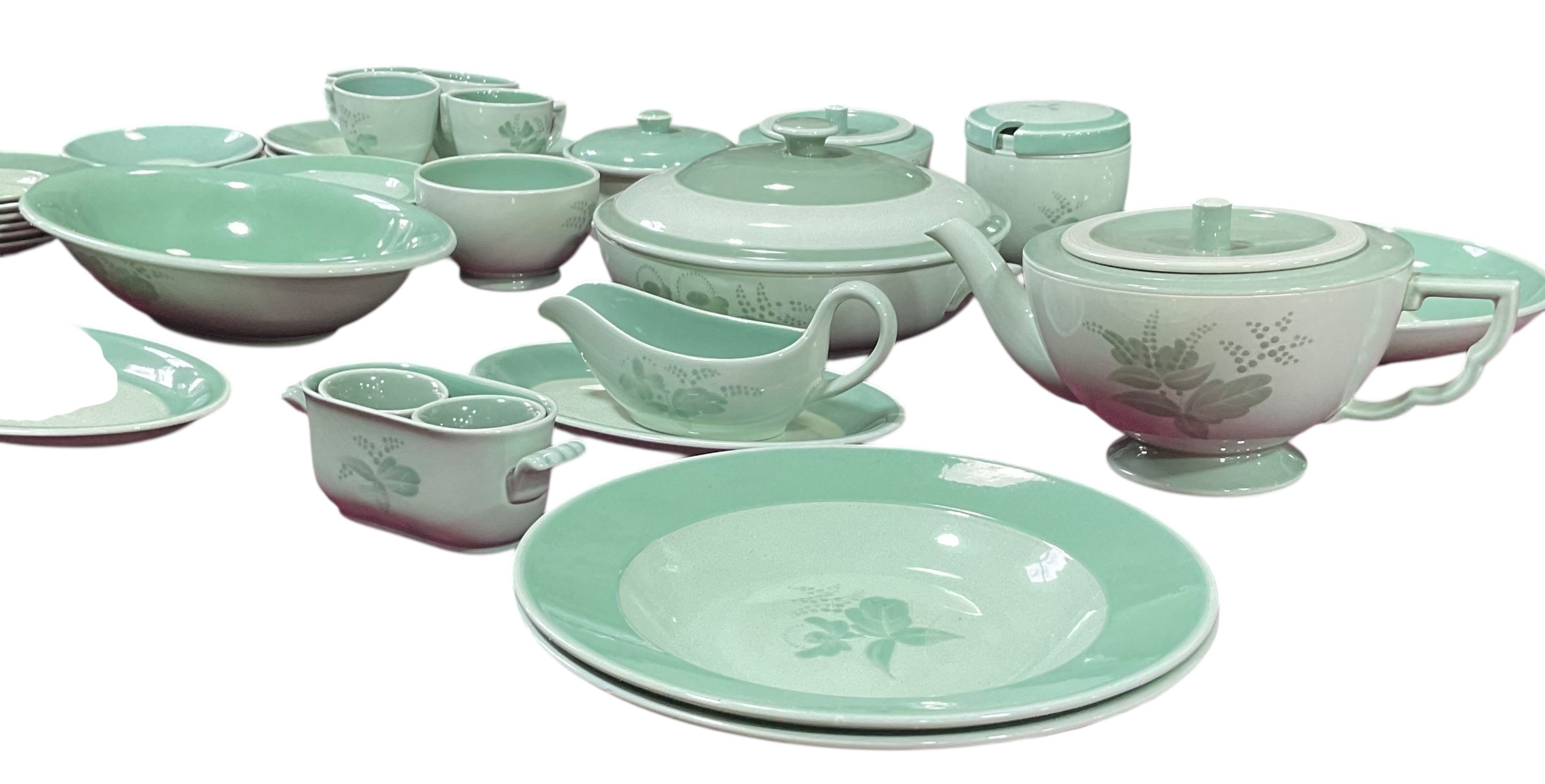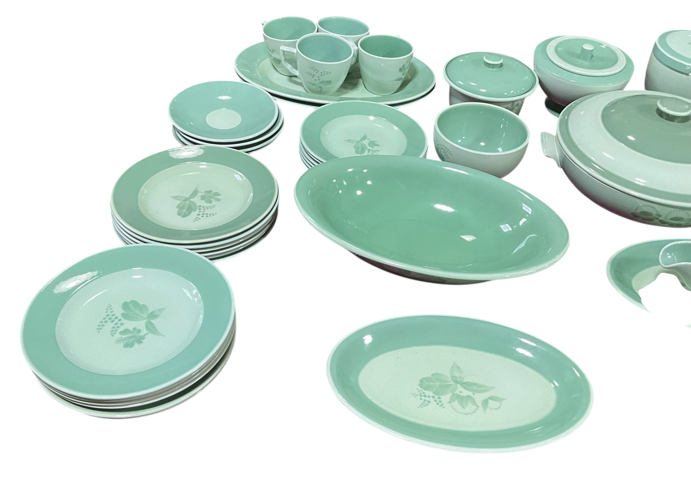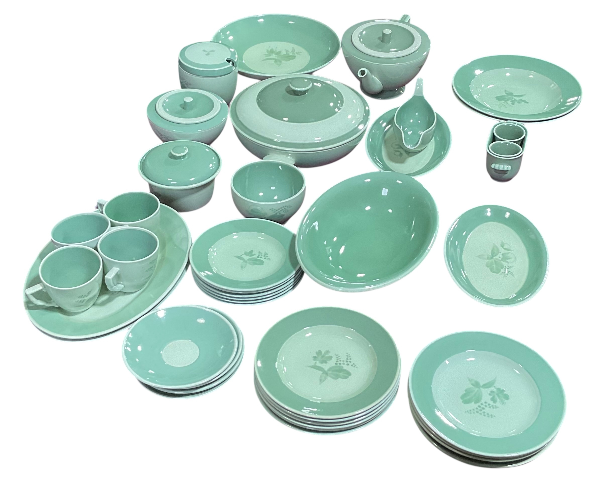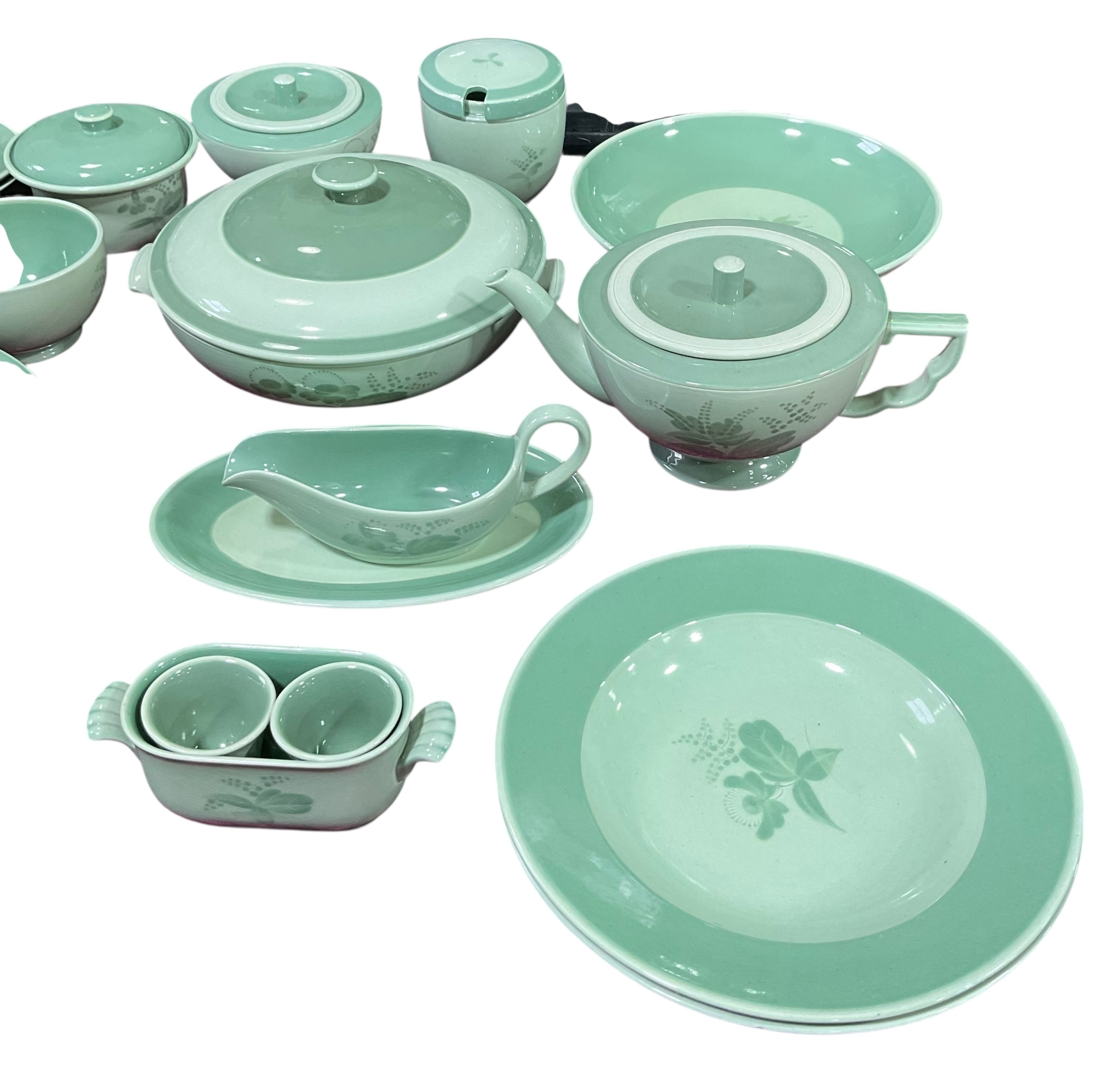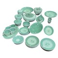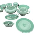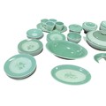 A quantity of Royal Copenhagen Nils tableware with green rim and floral centre on celadon ground.