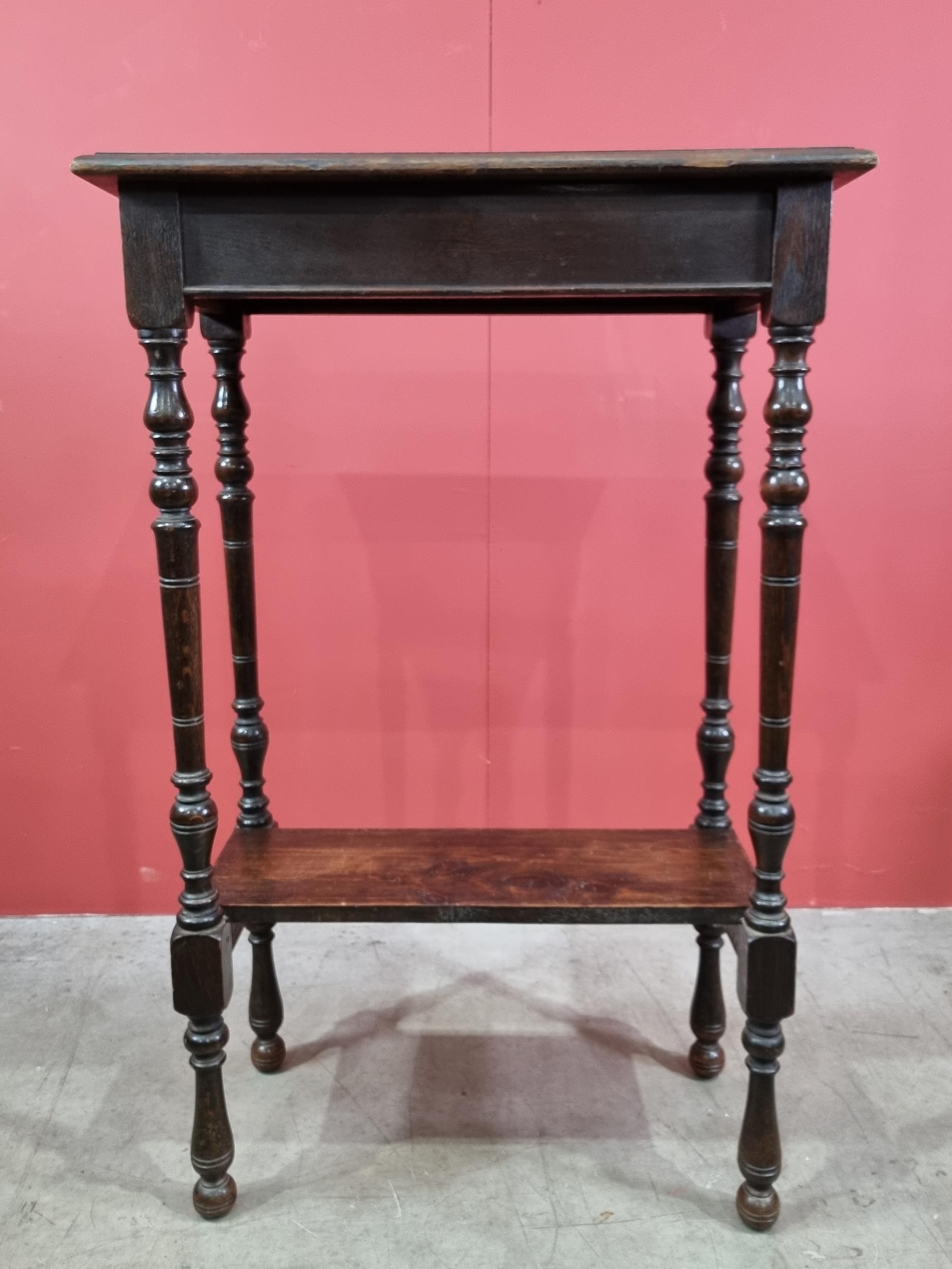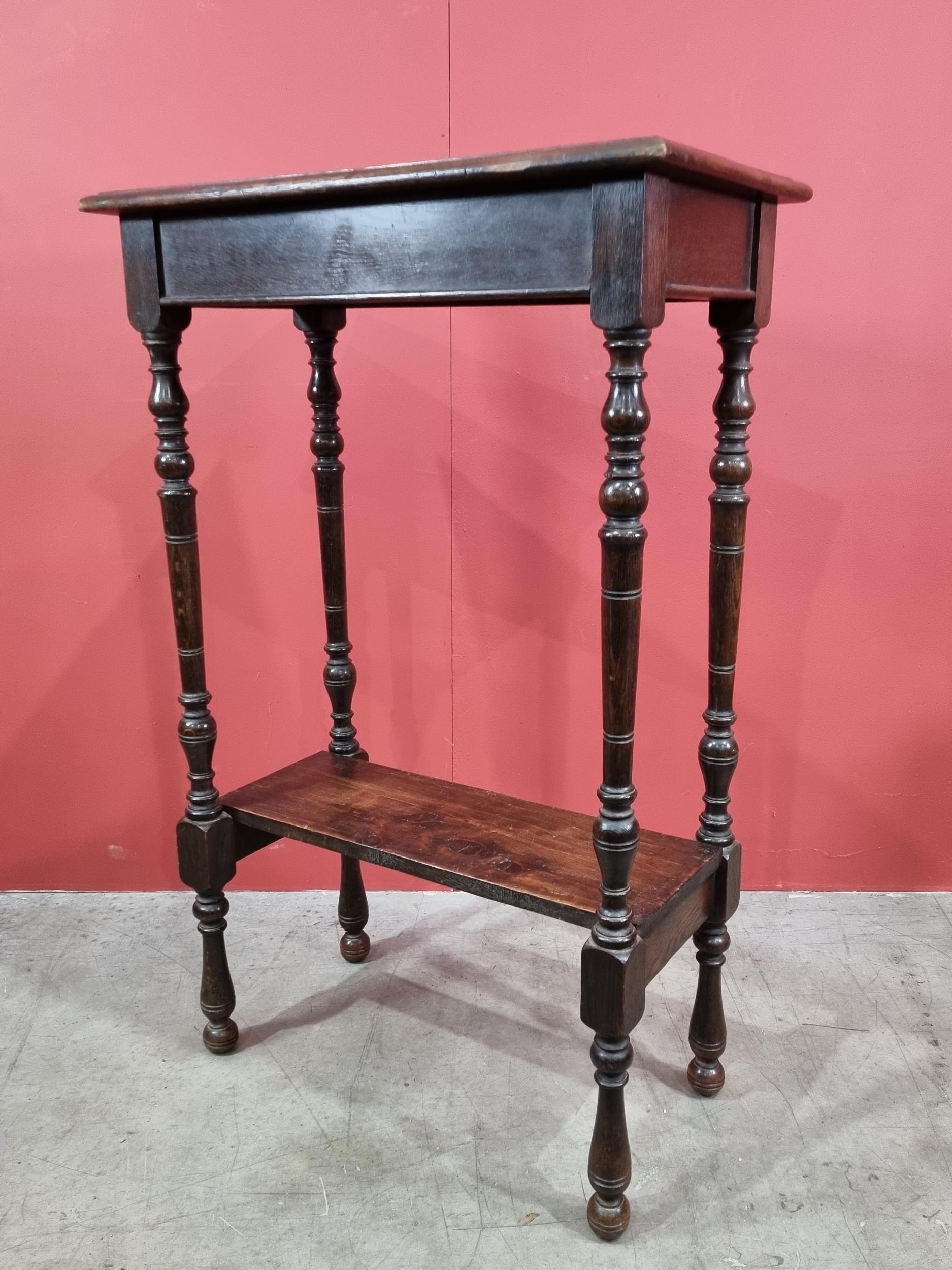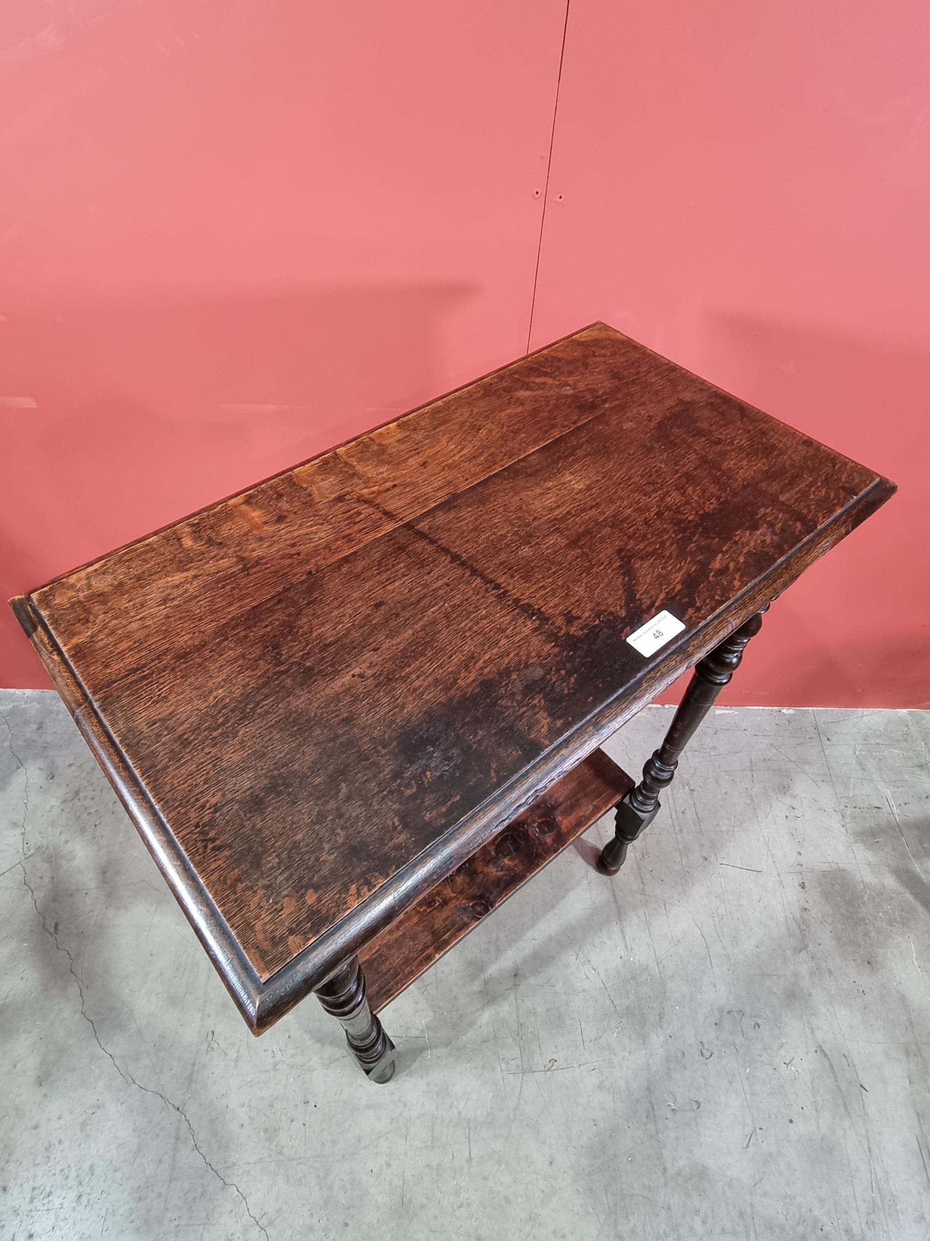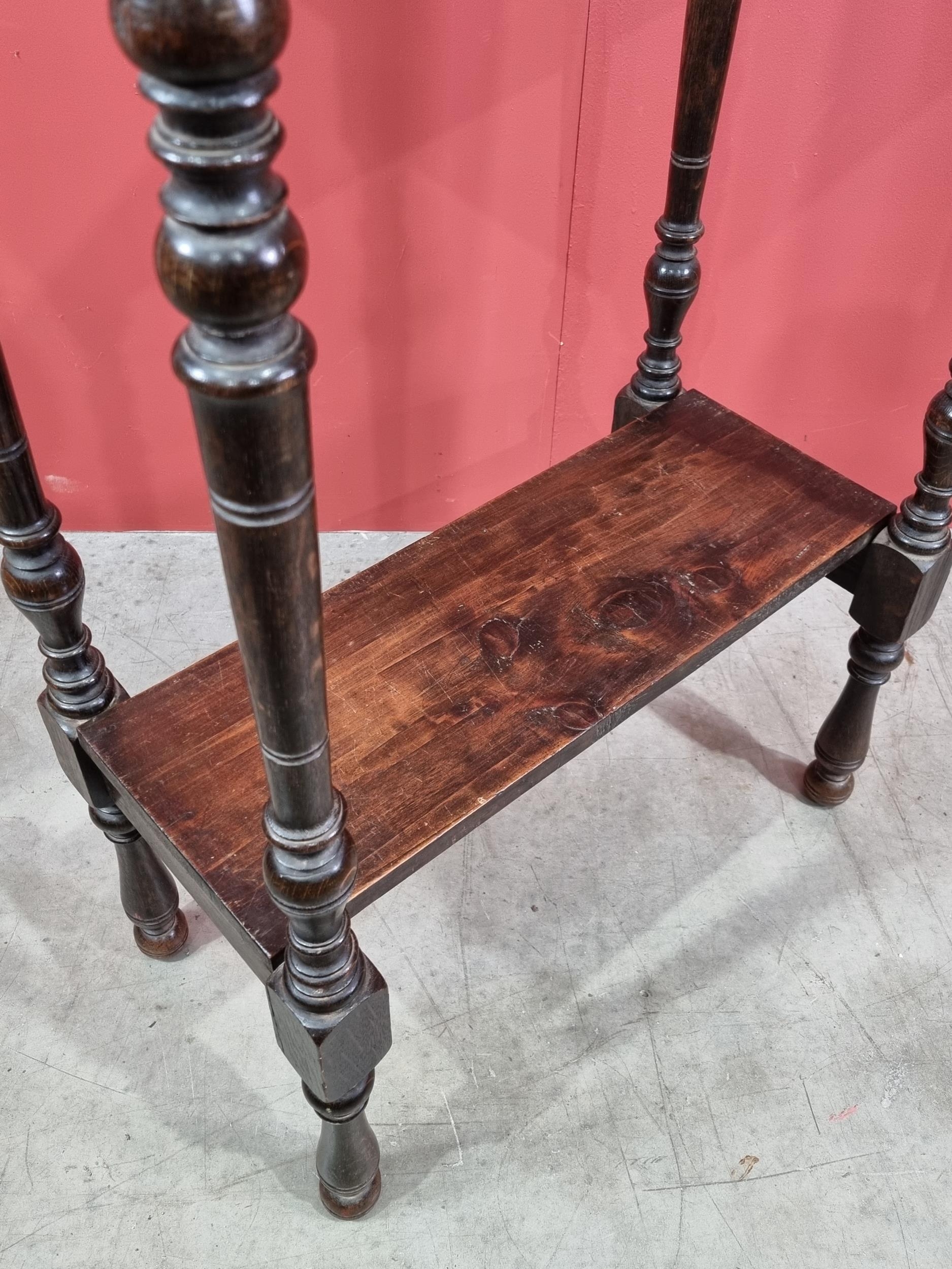 An oak two-tier Stand, with moulded top, raised on turned supports, 42in H x 27in W x 15in D, (R3)