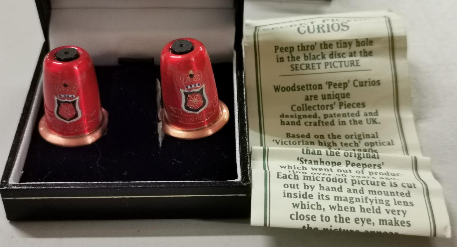 Pair of Woodsetton secret picture curio peep thimbles to commemorate the Queens 80th birthday