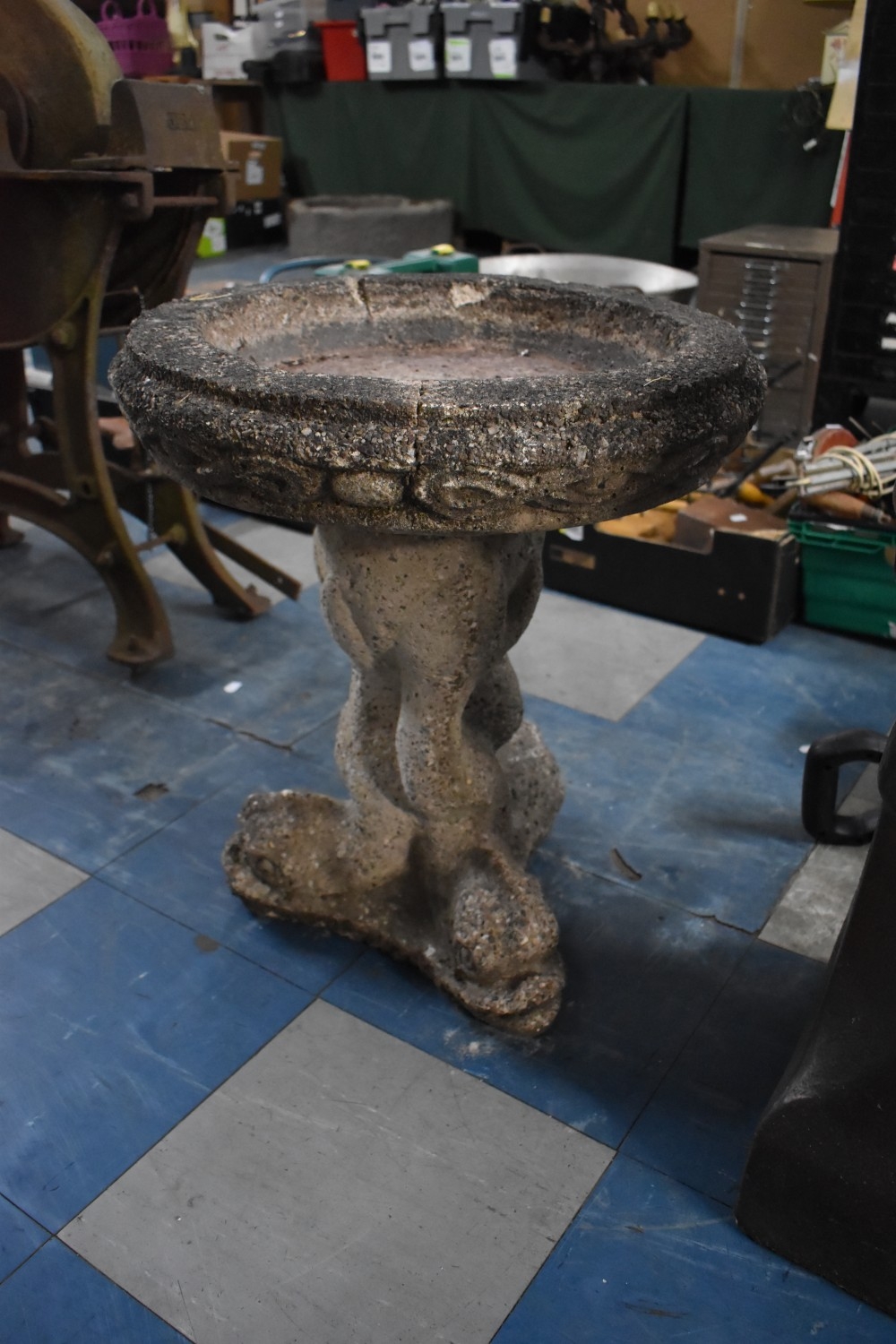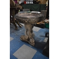A Reconstituted Stone Circular Birdbath, Tripod Dolphin Supports, 50cms Diameter and 55cms High