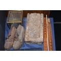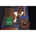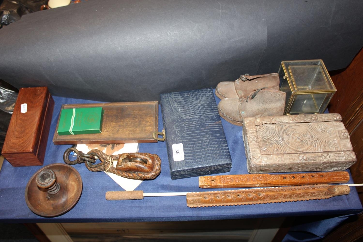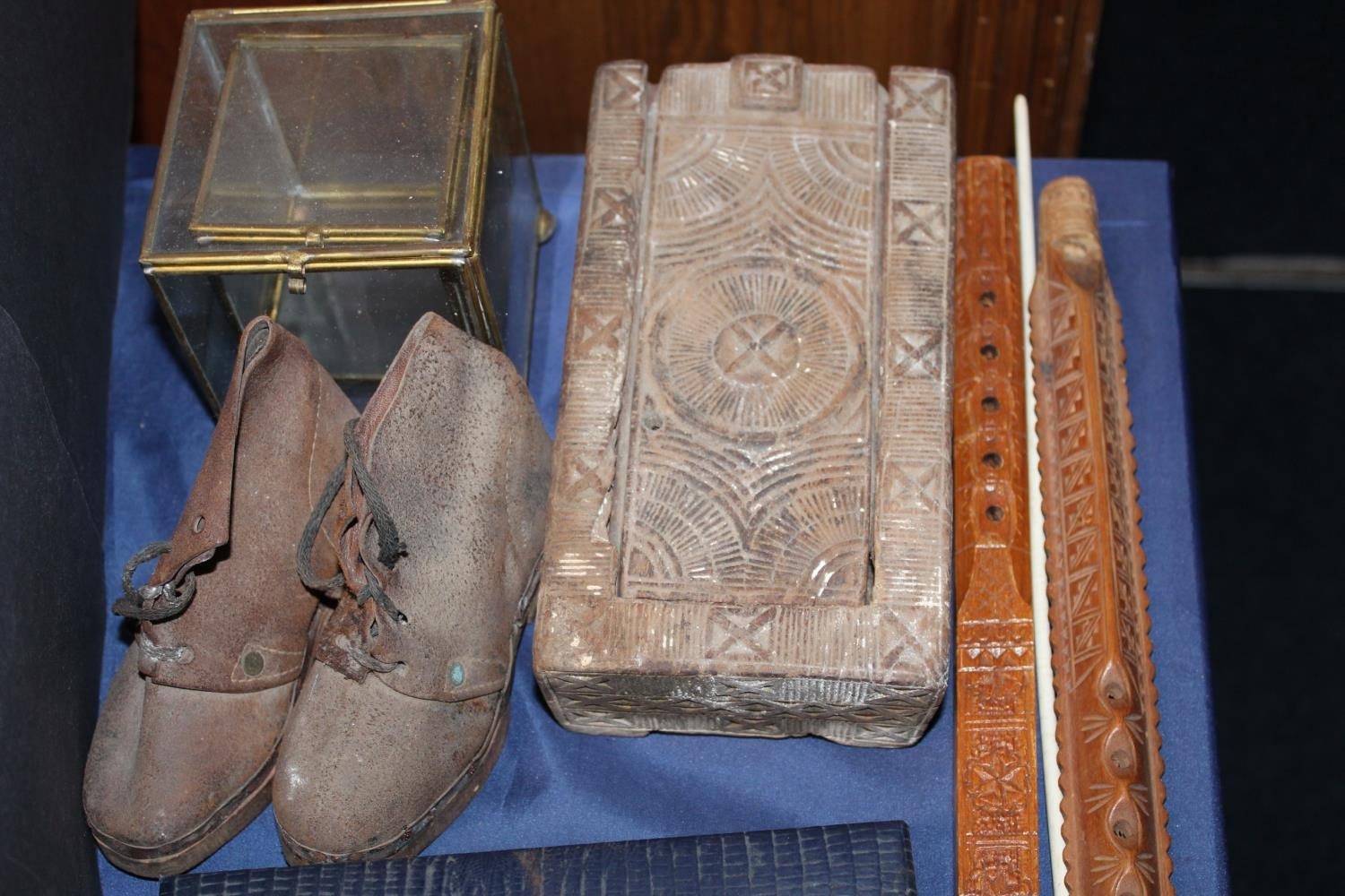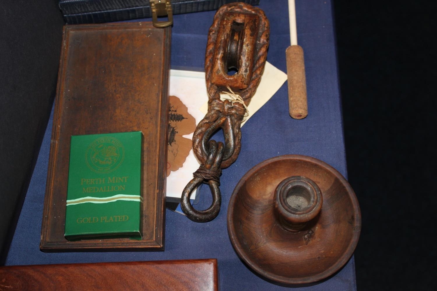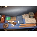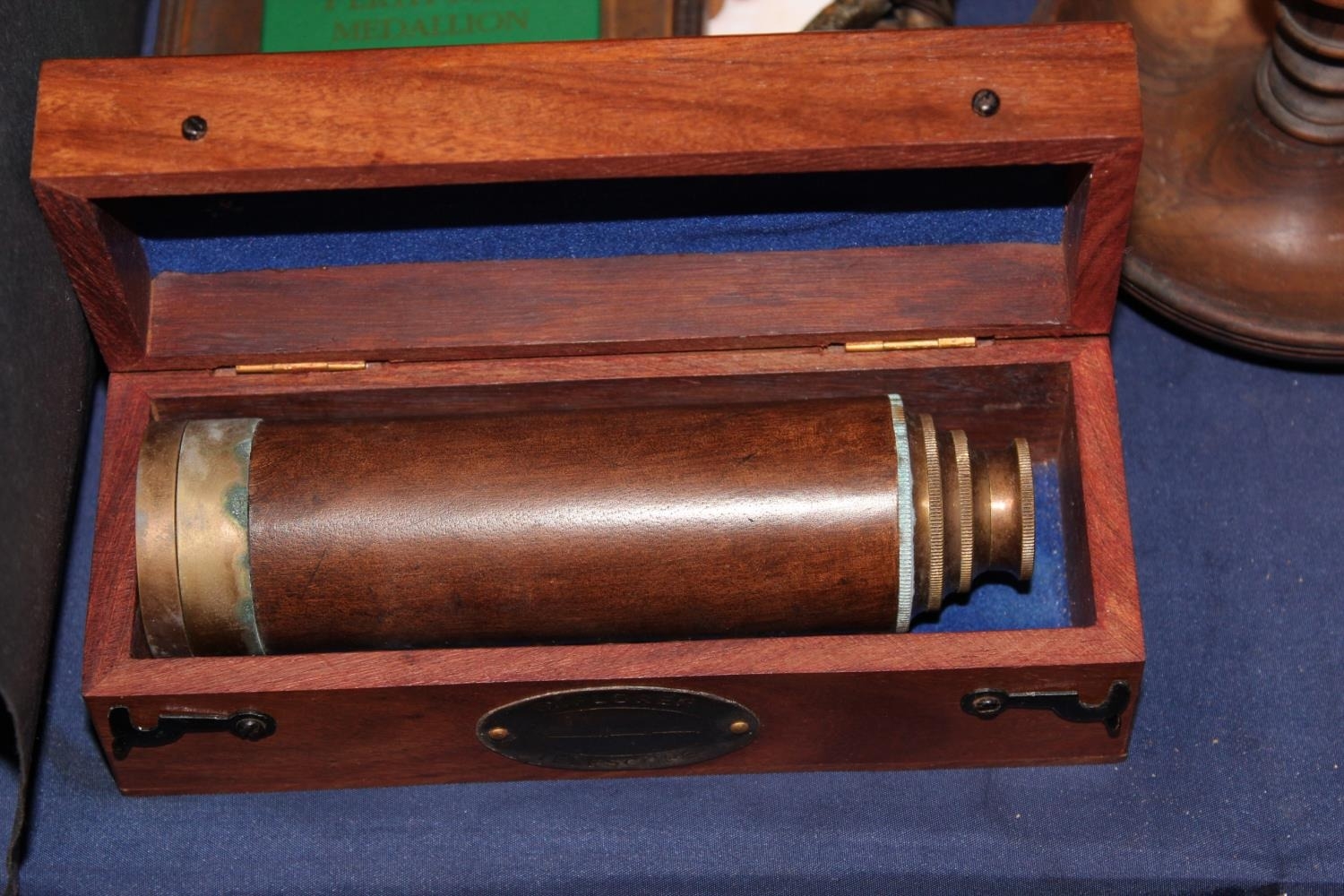 Perth Mint medallion, a domino set, a boxed reproduction telescope, miniature leather shoes, etc.