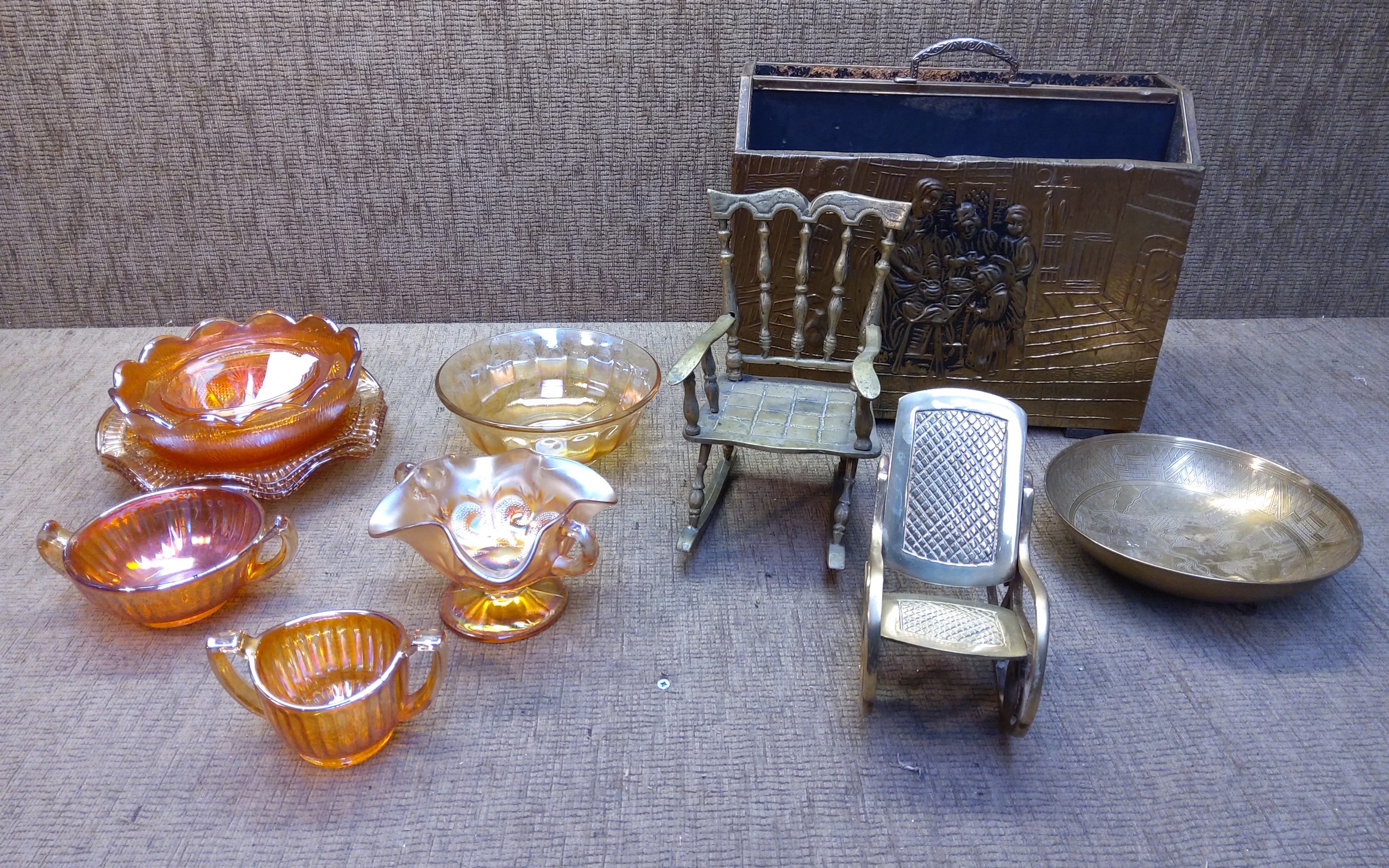 Collectable carnival glass bowls/dishes and solid brass chairs and letter rack.