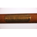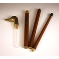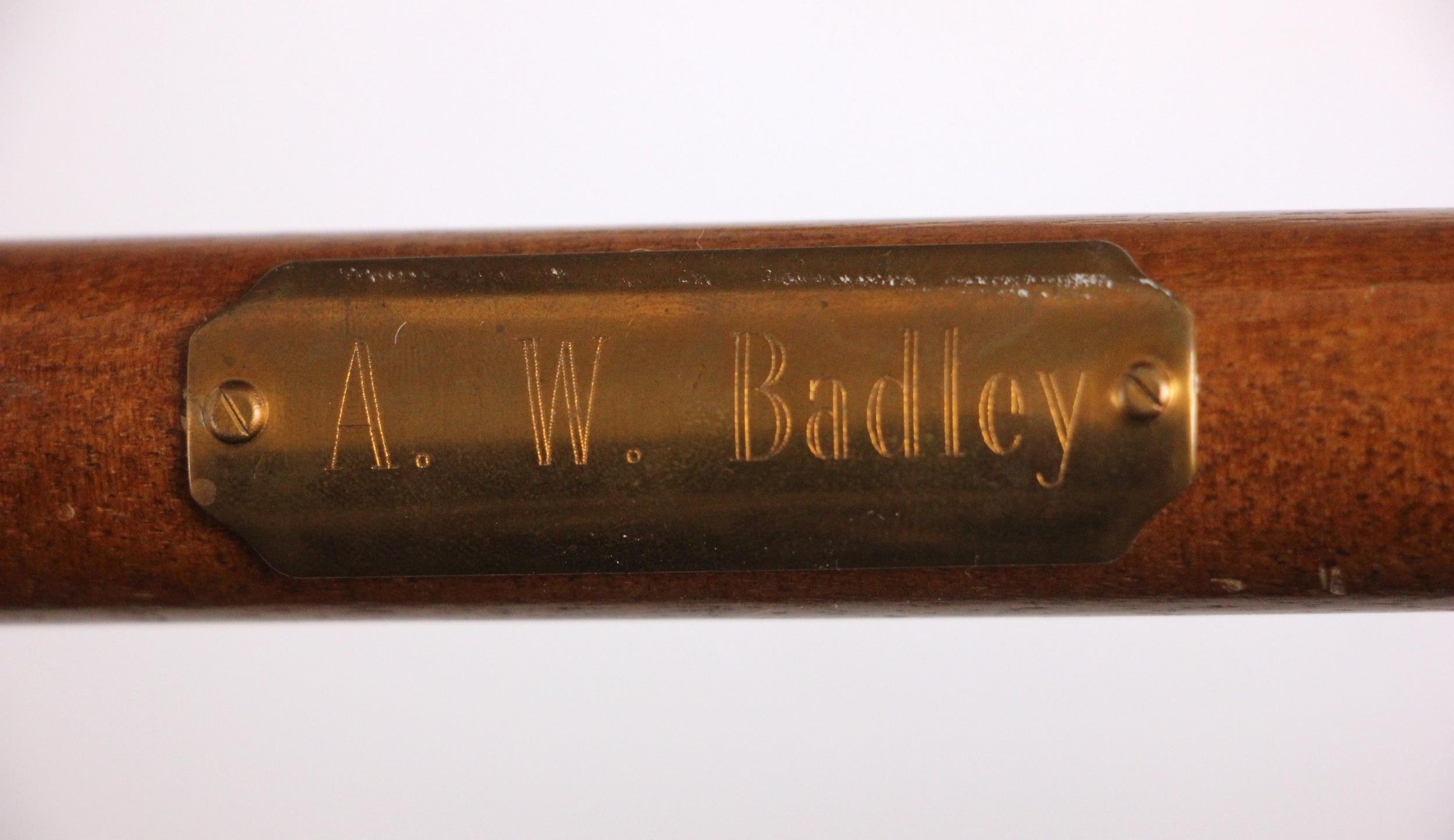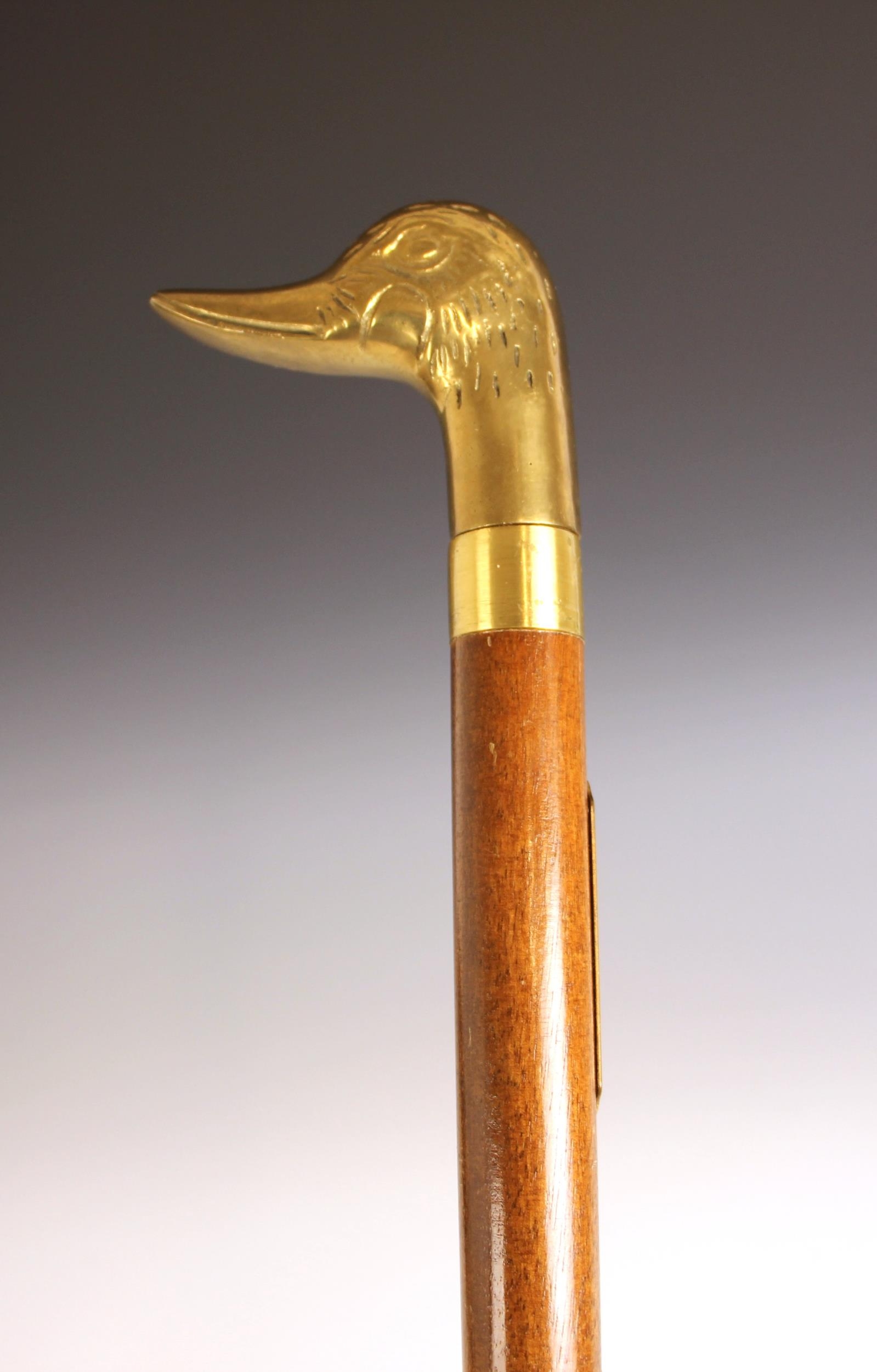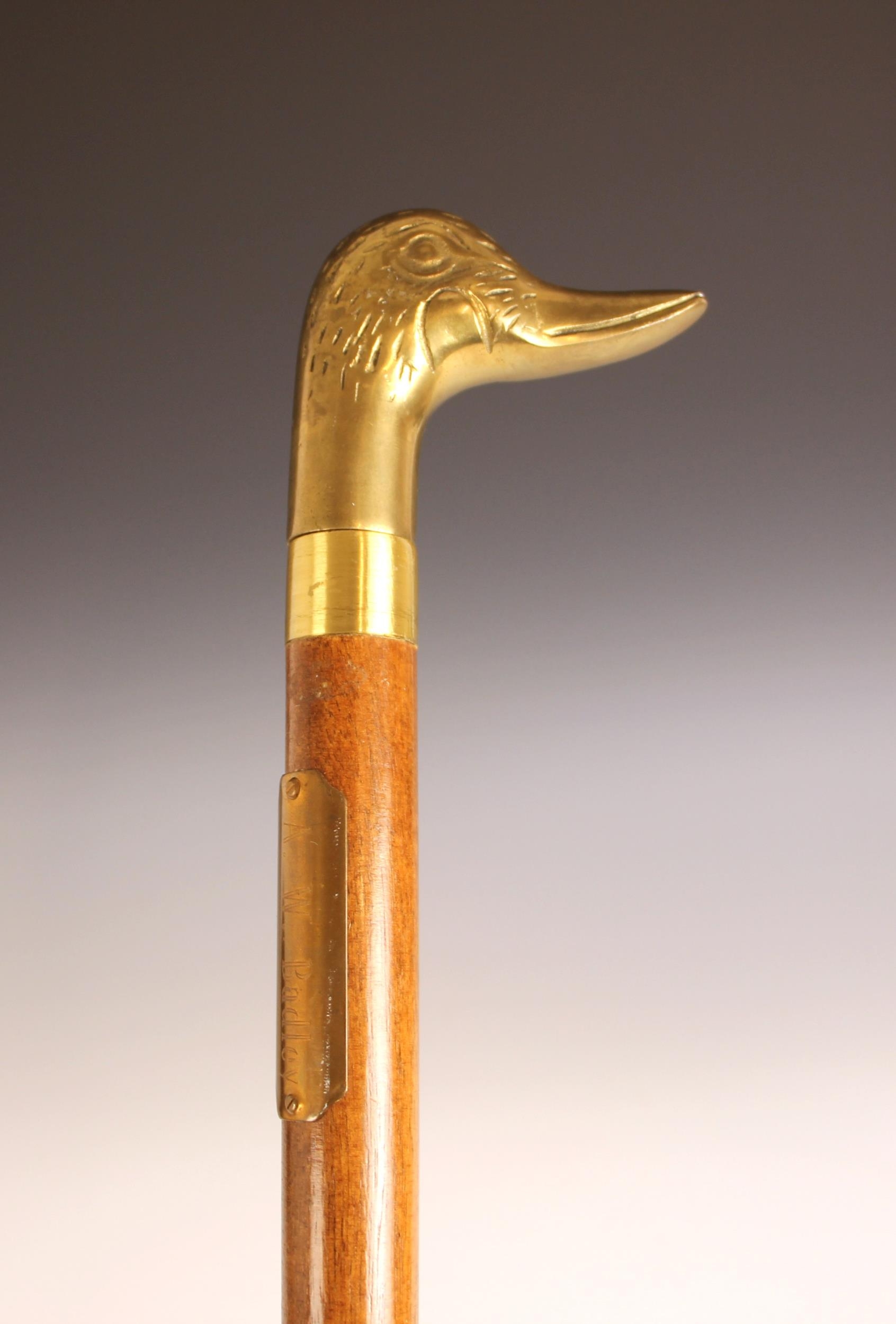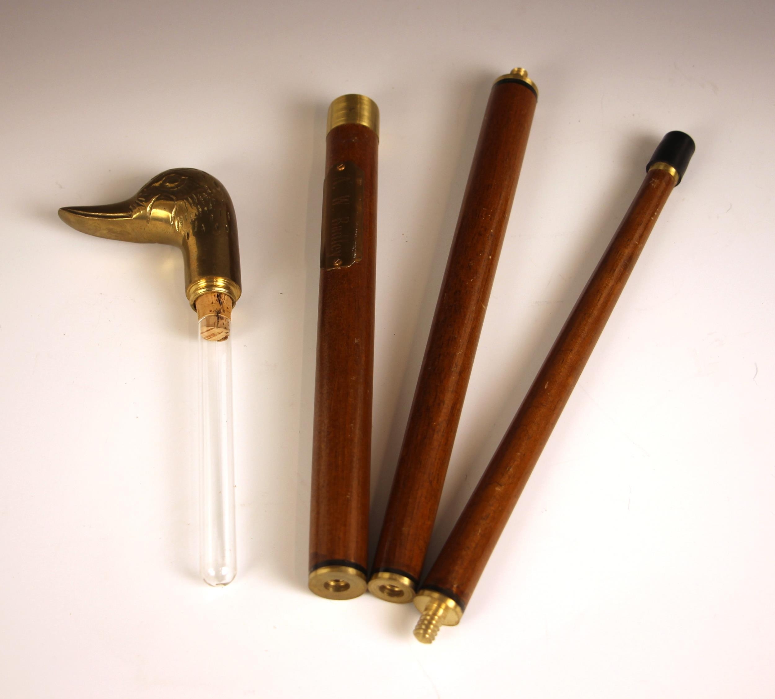 A brass mounted tippling cane or tippler, early 20th century, the handle modelled as a duck's head concealing a 13cm long glass phial in sprung compartment, the cane formed of three screw-in sections, the topmost with copper plaque engraved 'A. W. Badley', 88cm long overall