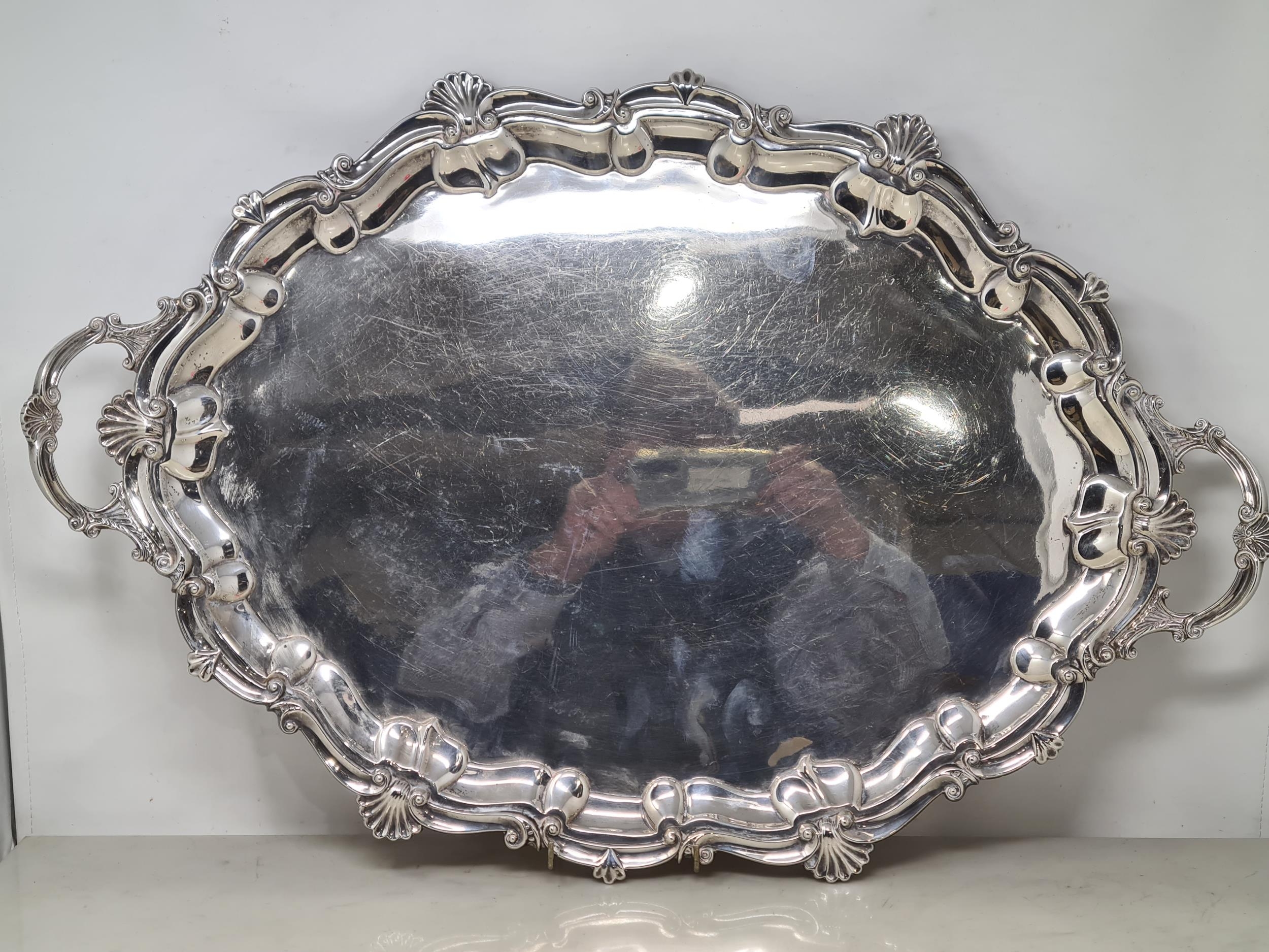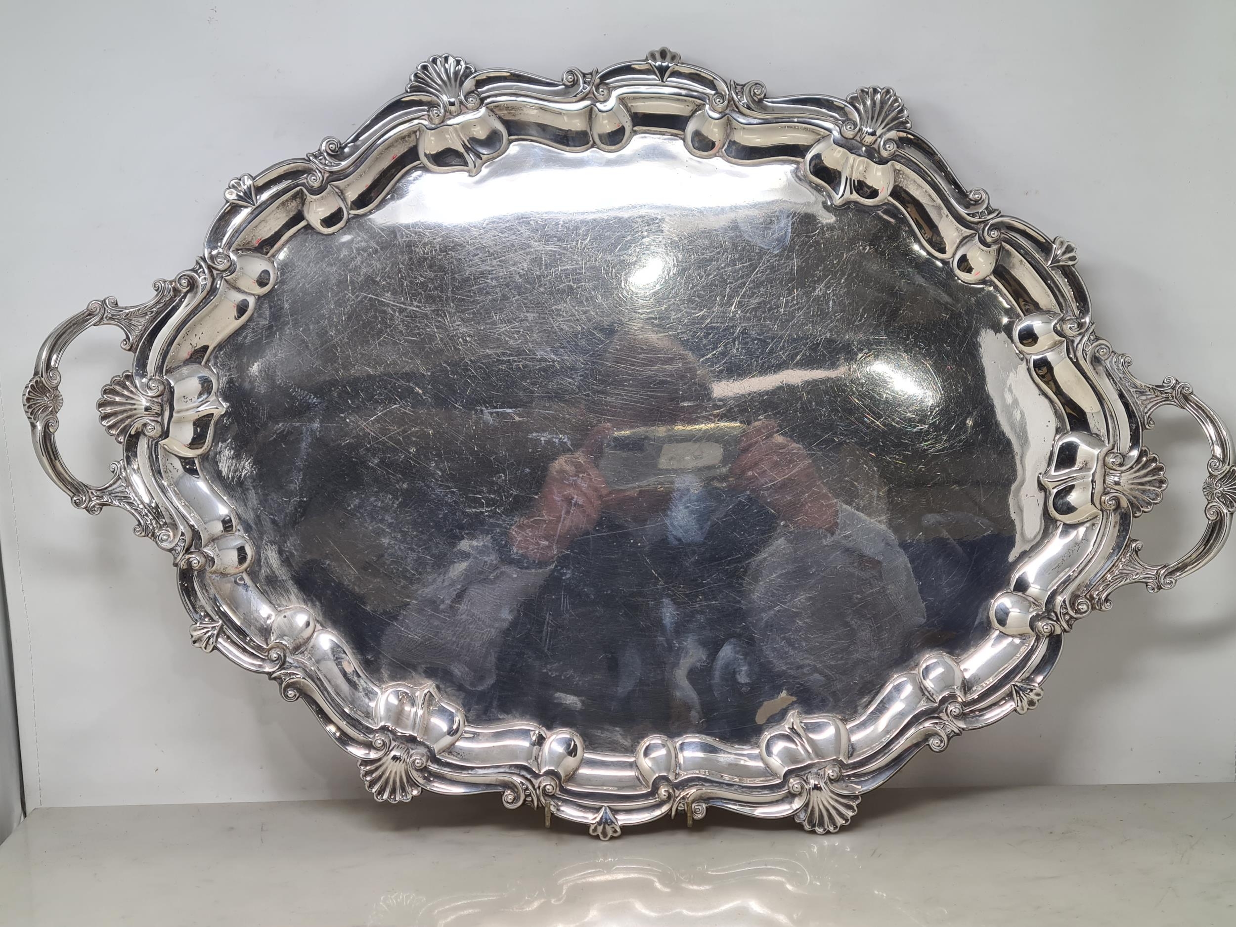 An Edward VII silver large shaped oval two handled Tea Tray with scallop and scroll border on scroll feet, London 1903, 26in, 3200gms