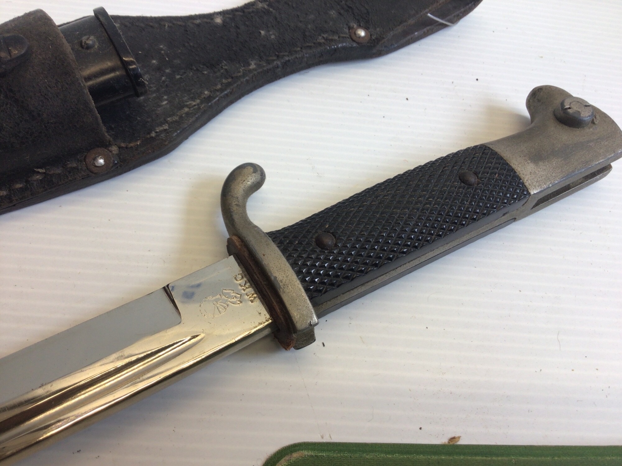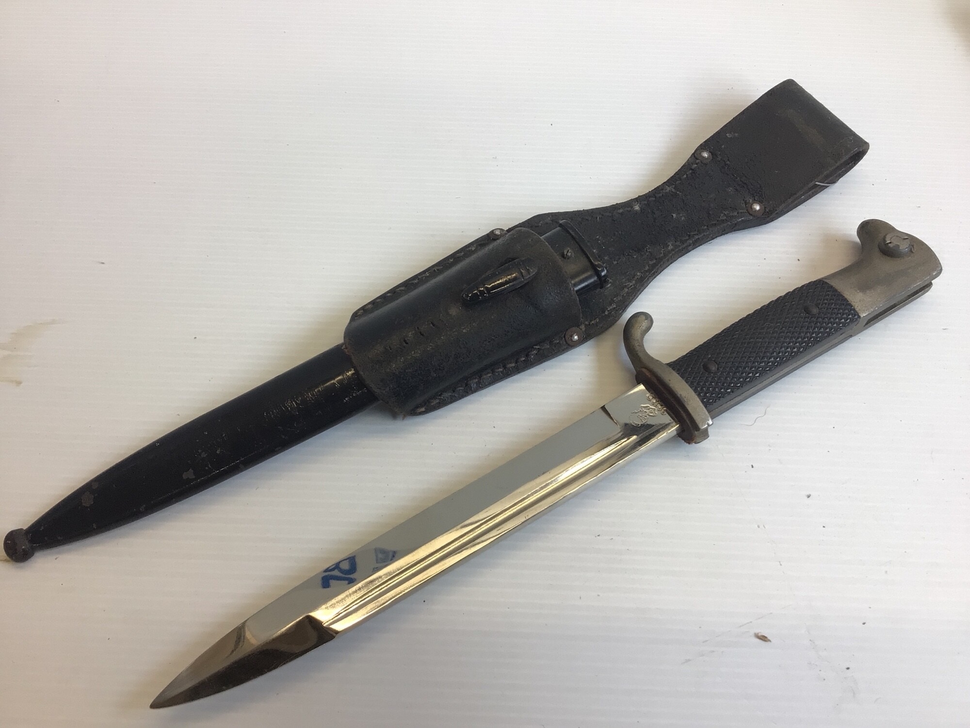 A German Third Reich K98 dress bayonet makers stamp WKC with a leather frog.