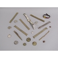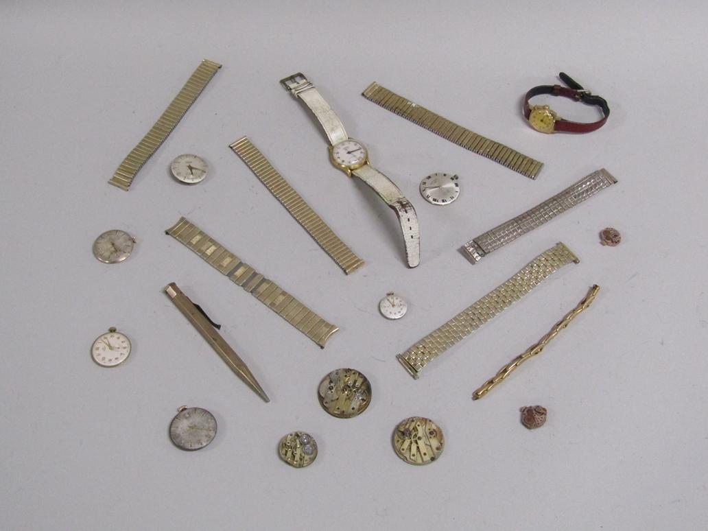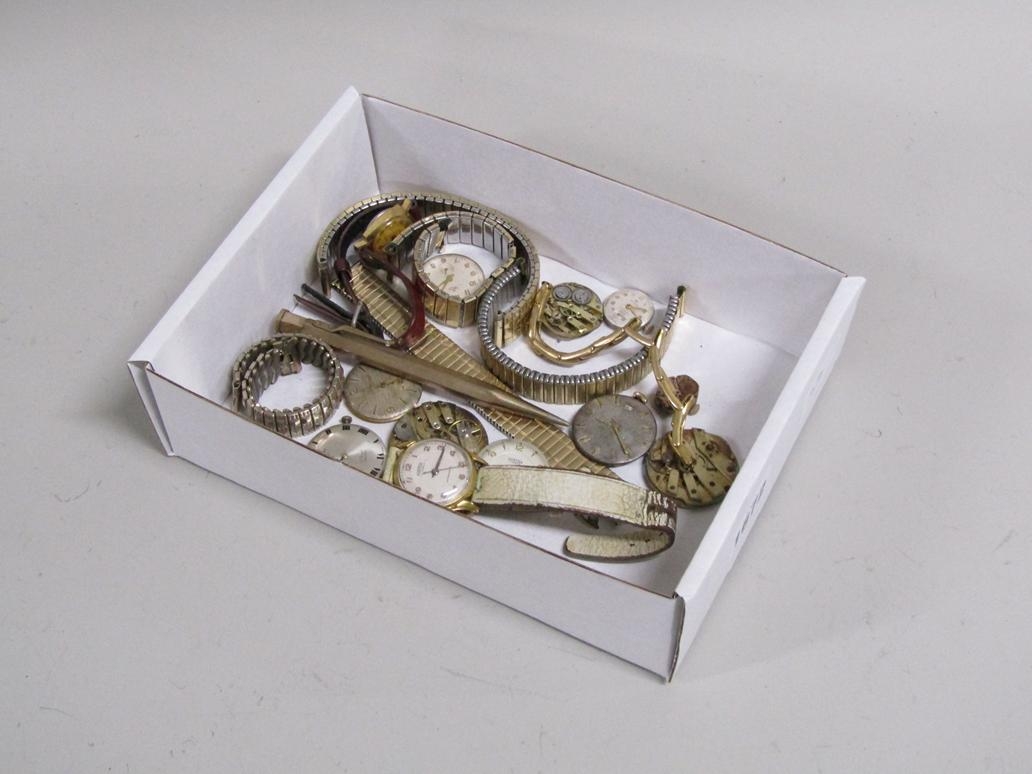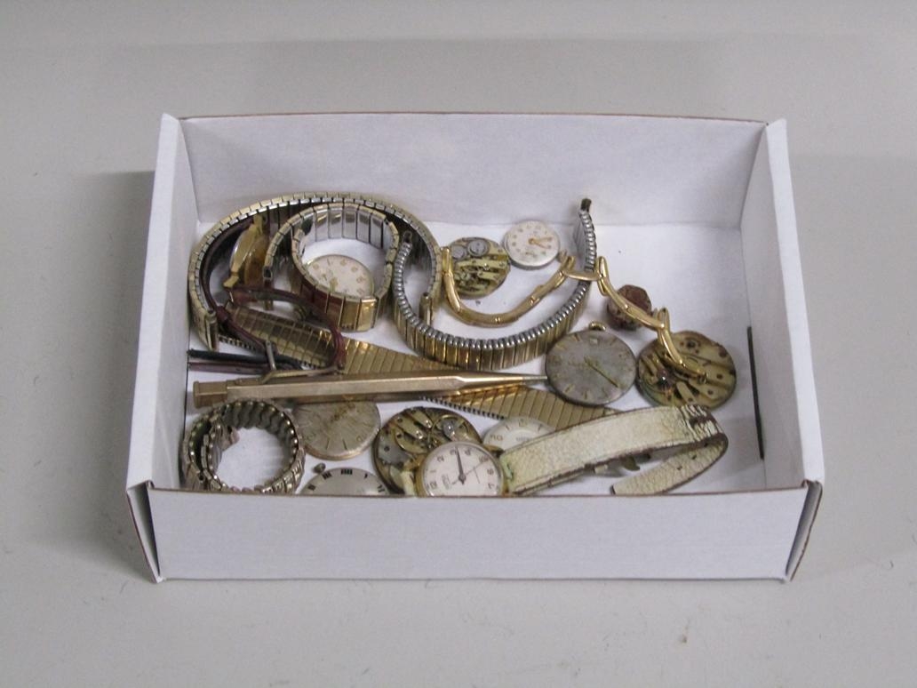 BOX OF WRISTWATCH MOVEMENTS, GOLD PLATED PROPELLING PENCIL, WATCH STRAPS ETC