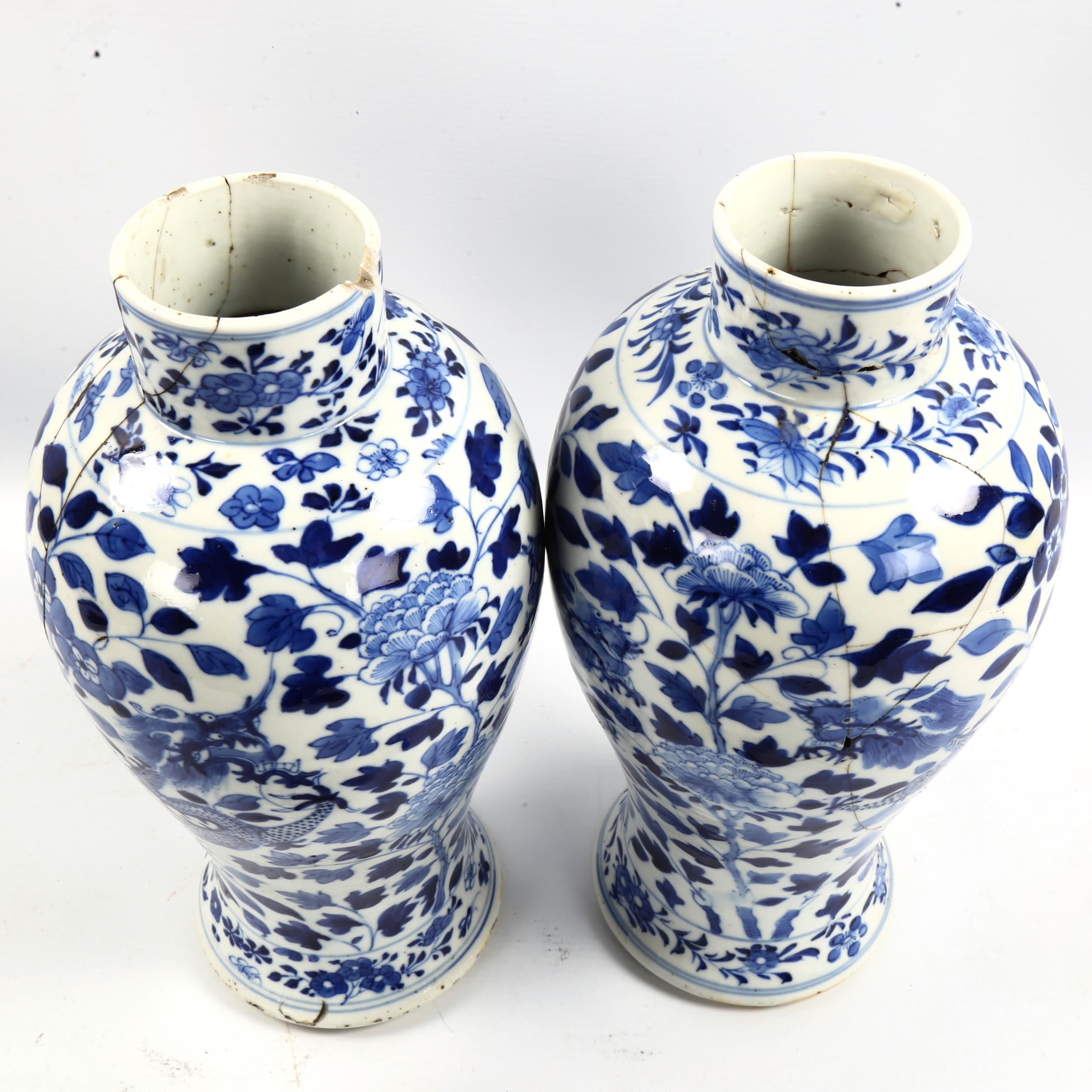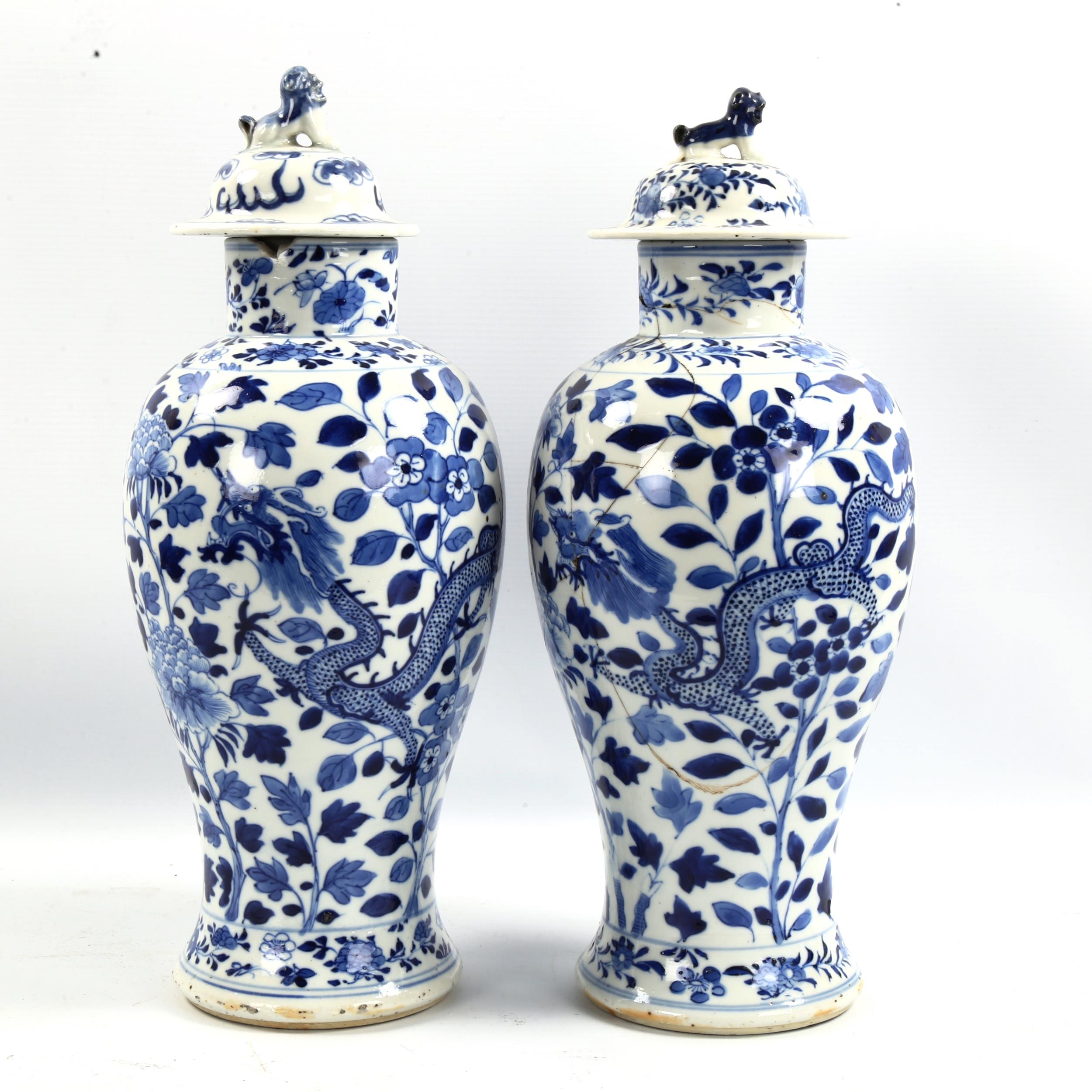 A pair of 19th century Chinese blue and white porcelain jars and covers with dragon decoration, 4 character marks, height 37cm, both damaged and repaired