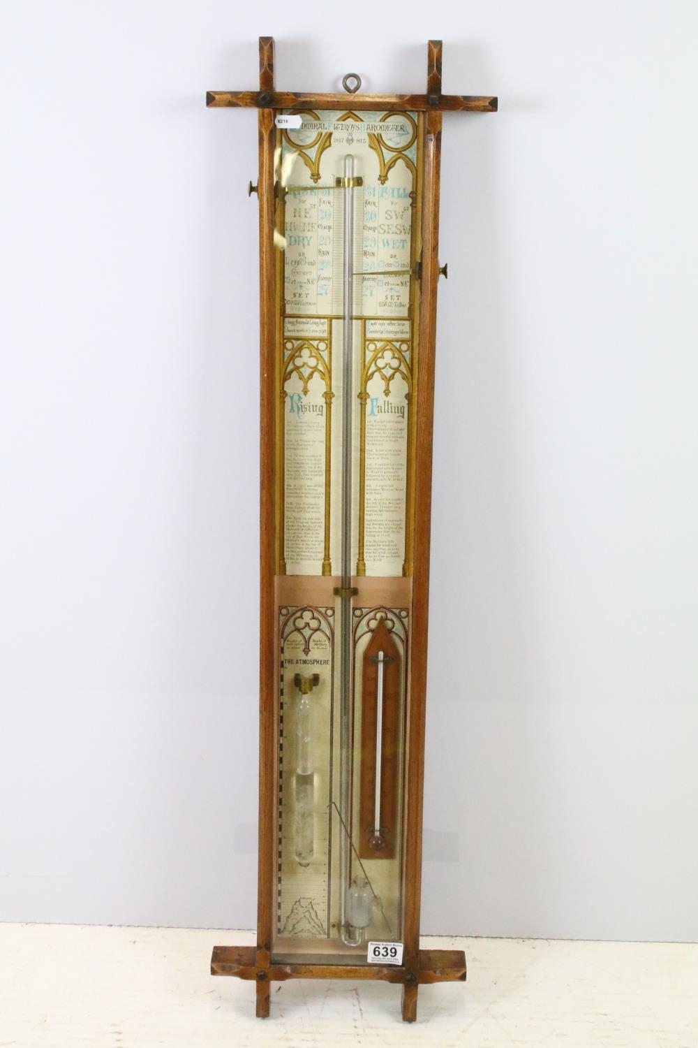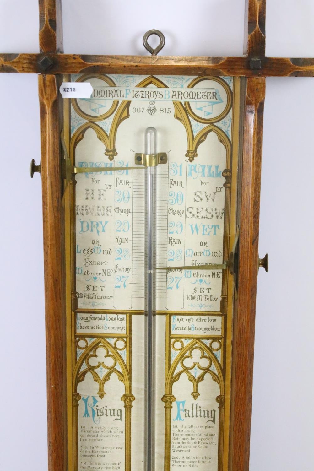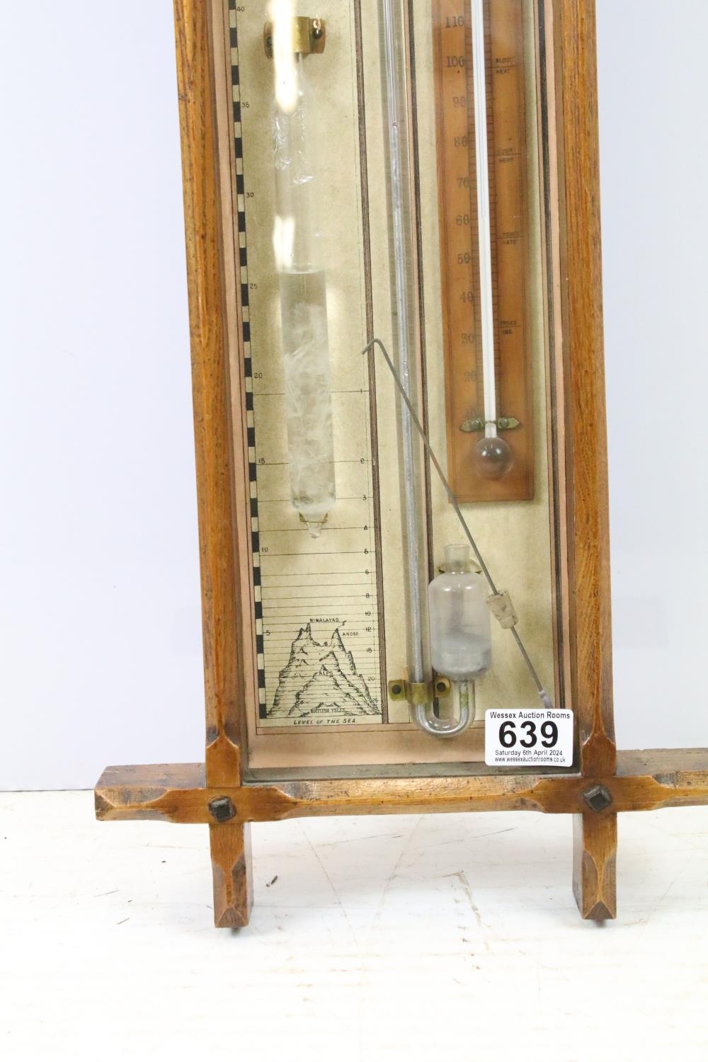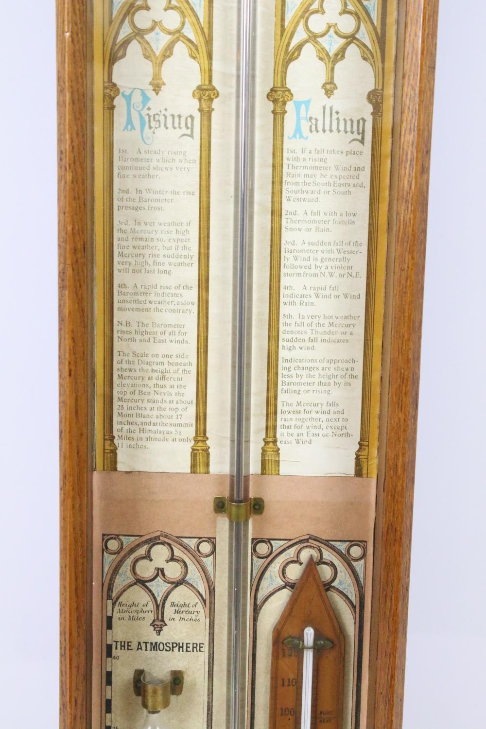 Early 20th century oak cross framed Admiral Fitzroys barometer, with paper dial, the sides with twin adjustable pointers, 104cm high