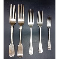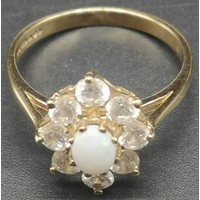 9ct Gold Sapphire ring, the central small sapphire with a border, round cut stones and a small round cut sapphire to each shoulder.