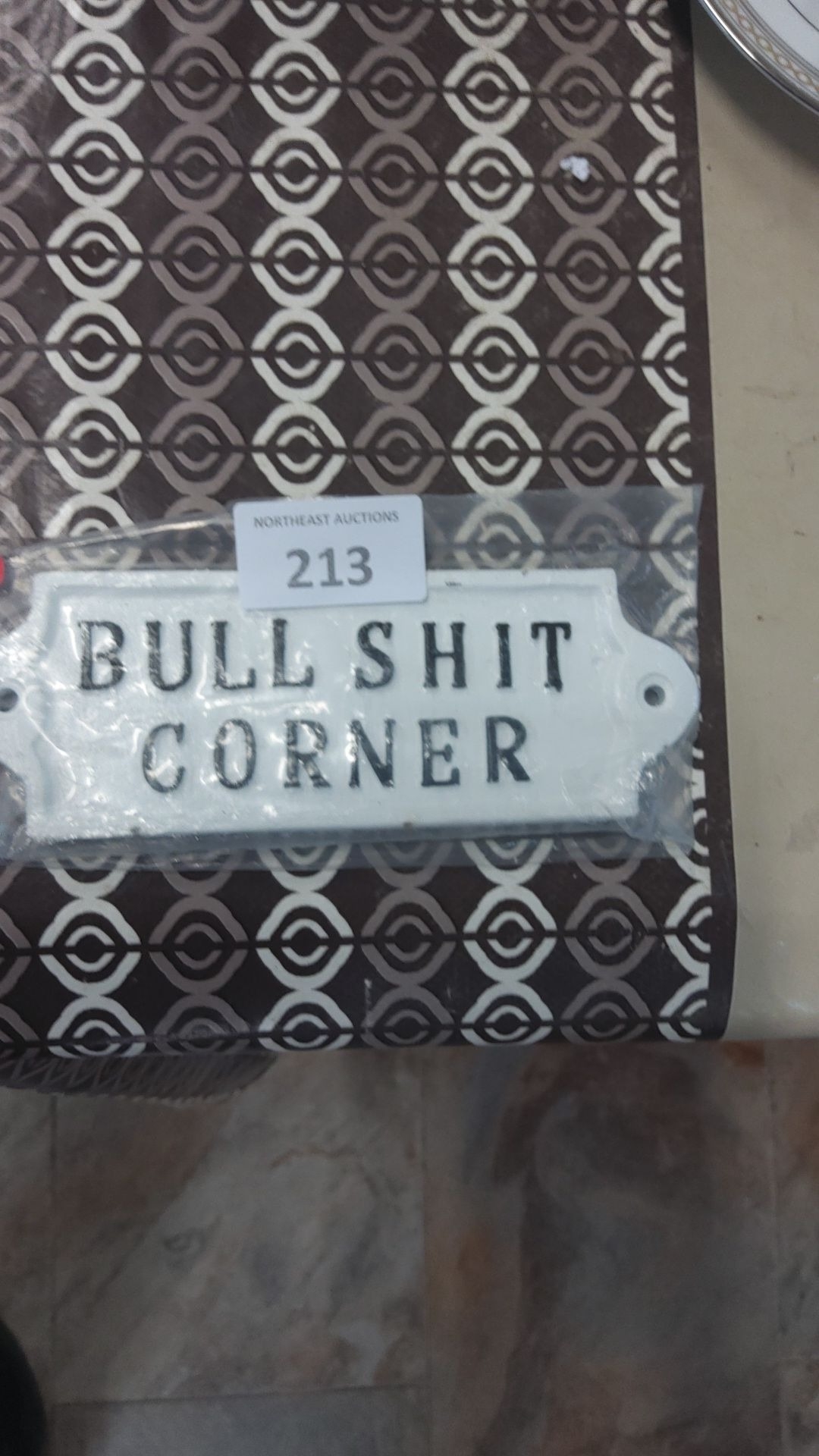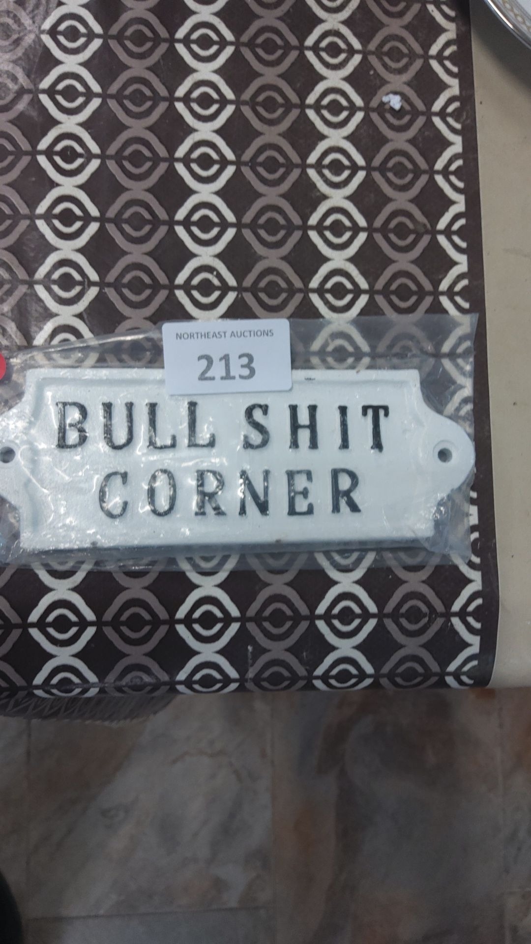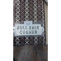 Cast iron"Bullshit Corner," has black text on a white background, with pre-drilled holes for mounting.