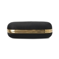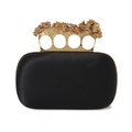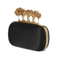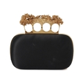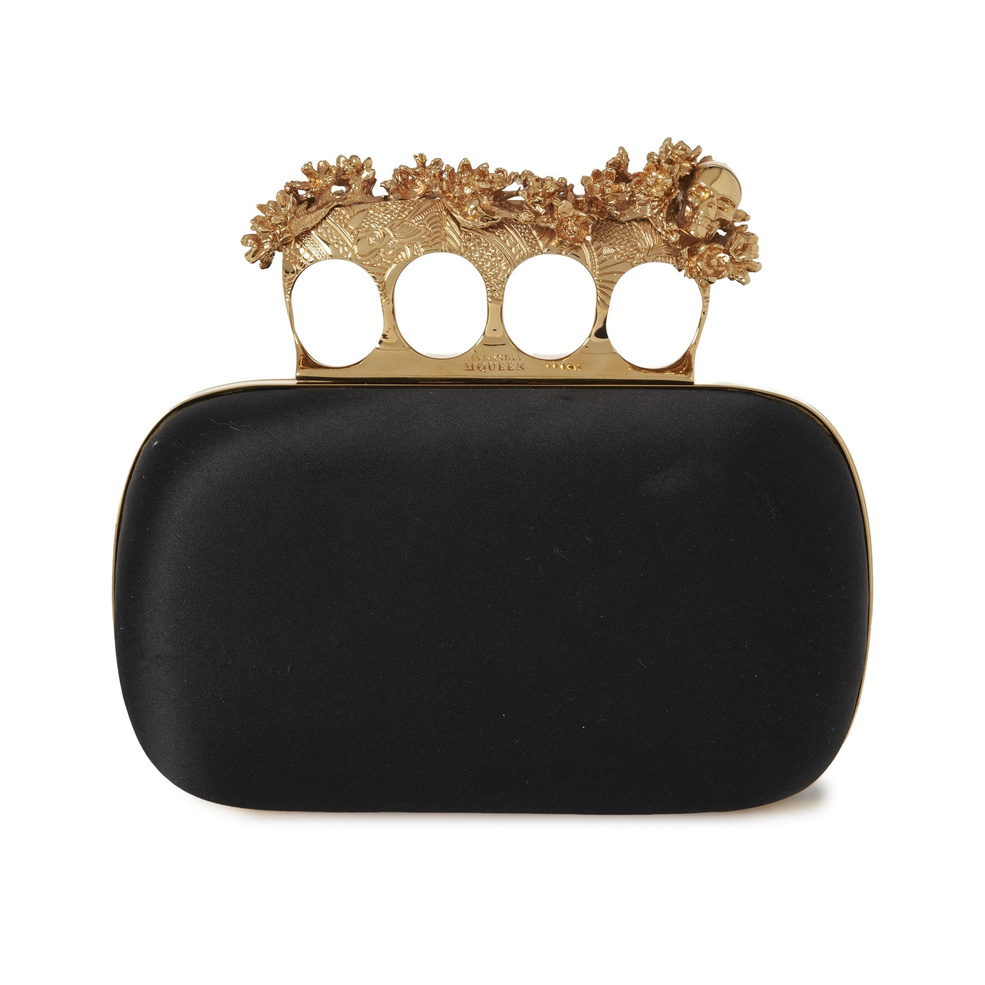 Alexander McQueen, a Knuckle Box clutch, designed with a black satin exterior, featuring a gold-tone frame with a four-ring top clasp adorned with small flowers and a skull, opening to a black leather-lined interior, measuring 5 by 13 by 15.5cm