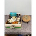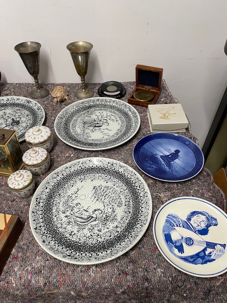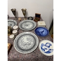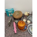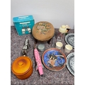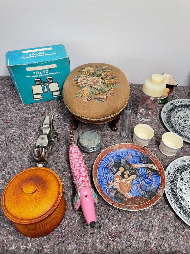 Collection of various sundry collectables inc decorative chargers , vintage footstool + others