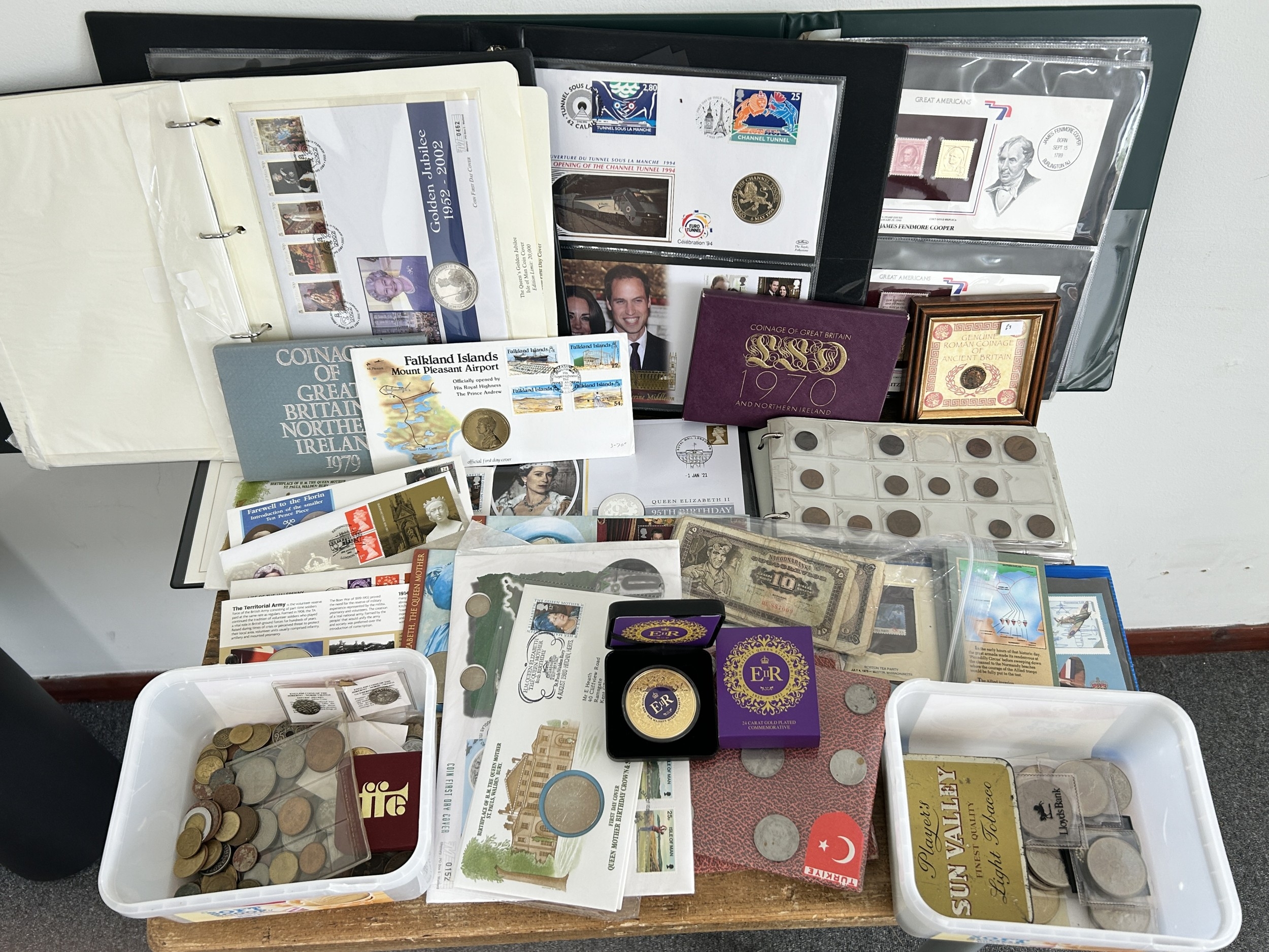 Fifty coin covers including medal, coins, ingot type coin sets, crowns and other coins