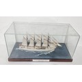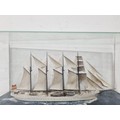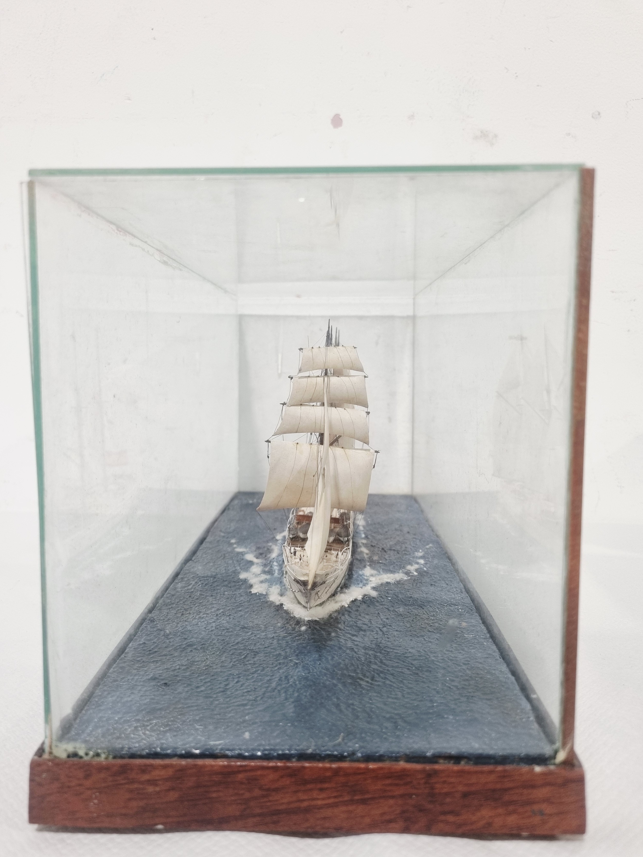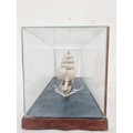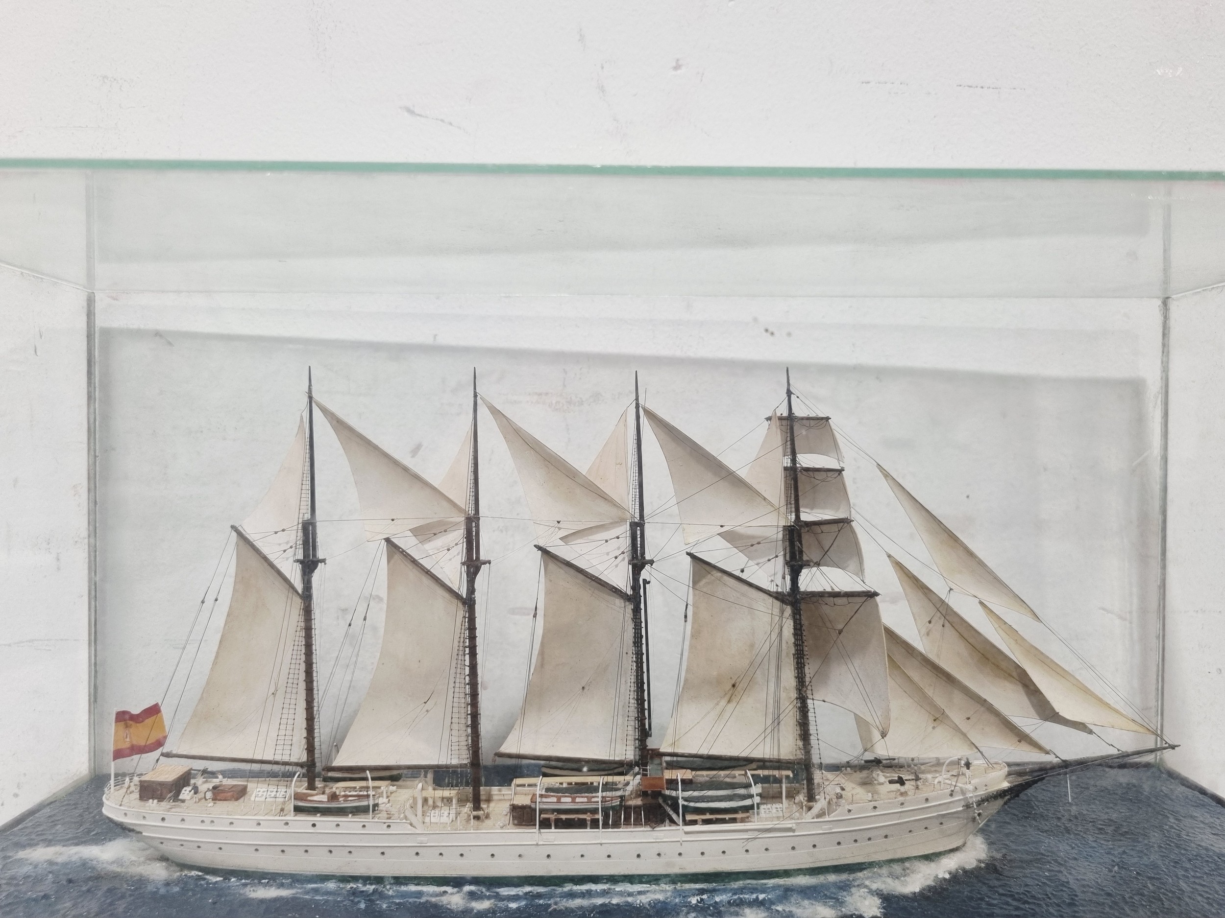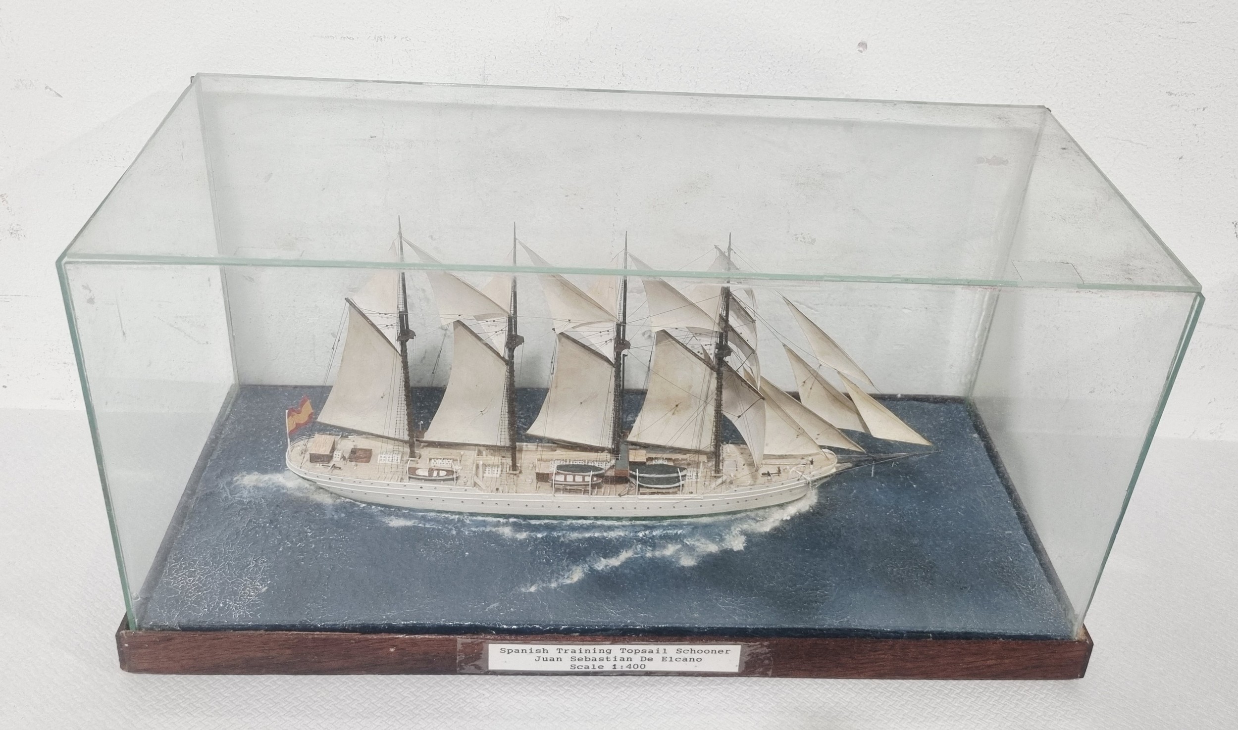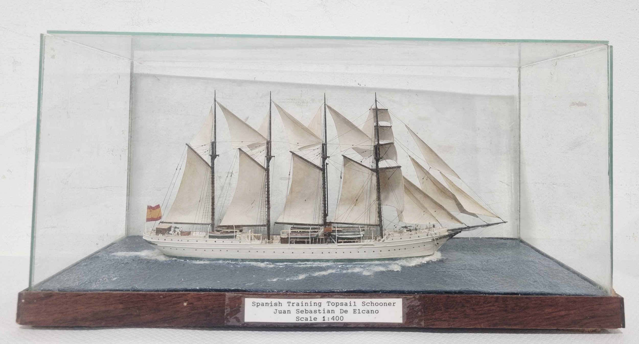 A 1:400 scale model diorama of a Spanish training topsail schooner 'Juan Sebastian De Elcano' in a glass and wood display case 35x14.5x17.5cm. No Shipping. Arrange collection or your own packer and shipper, please.